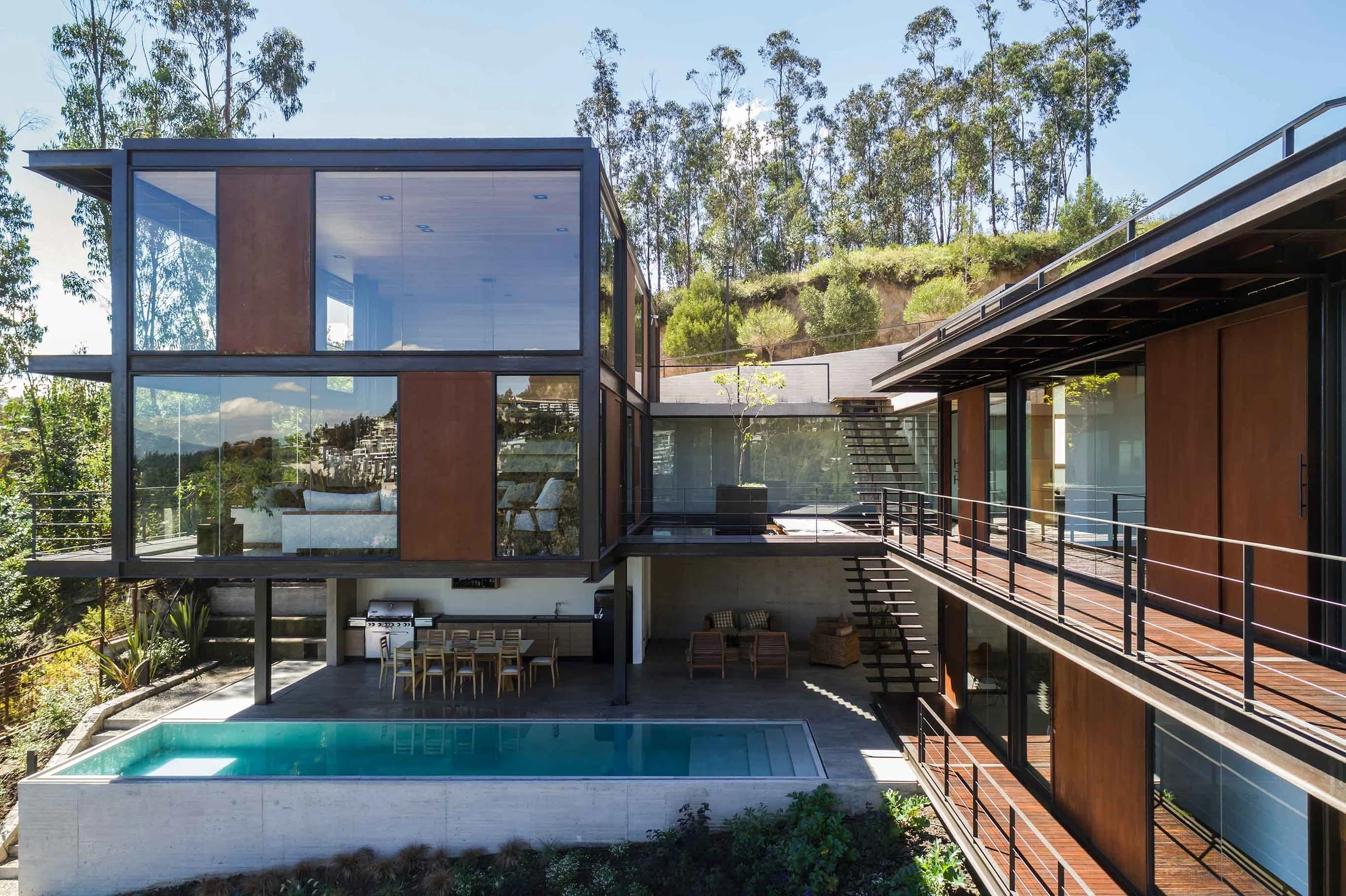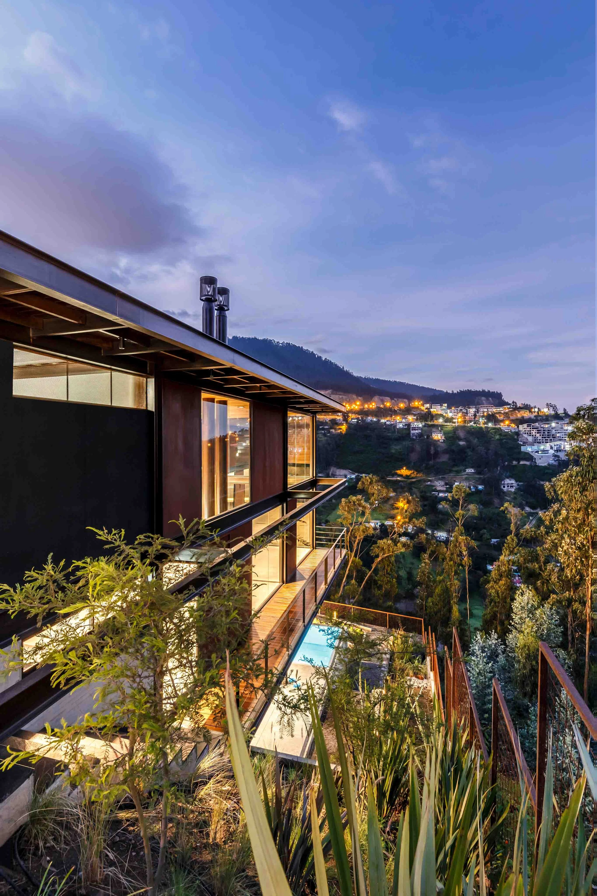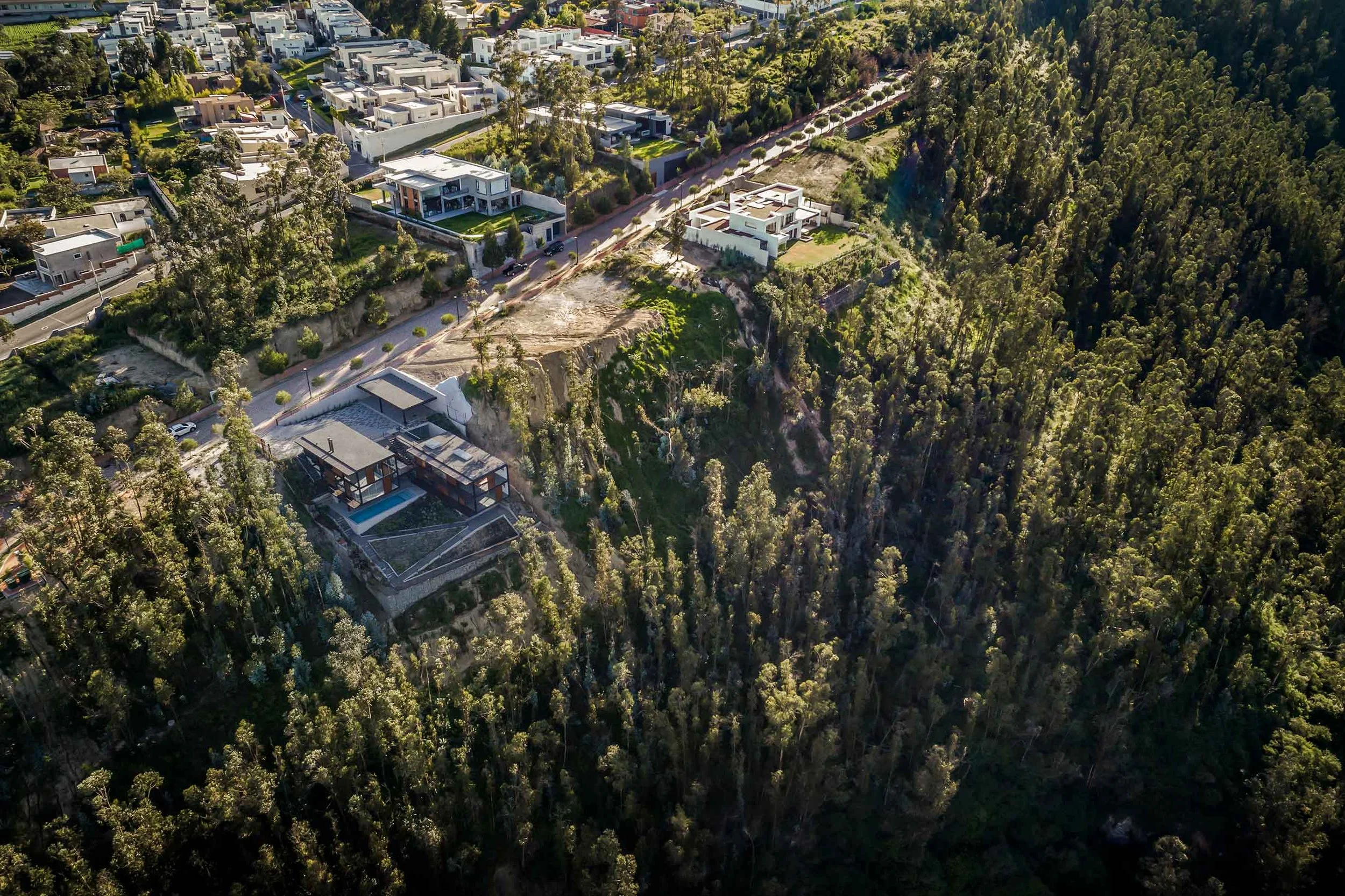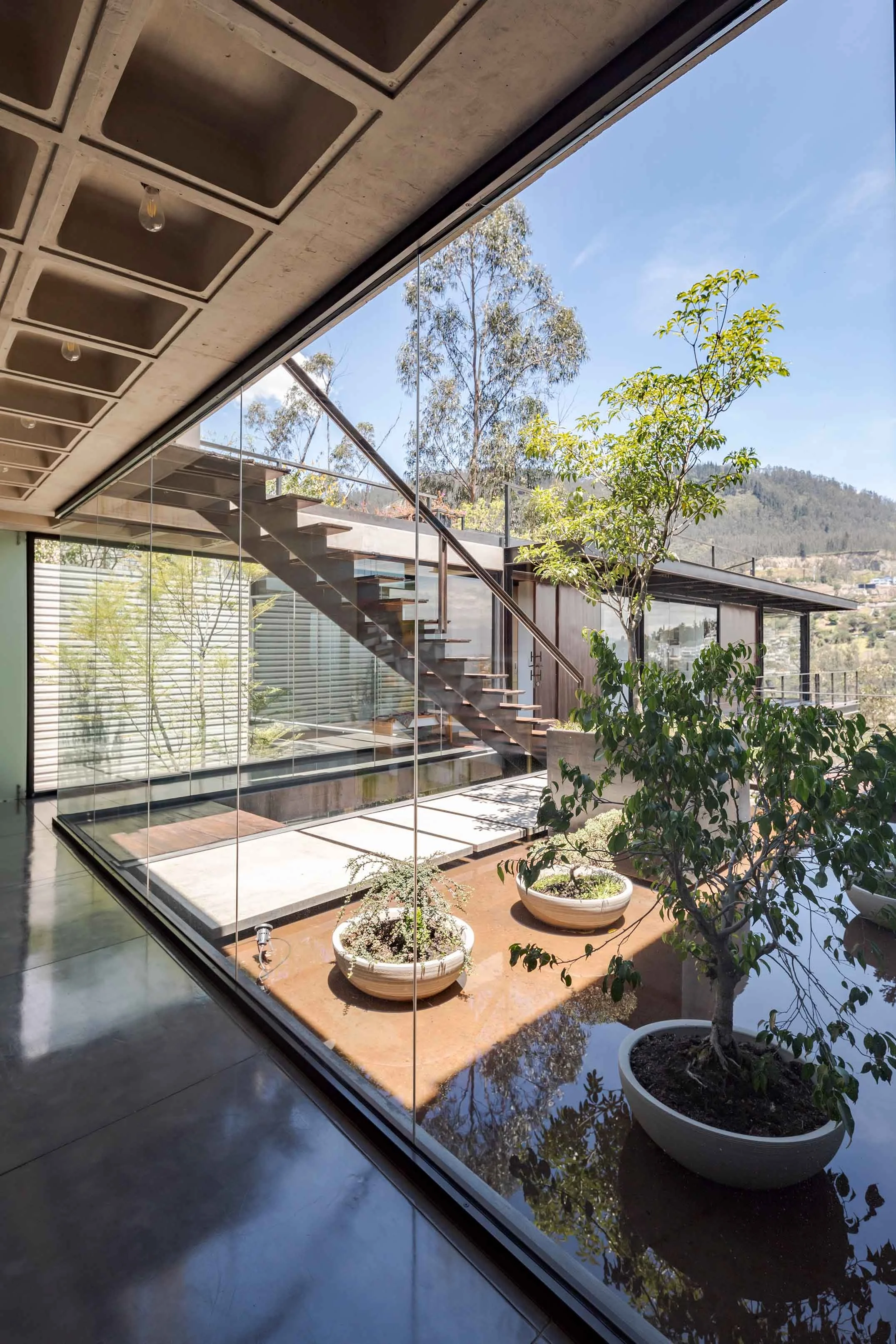 The house is located on a plot with a 44% slope, between Quito and the Cumbayá Valley. Instead of modifying the topography, the project works with it: it is built from the cut. Three levels structure the sequence of spaces. The first, at street level, marks the threshold between the public and the domestic, under the shade of two ceibo trees and a guayacán. The second, articulated by the courtyard, defines the main entrance and opens toward the view. A mirror of water reflects the sky and marks the passage of time. On one side is the social volume, with double height; on the other, the more intimate one, with the bedrooms. The lower level, partially excavated, connects to the garden and recalls the logic of the Andean ravines: its atmosphere, its temperature, and its shadow.