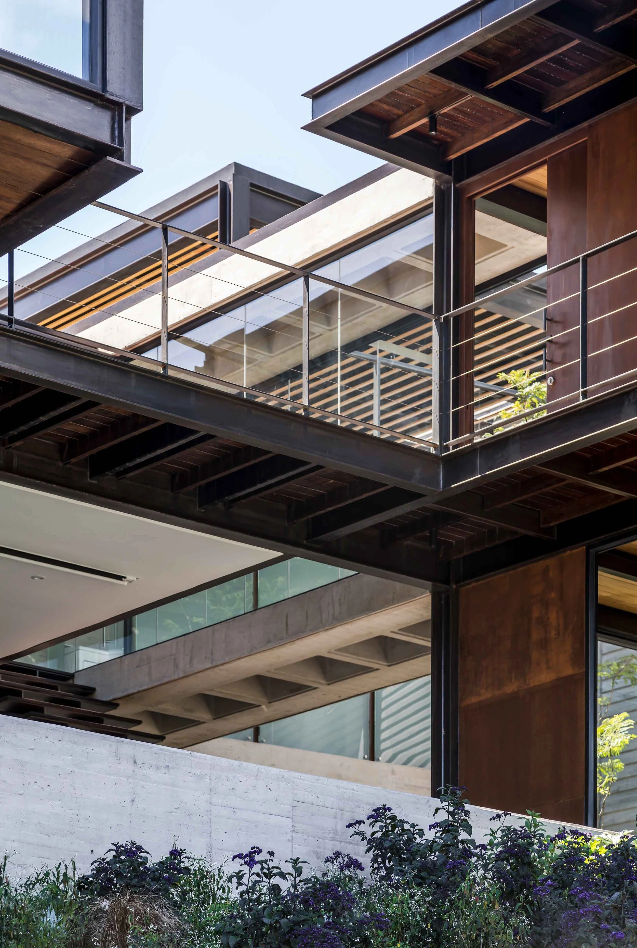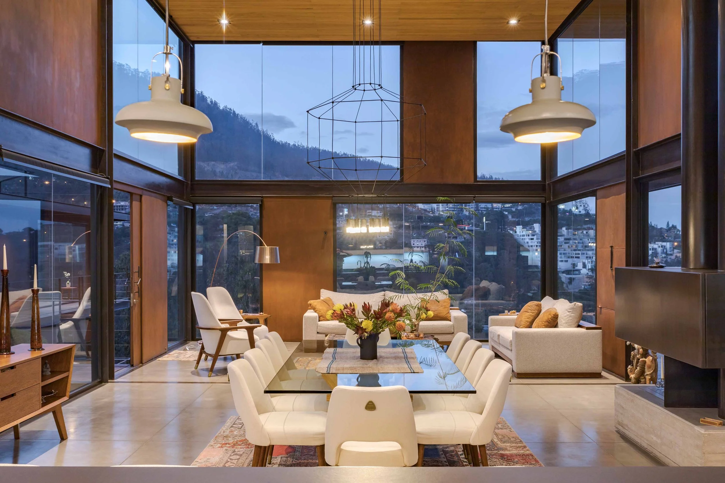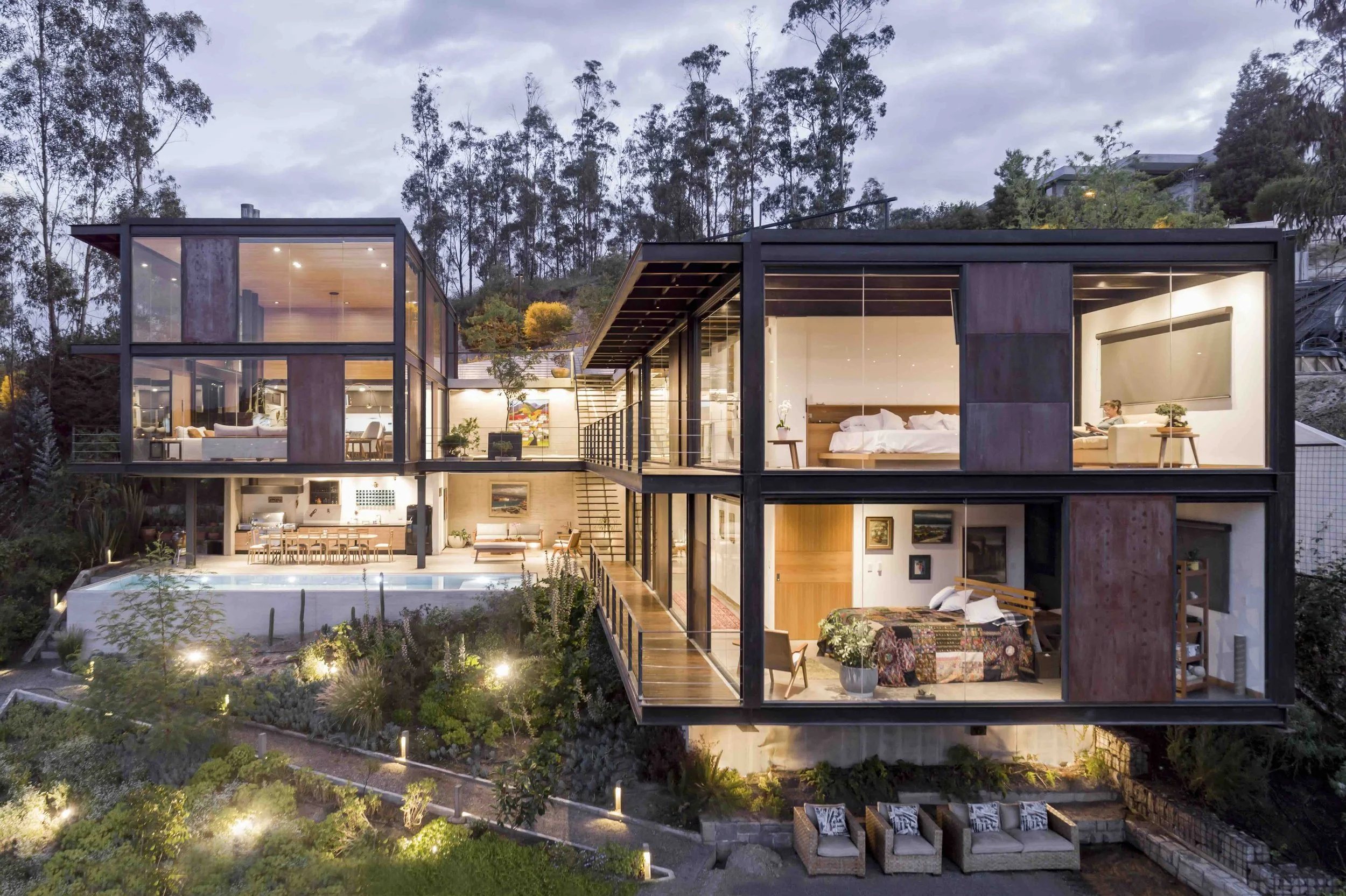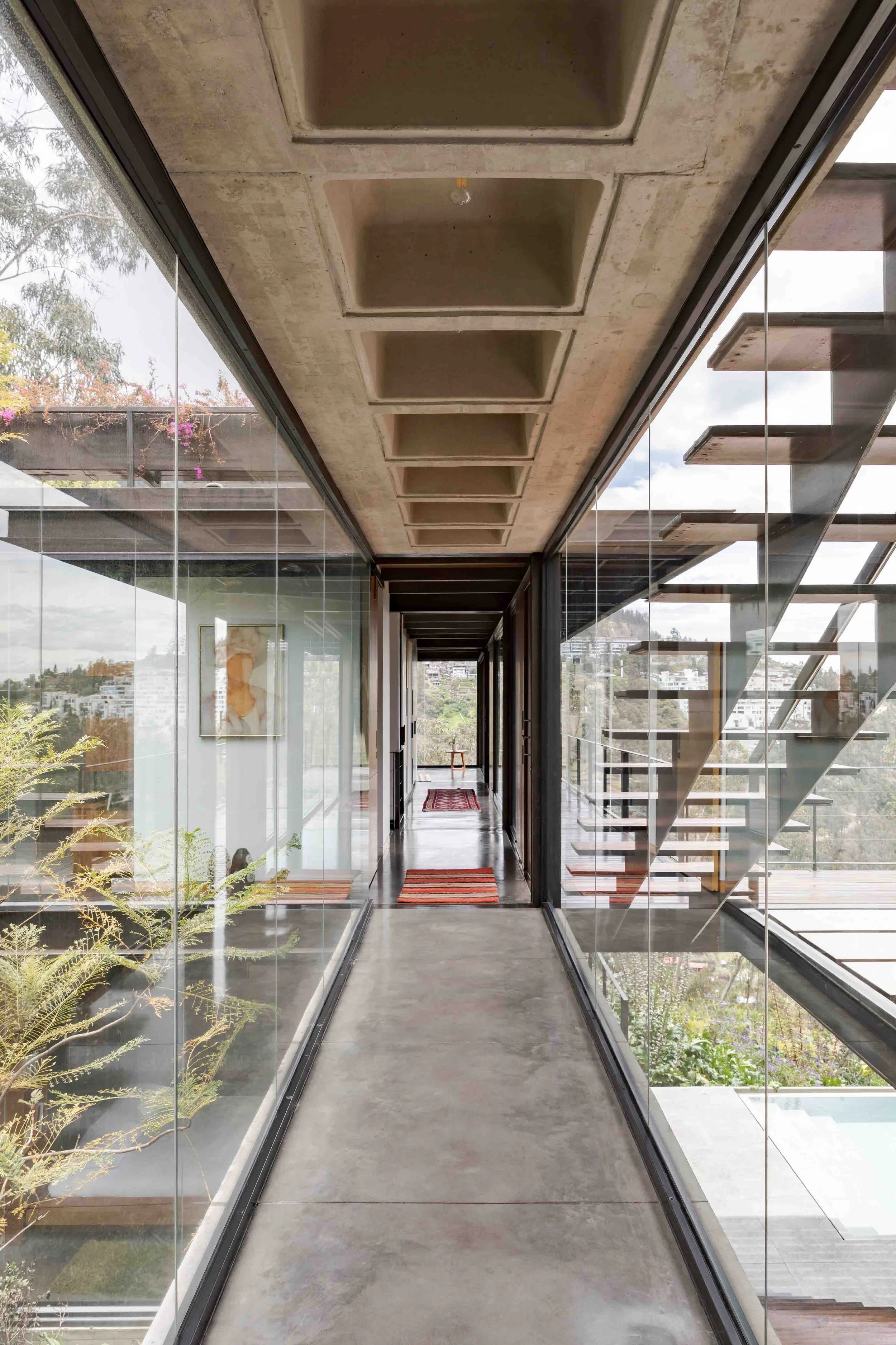 The house is located on a plot with a 44% slope, between Quito and the Cumbayá Valley. Instead of modifying the topography, the project works with it: it is built from the cut. Three levels structure the sequence of spaces. The first, at street level, marks the threshold between the public and the domestic, under the shade of two ceibo trees and a guayacán. The second, articulated by the courtyard, defines the main entrance and opens toward the view. A mirror of water reflects the sky and marks the passage of time. On one side is the social volume, with double height; on the other, the more intimate one, with the bedrooms. The lower level, partially excavated, connects to the garden and recalls the logic of the Andean ravines: its atmosphere, its temperature, and its shadow.