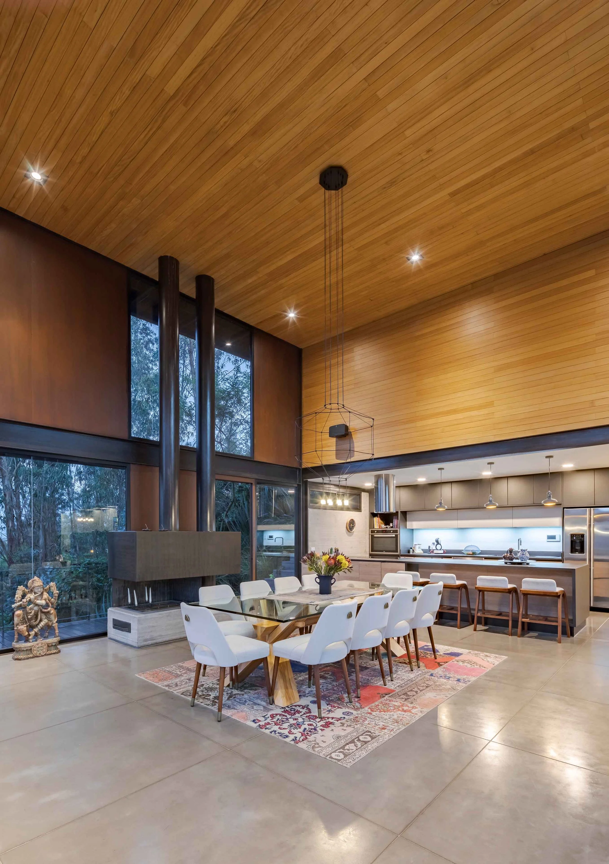 The garden is not a scenic backdrop: it is part of the project. The original terrain was occupied by a eucalyptus forest planted in the 19th century as a productive monoculture. It was decided to clear it completely and plant more than 300 native Andean species. This operation transformed the site into an island of biodiversity. Throughout the year, the garden changes in color, humidity, and inhabitants. The architecture responds to these changes without imposing itself.