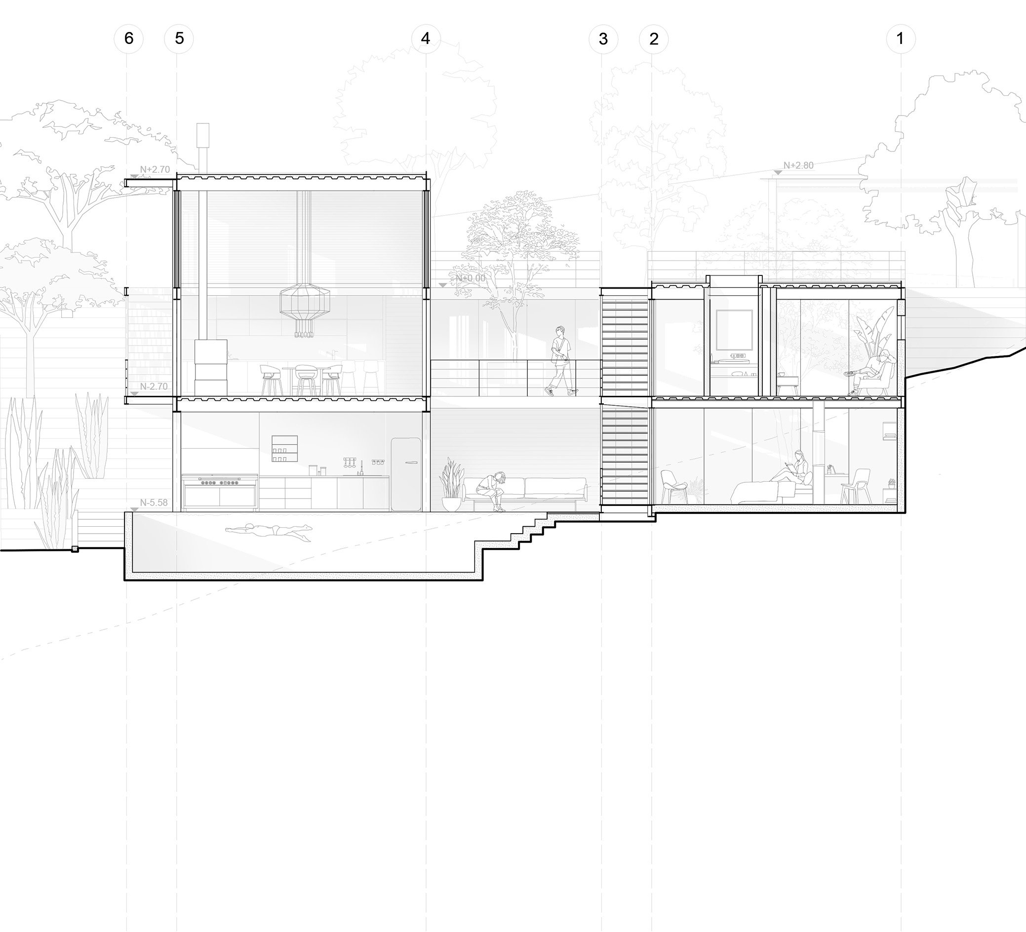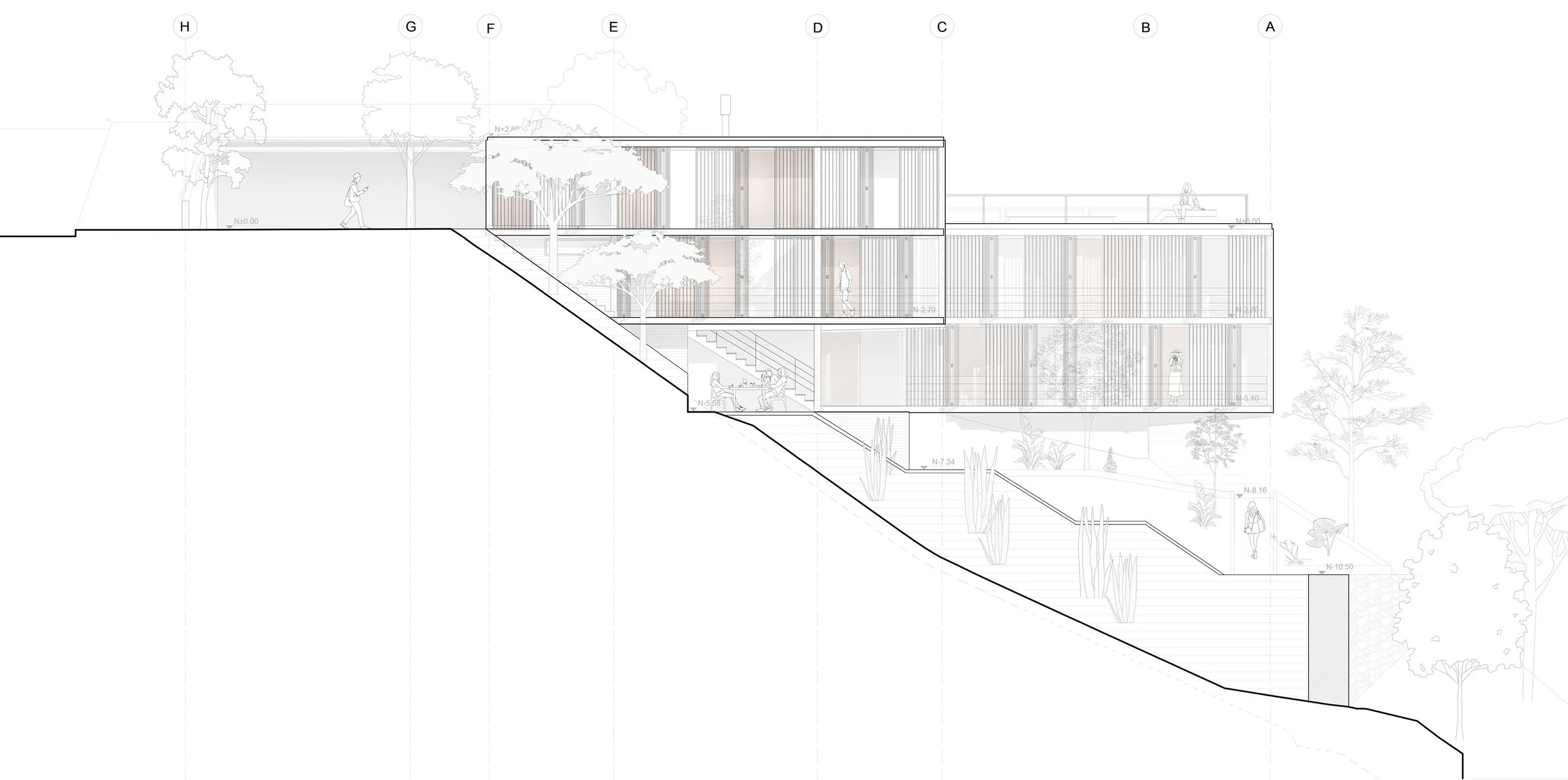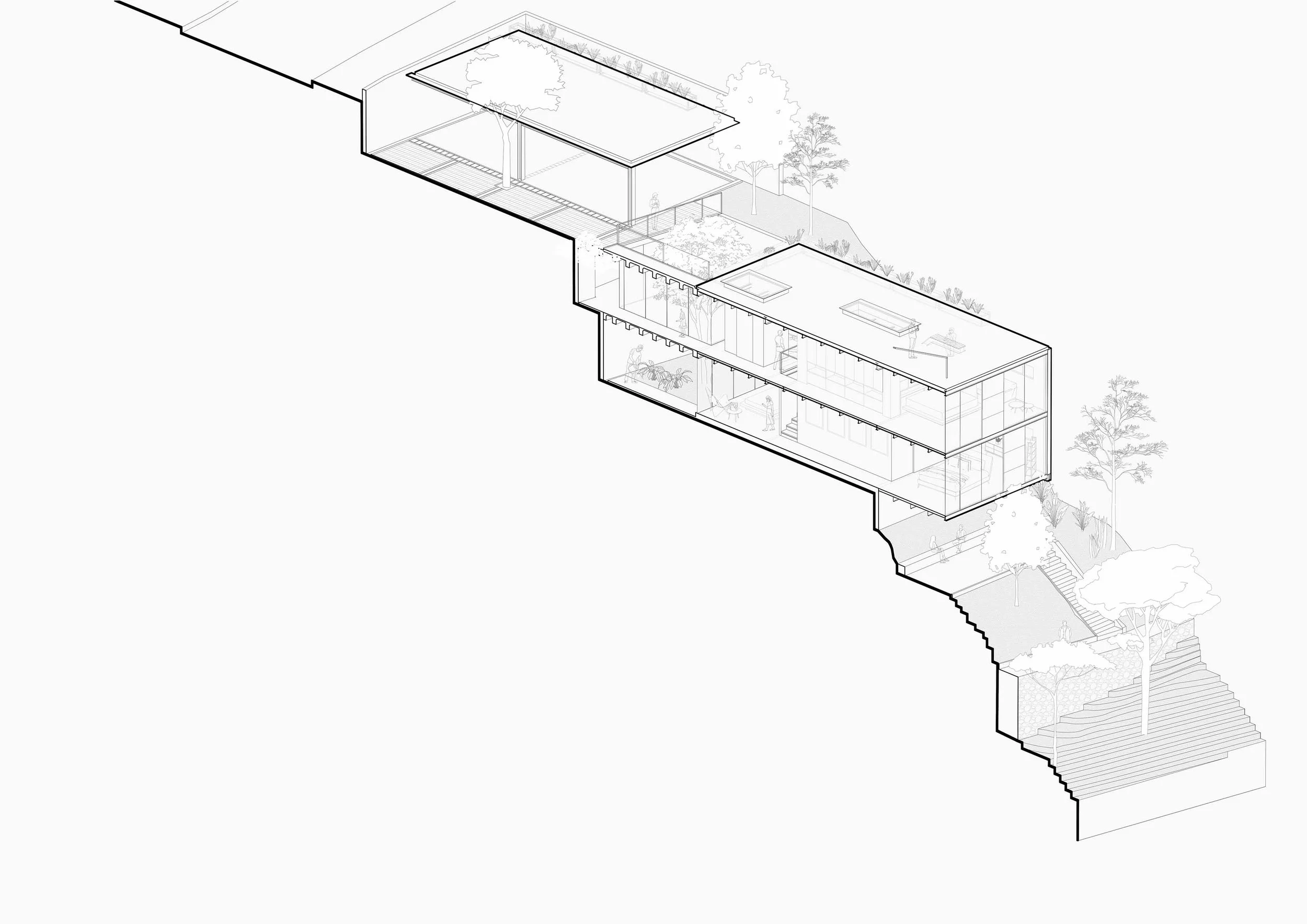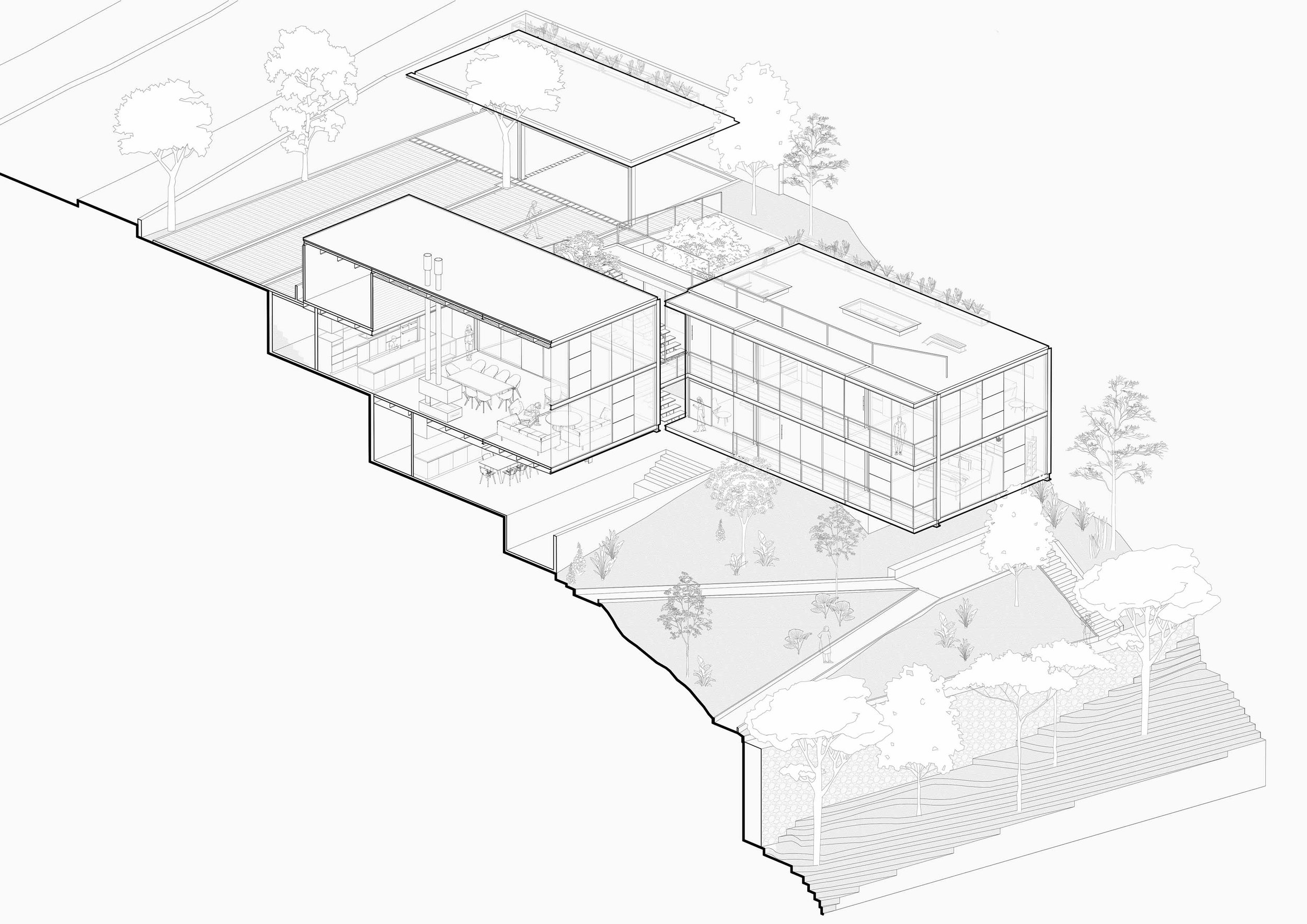 BUCA is built on three operations that define its conceptual and material structure: the reinterpretation of the binuclear typology, working with topography as the basis for the project, and the recovery of the native garden.