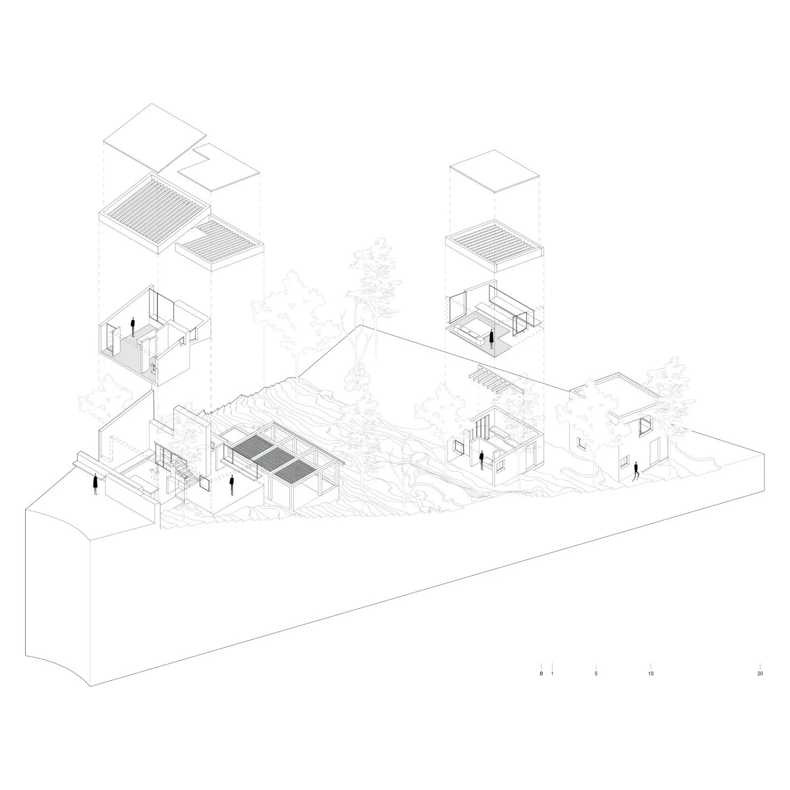 The main volume of the house, conceived as the union of two cubes, is single, compact, and essential, minimizing its environmental impact on the site. All existing vegetation is preserved, while local materials—such as stone quarried on site and bricks—establish a vernacular identity attuned to the context. Within these two volumes, the kitchen-dining area, bathrooms, and master bedroom are arranged across split levels.