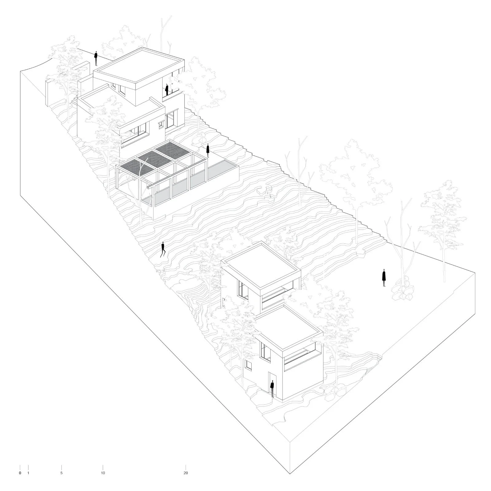 Designed for a woman seeking a quieter stage of life and a deep connection with nature, the house incorporates an independent space intended for her two adult children. Both volumes are articulated through a shared architectural language and material palette, forming a composition that is both harmonious and precise.