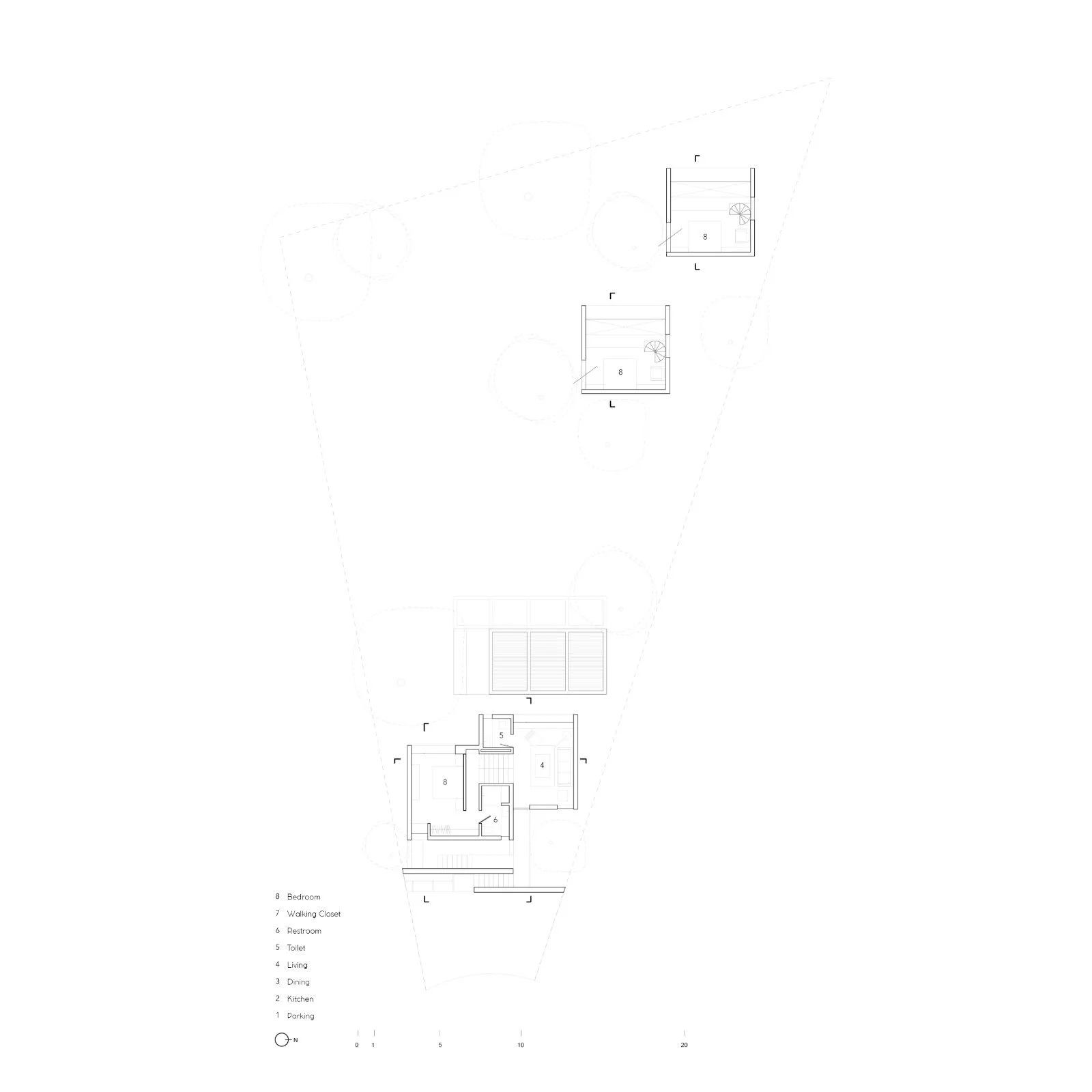 A short distance away, an independent bungalow provides accommodation for the adult children, balancing the privacy and closeness required without disturbing the serene, retreat-like atmosphere of the property. Within this volume, a double-height space houses a small living area and kitchenette, while the second level contains a bedroom.