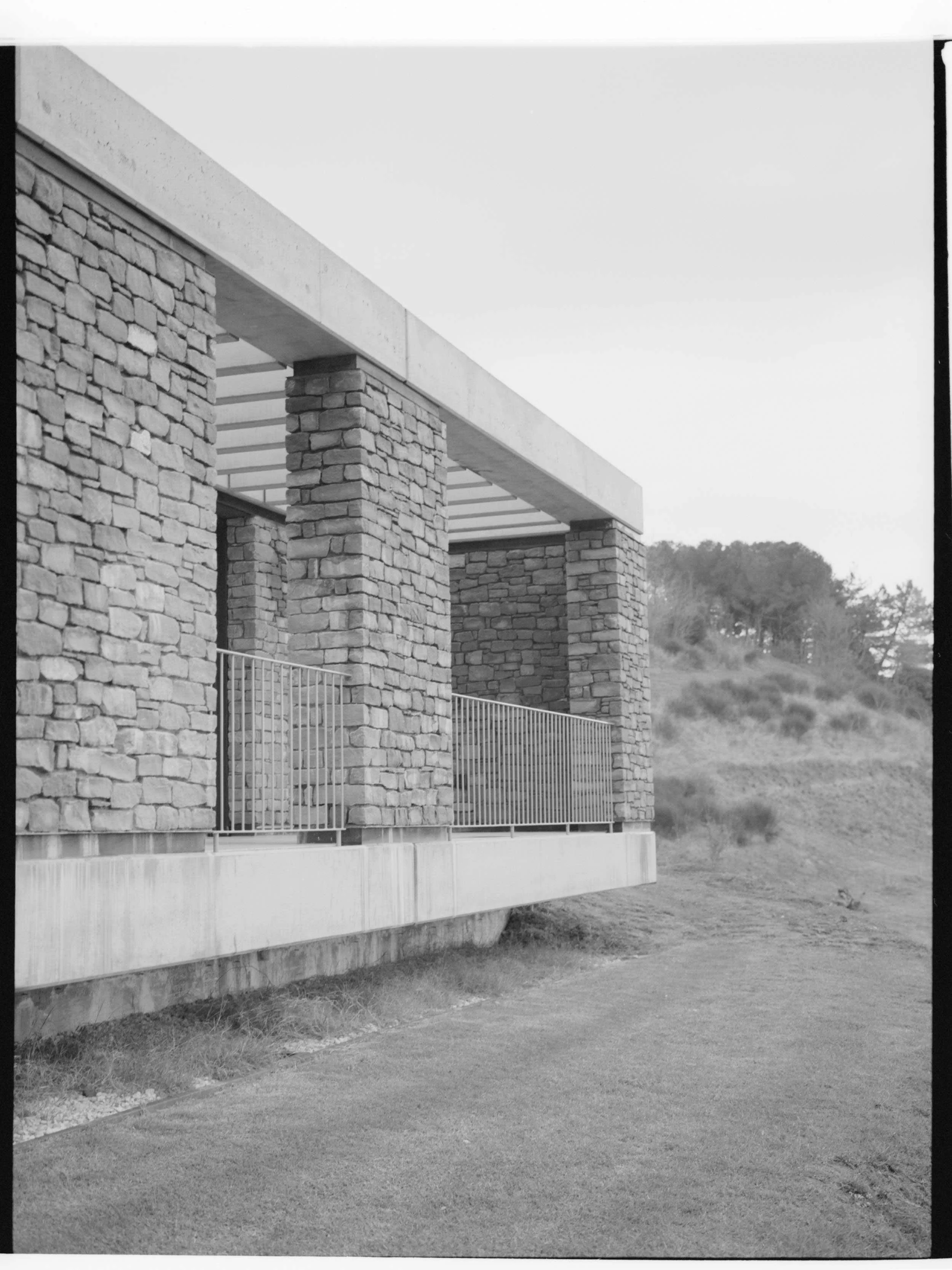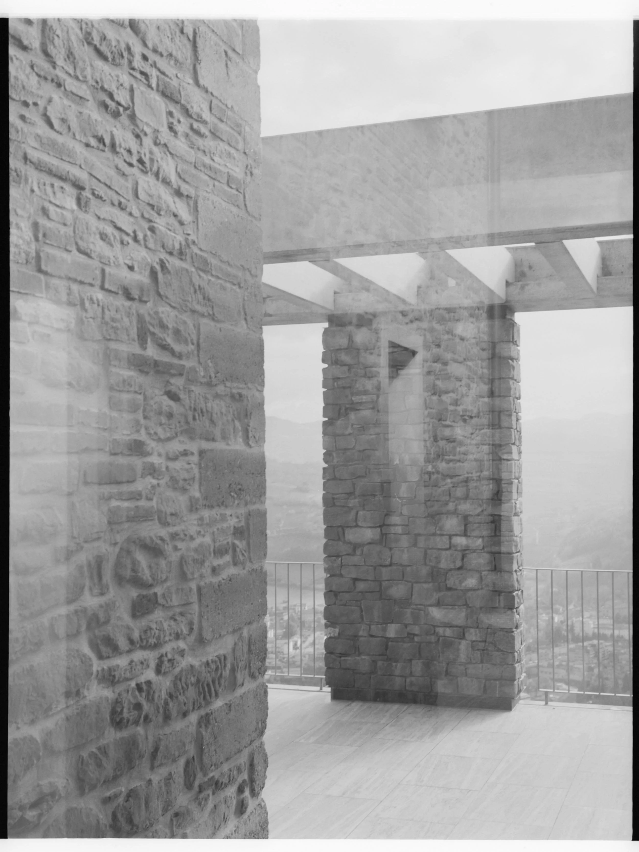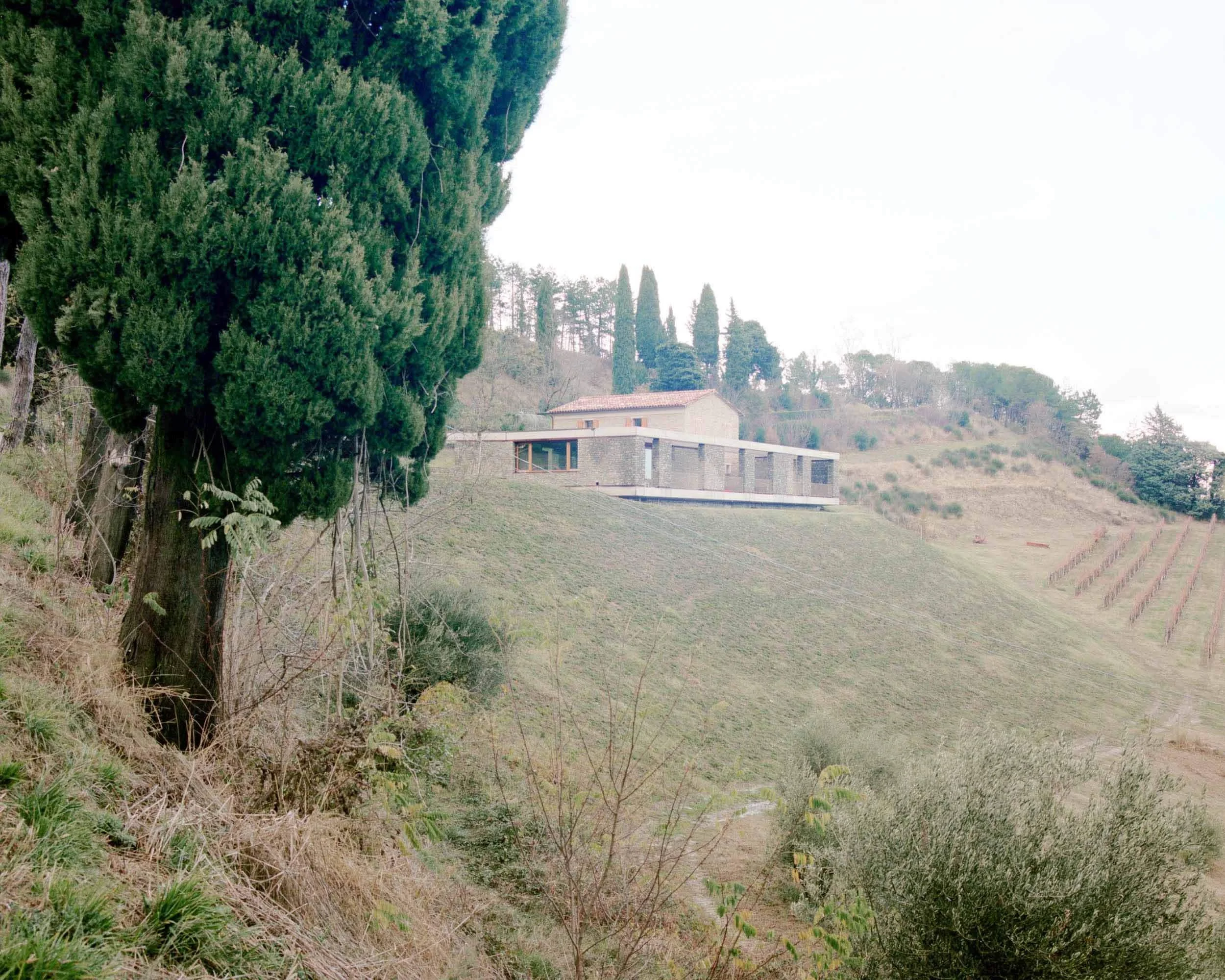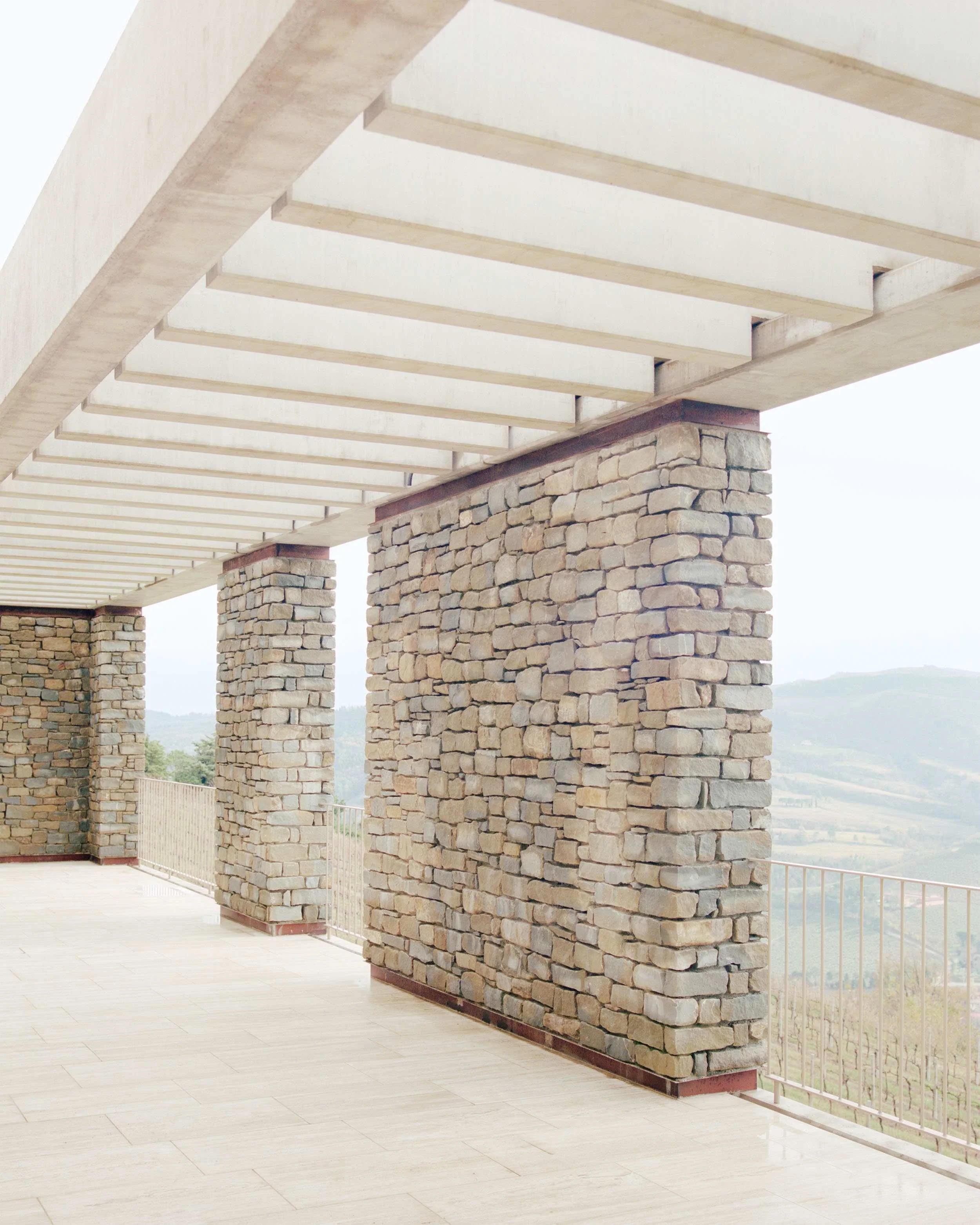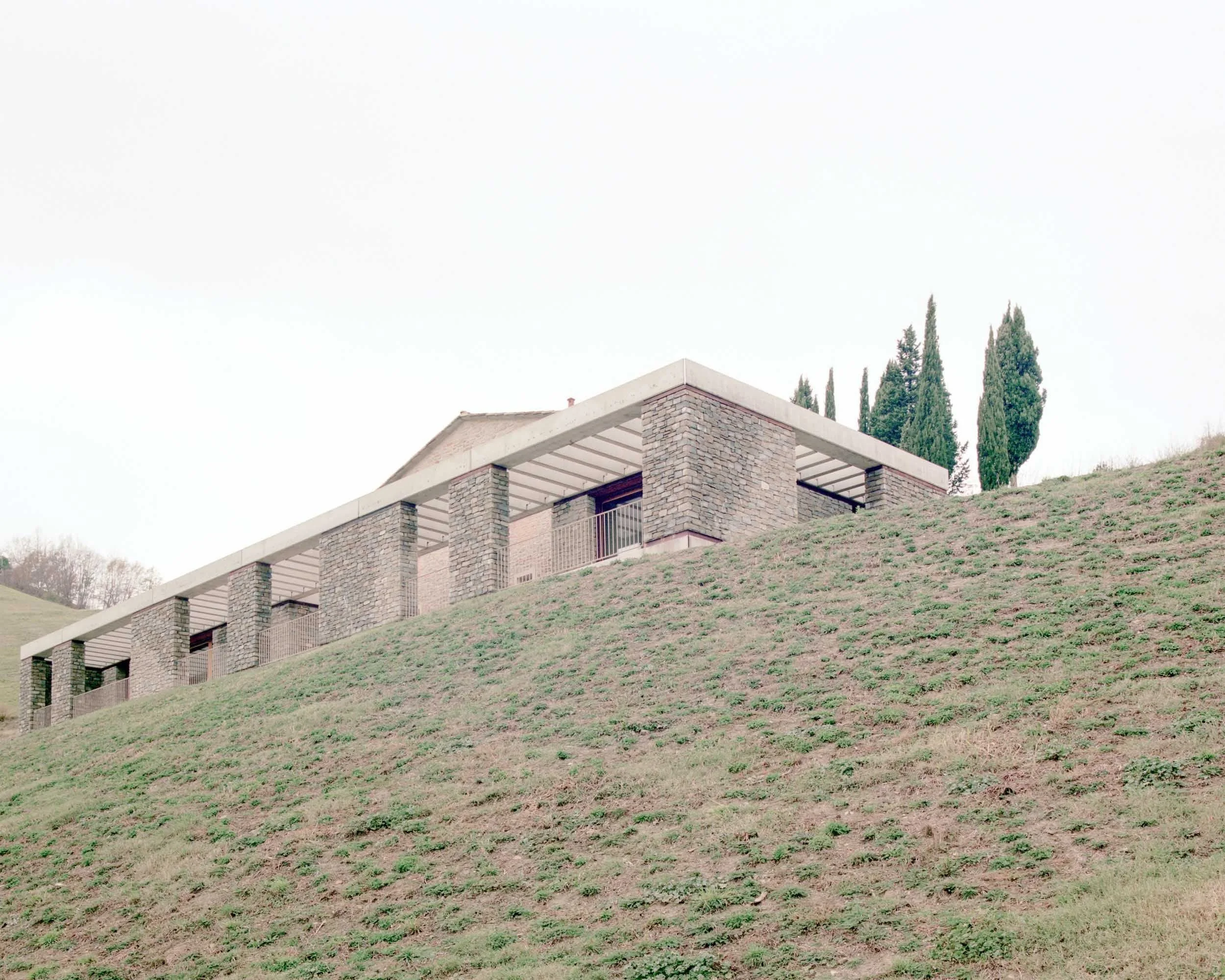 The extension stretches along the slope as a linear base, clad in stone, echoing the materiality and scale of the existing fabric while introducing a more abstract and controlled architectural language. A system of masonry piers and porticoes defines a rhythmic sequence of solids and voids, where light and landscape become active elements of the project. Large openings frame the valley, transforming the façade into a continuous visual device that mediates the relationship between interior and exterior.