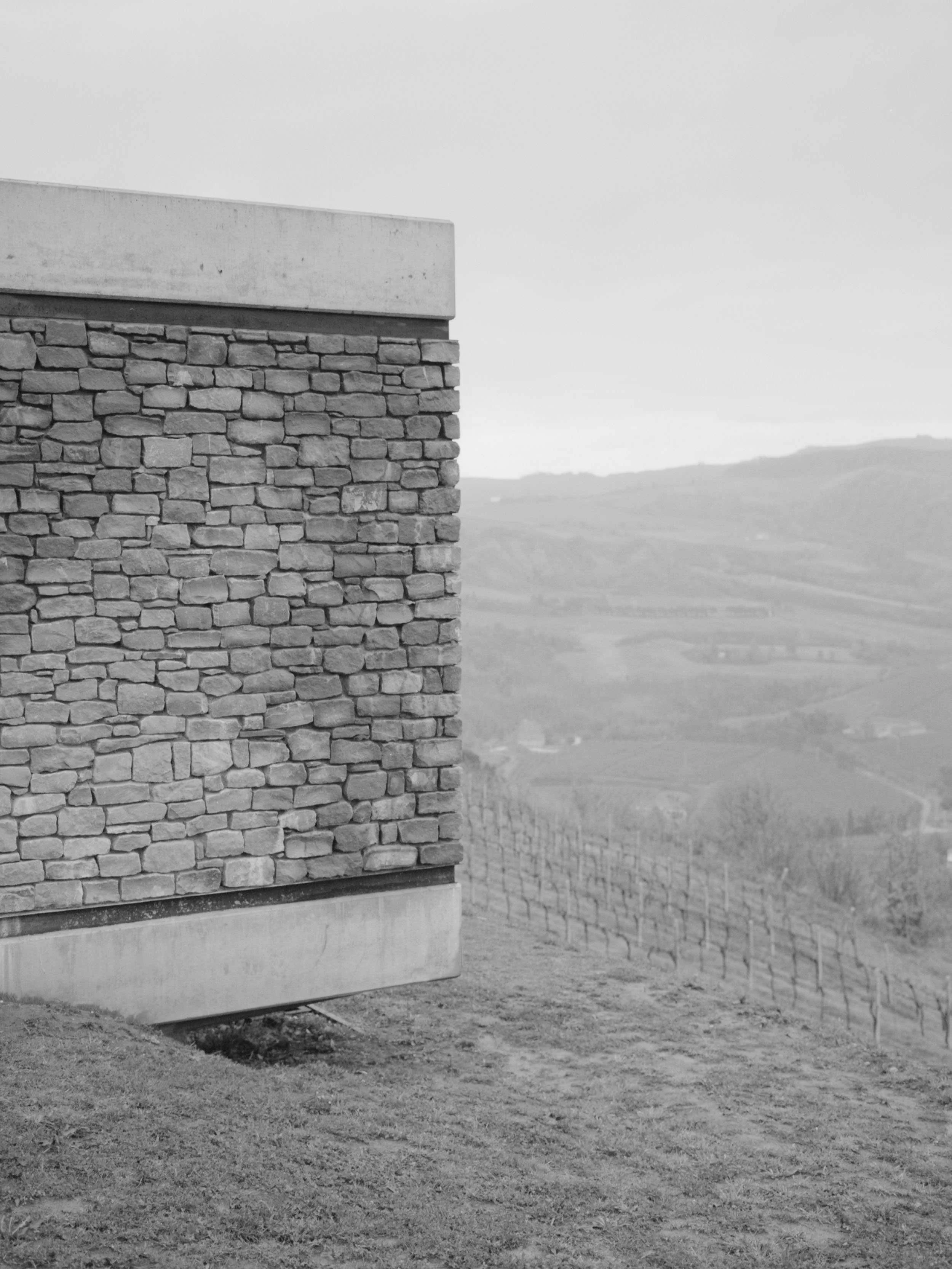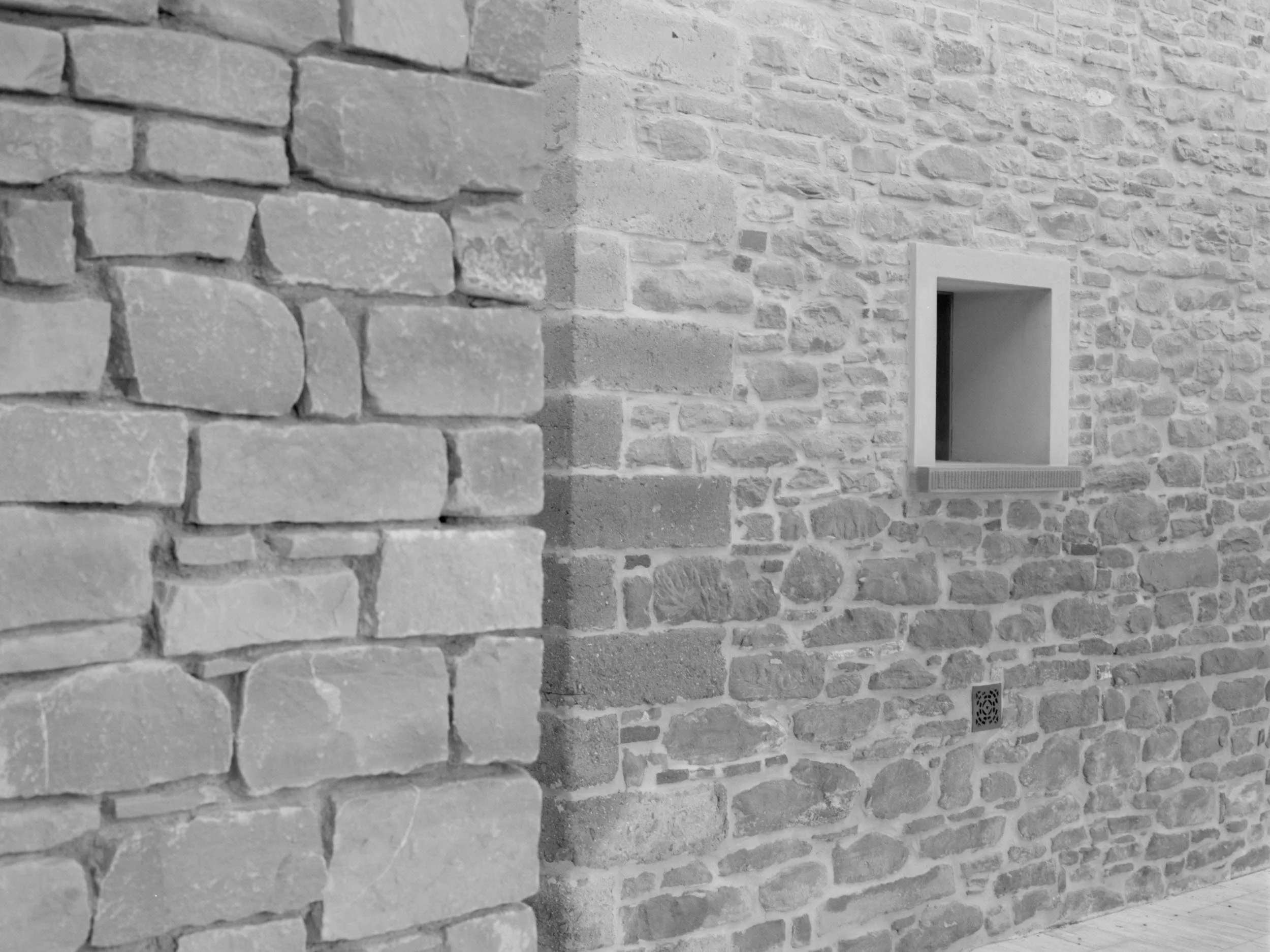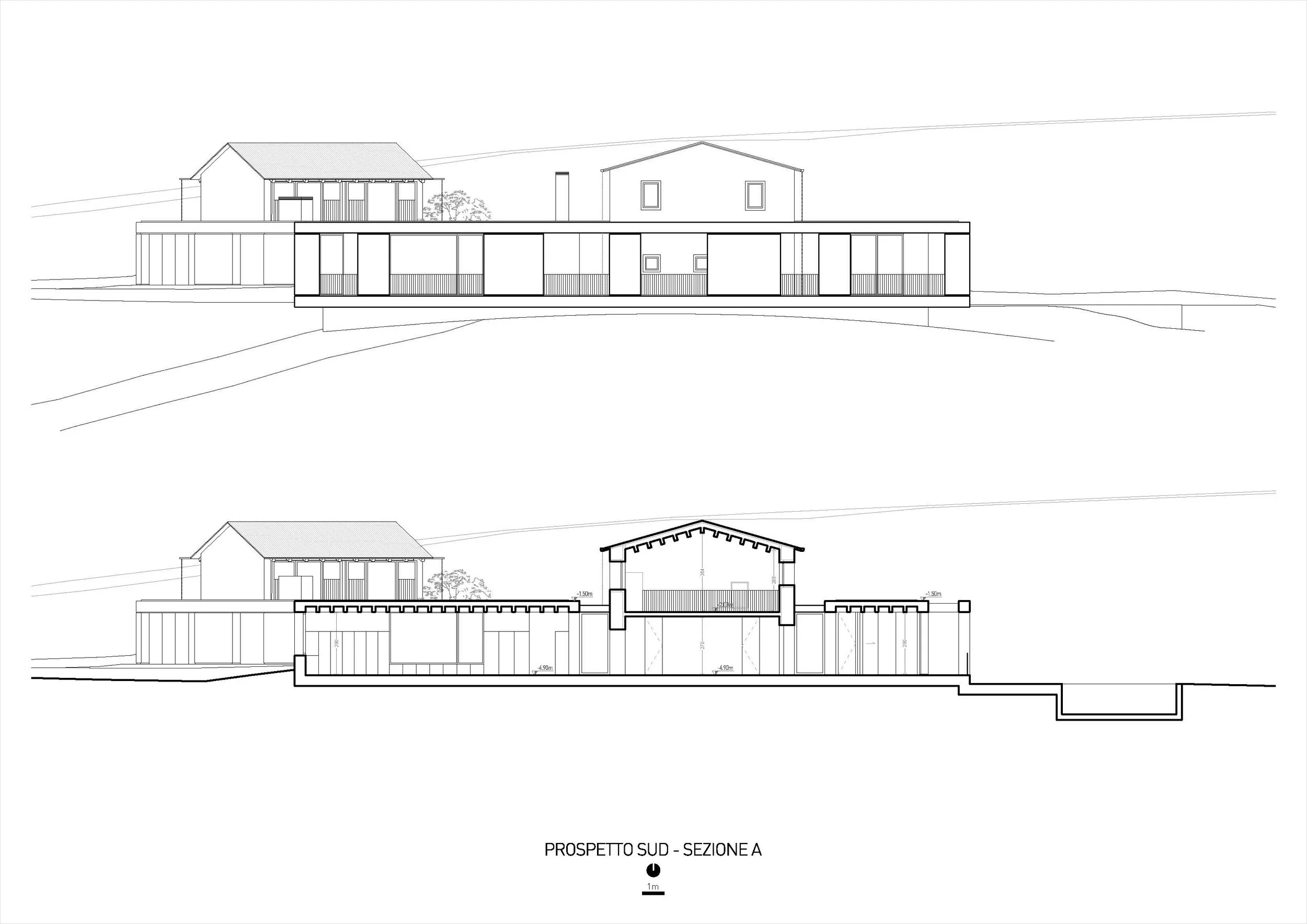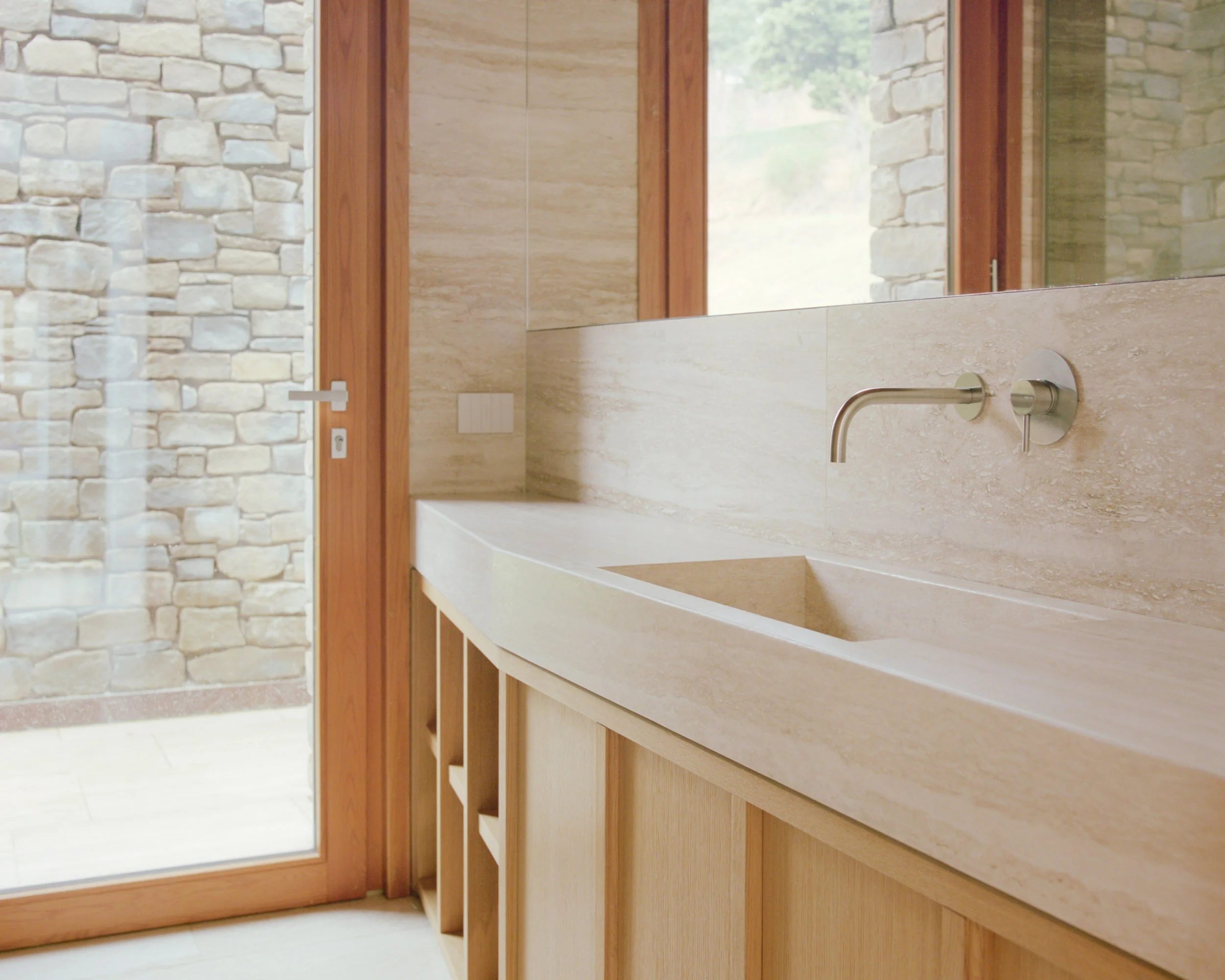 The extension stretches along the slope as a linear base, clad in stone, echoing the materiality and scale of the existing fabric while introducing a more abstract and controlled architectural language. A system of masonry piers and porticoes defines a rhythmic sequence of solids and voids, where light and landscape become active elements of the project. Large openings frame the valley, transforming the façade into a continuous visual device that mediates the relationship between interior and exterior.