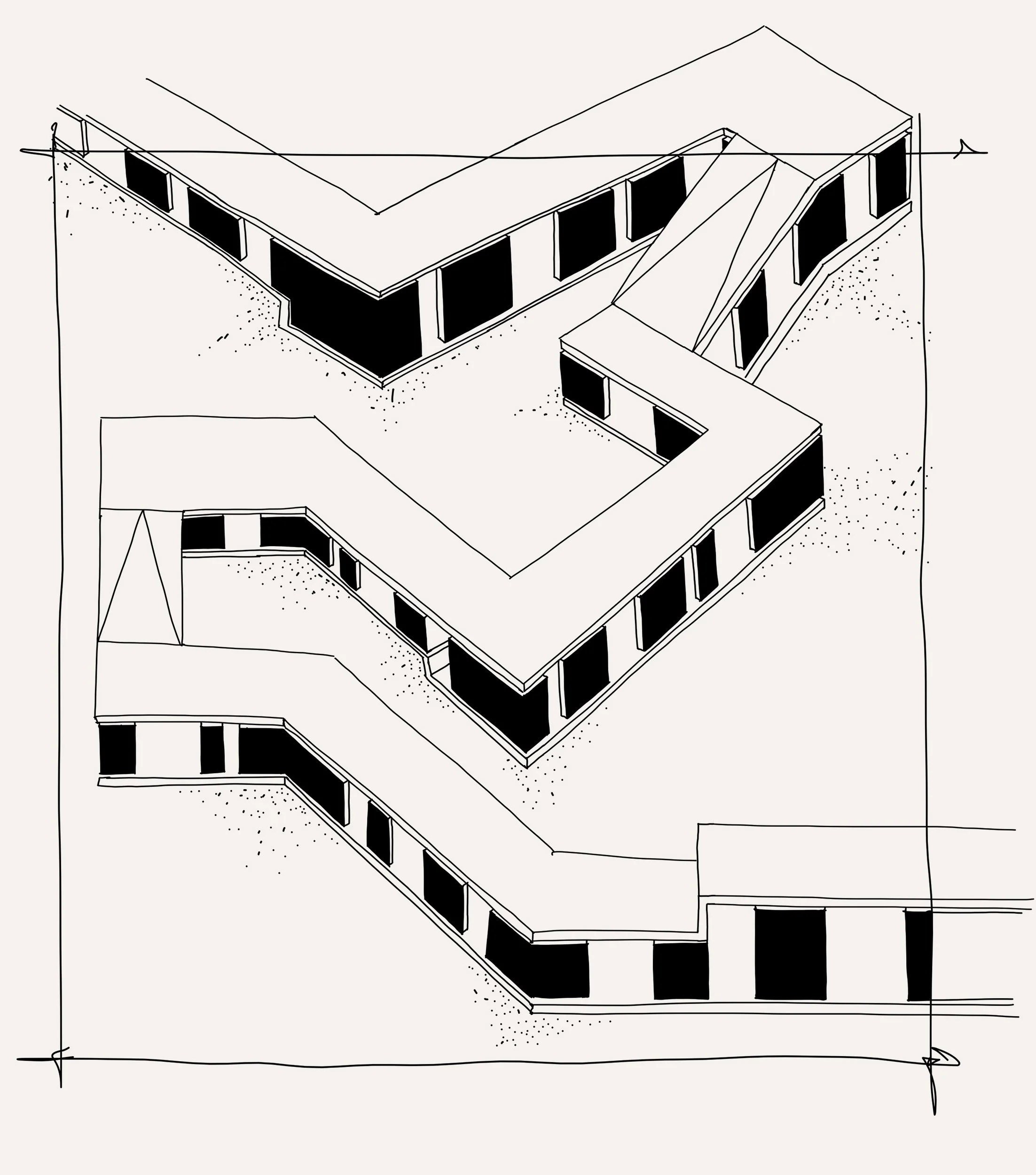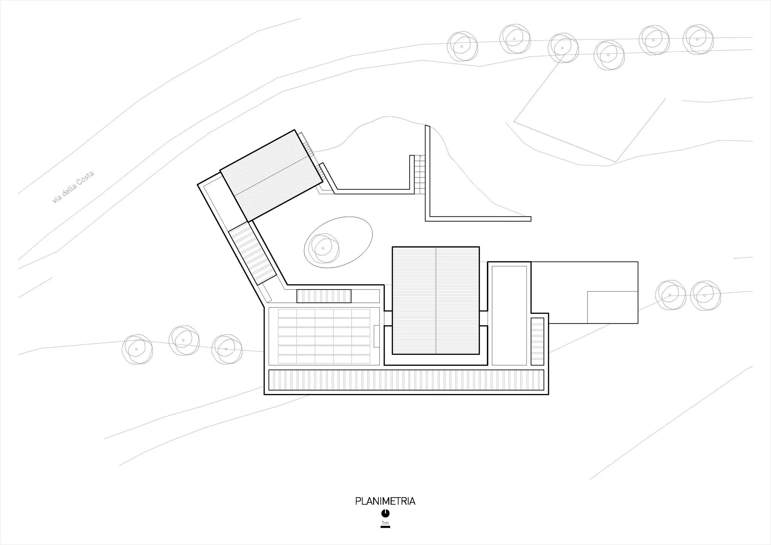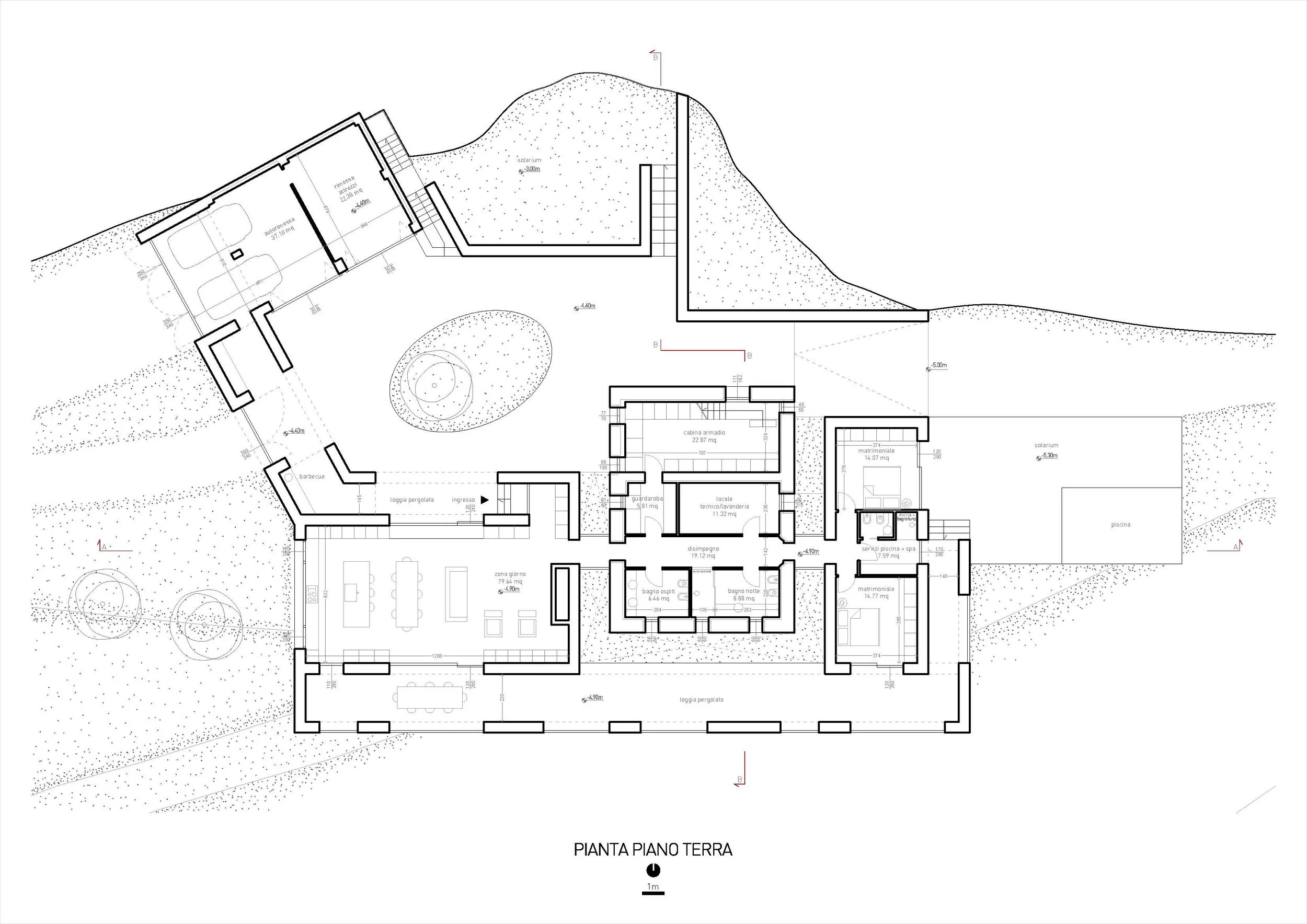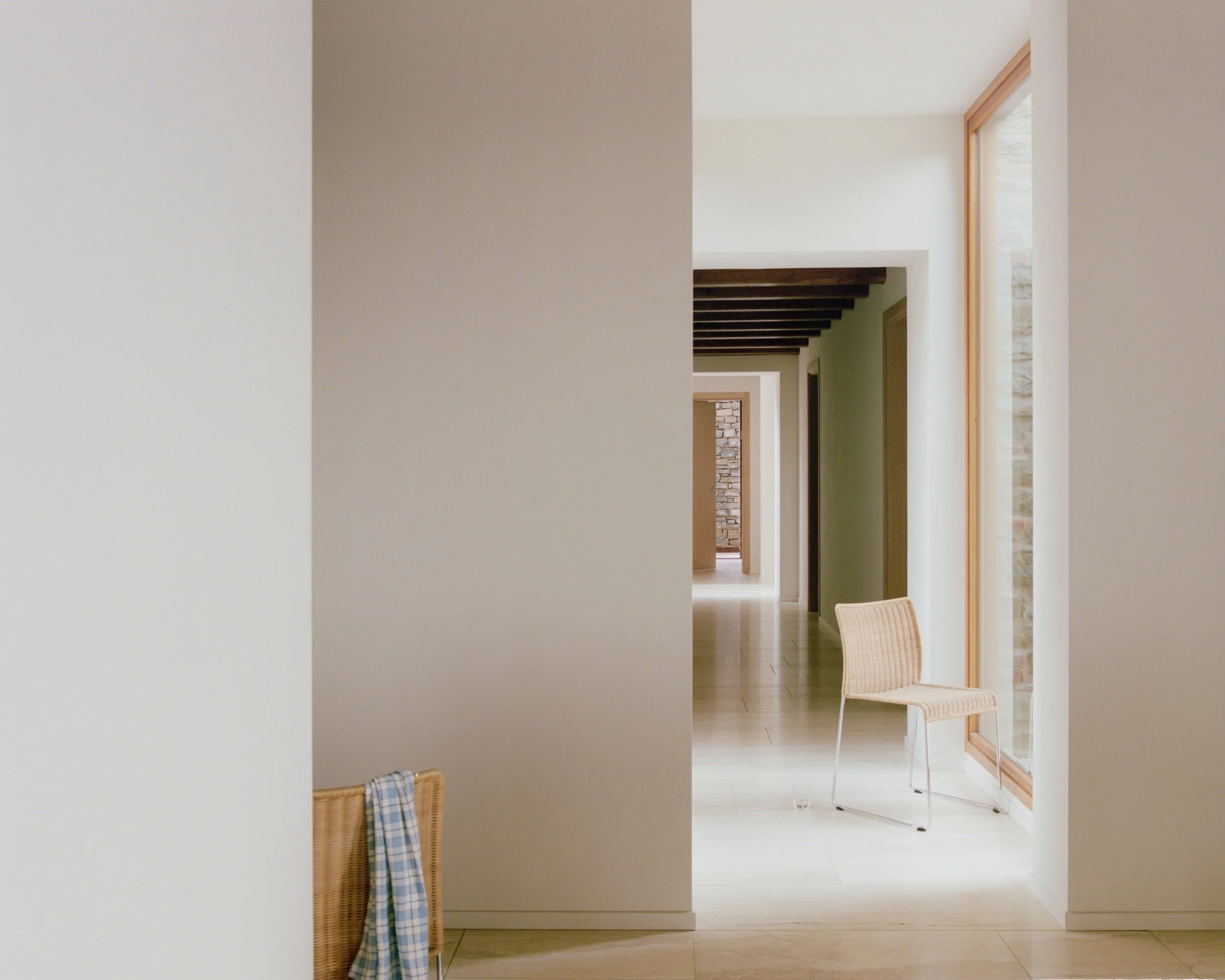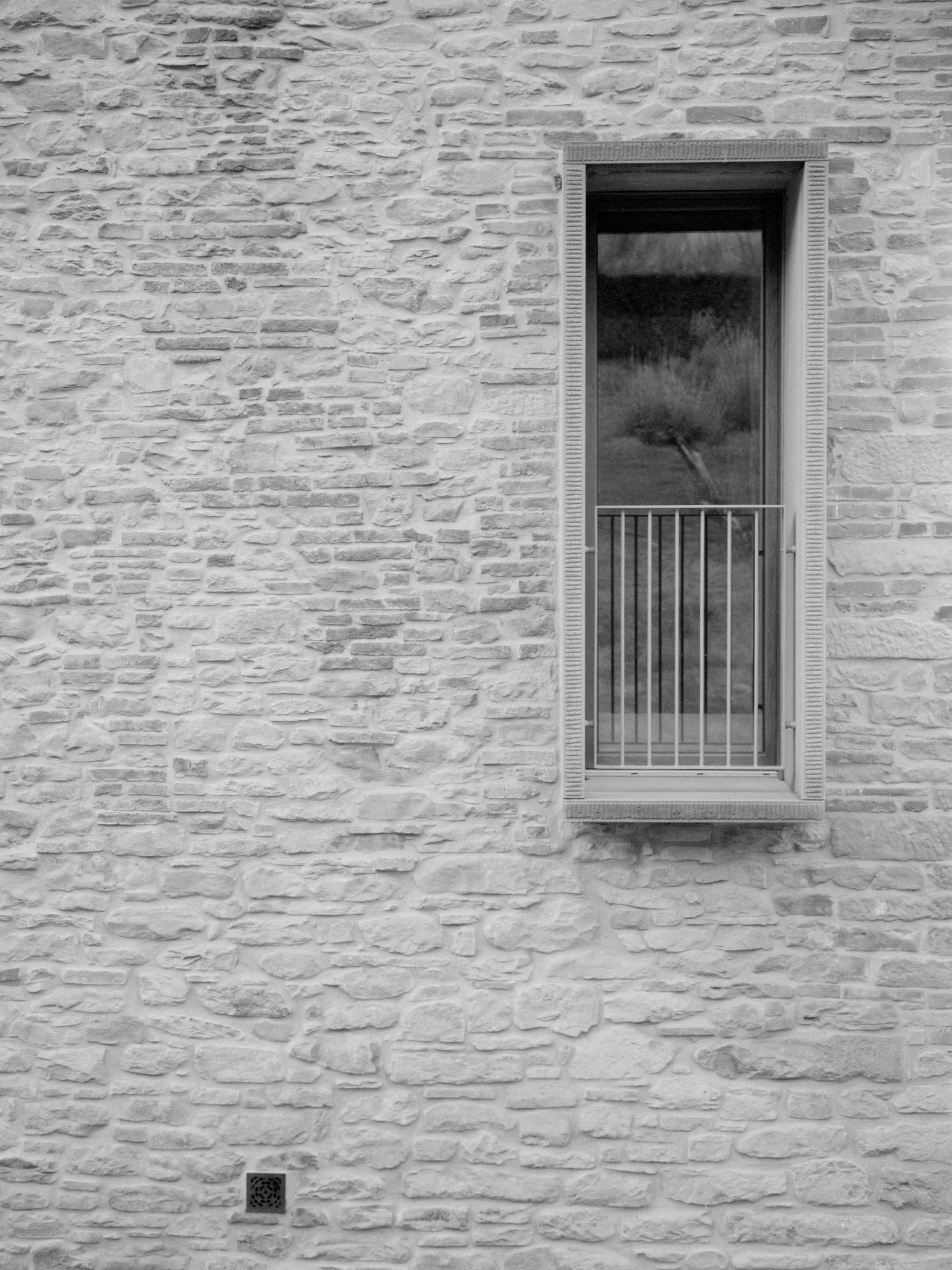 The extension stretches along the slope as a linear base, clad in stone, echoing the materiality and scale of the existing fabric while introducing a more abstract and controlled architectural language. A system of masonry piers and porticoes defines a rhythmic sequence of solids and voids, where light and landscape become active elements of the project. Large openings frame the valley, transforming the façade into a continuous visual device that mediates the relationship between interior and exterior.