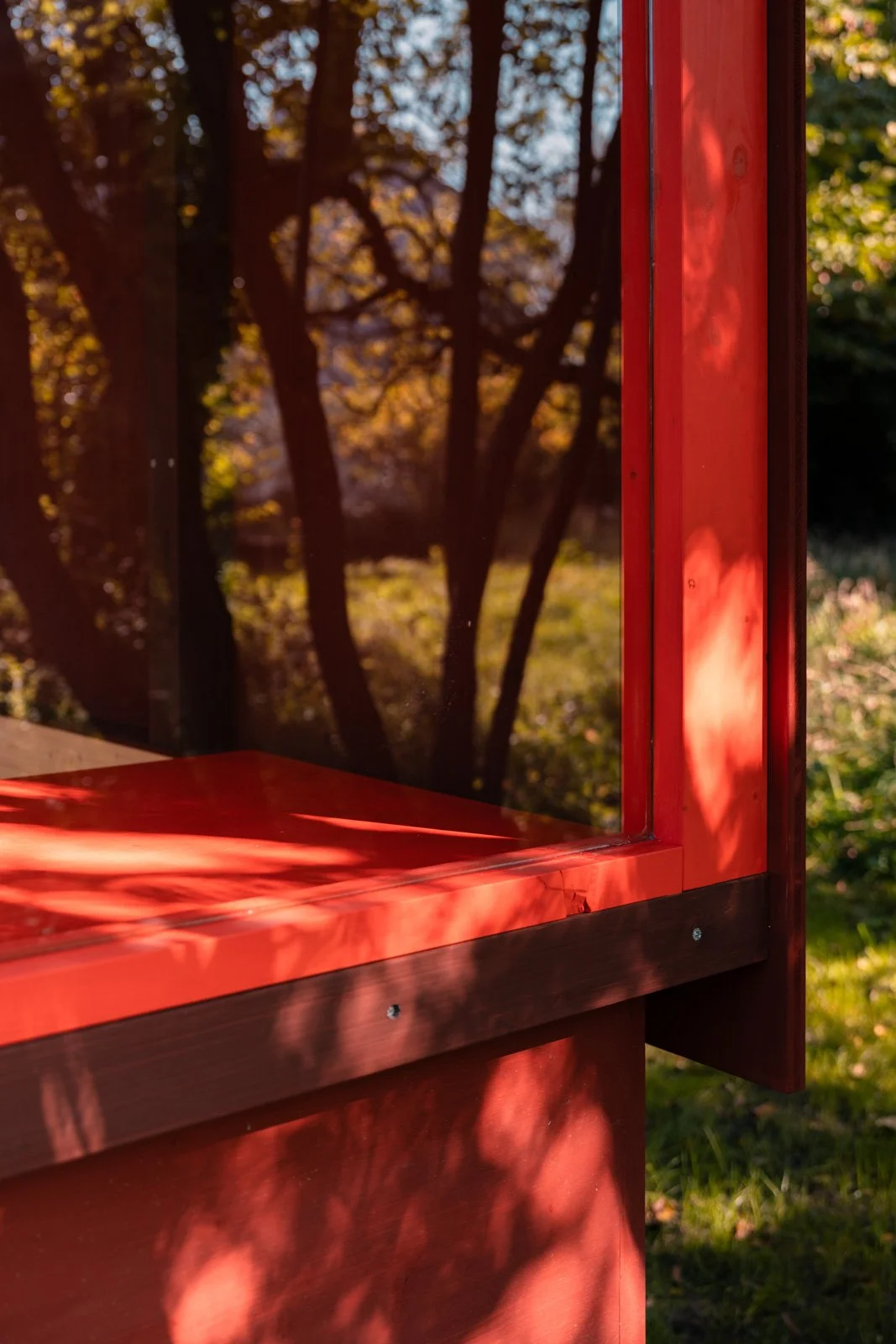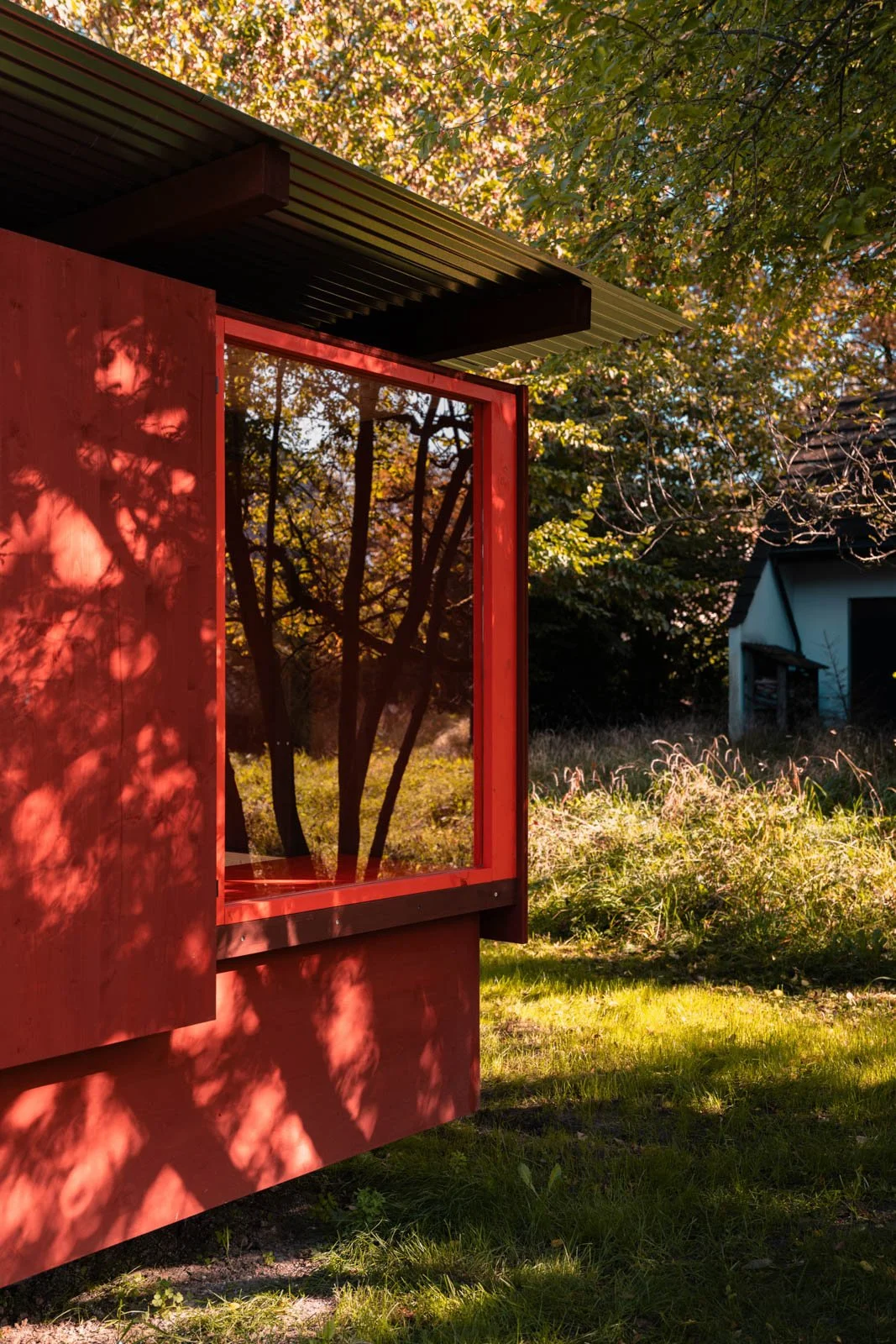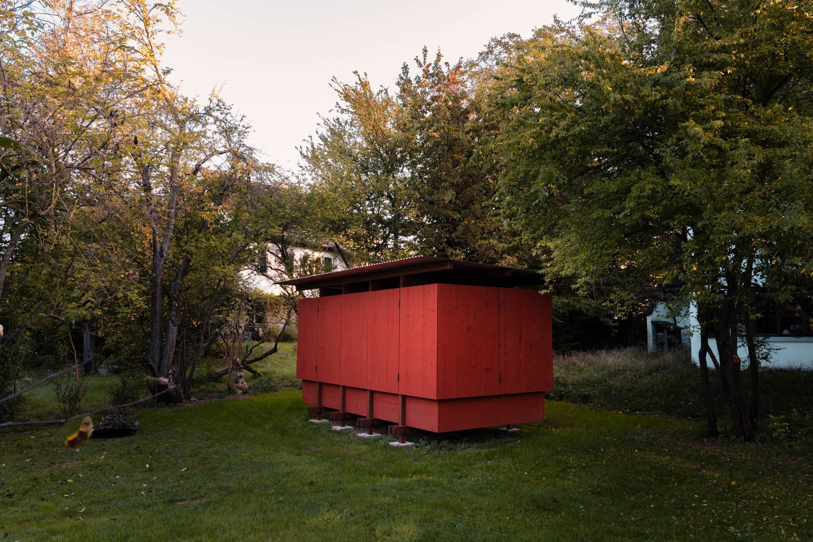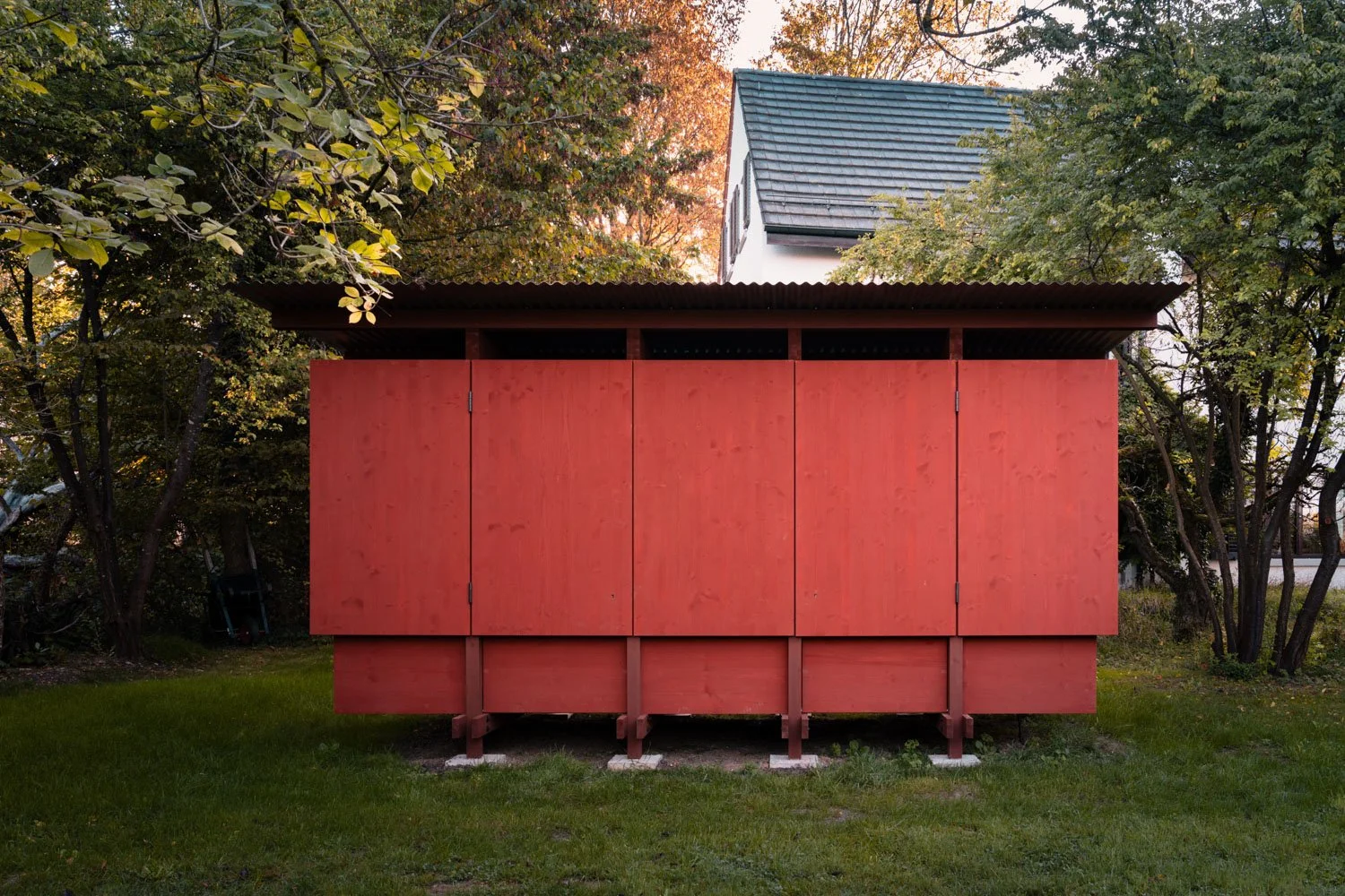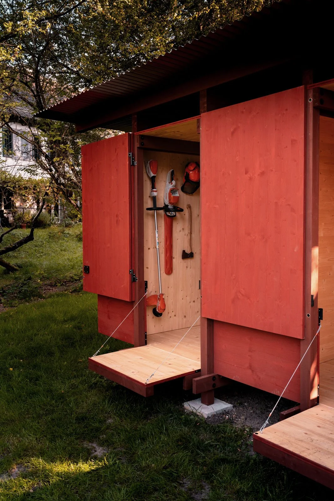 Generous, openable doors dissolve the threshold between inside and outside, transforming the compact volume into a seamless extension of the garden. Along the façade, a continuous work surface accessible from both sides supports various uses — from gardening and creative projects to a quiet workspace on warm days.