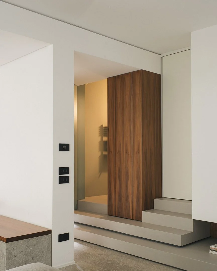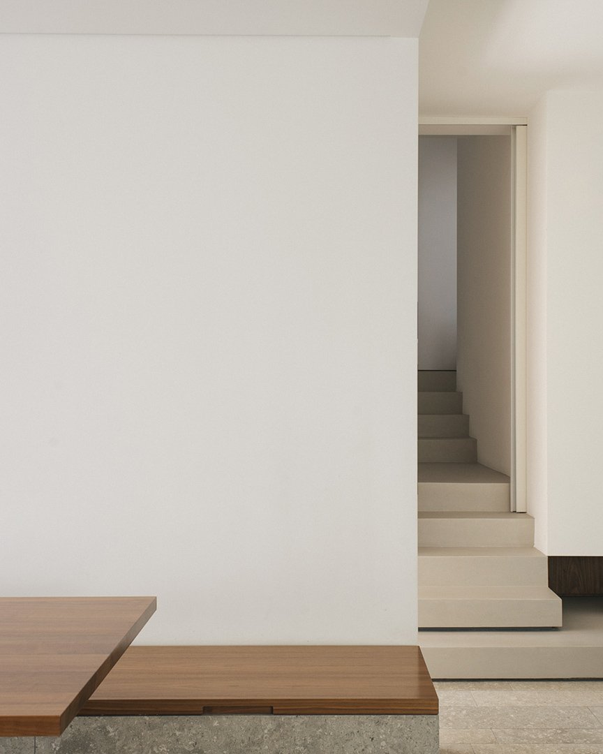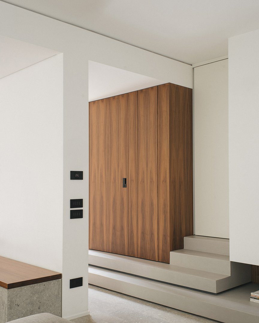 The new internal flow study led to modifications in the staircase connecting to the upper floors, allowing for the creation of an open space on the main raised ground floor that serves as the living area. The main entrance creates an independent zone that houses a new service bathroom and a small wardrobe. The bathroom in the sleeping area was enlarged, as it resulted from combining the existing bathroom with the original master bedroom bathroom.