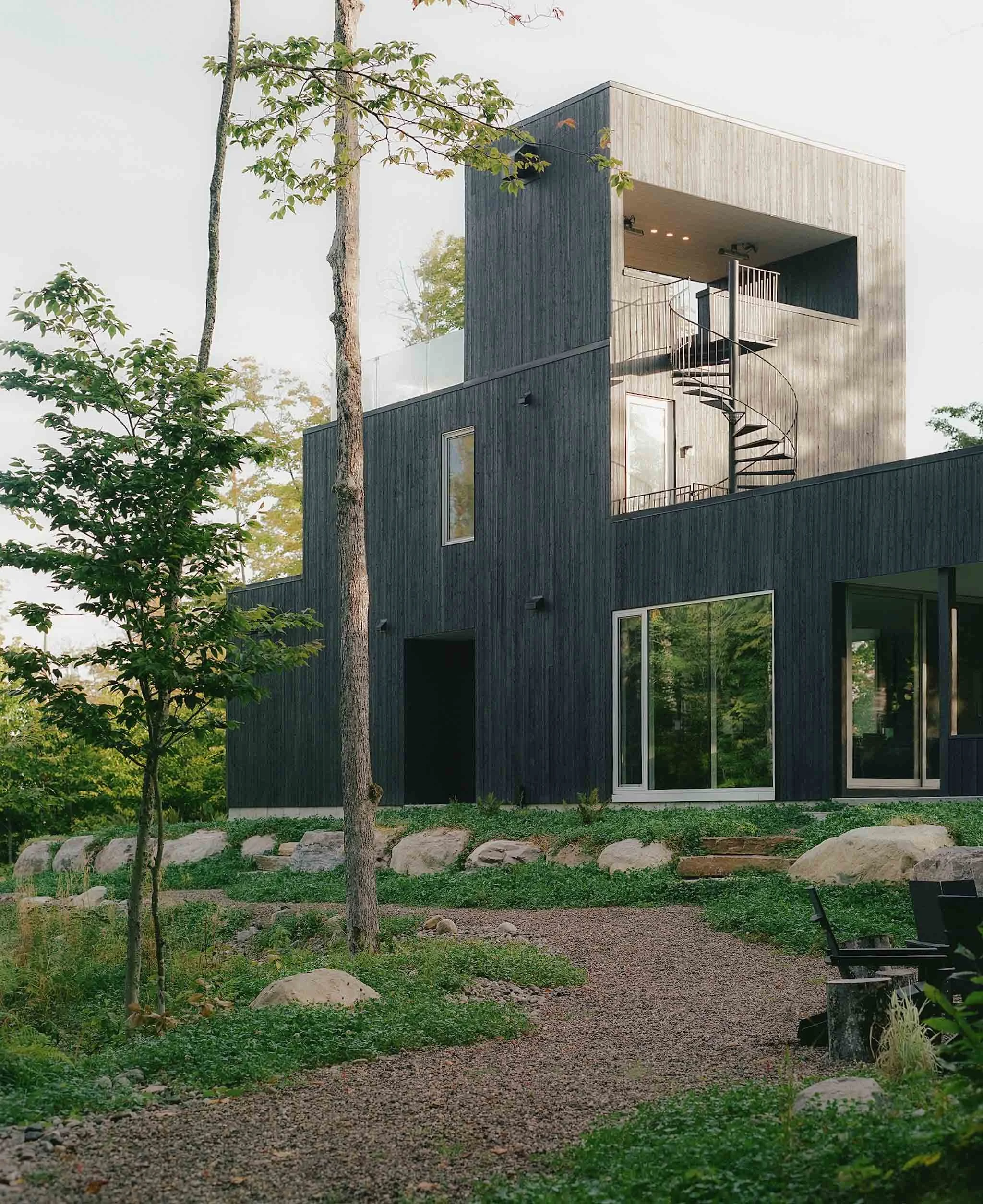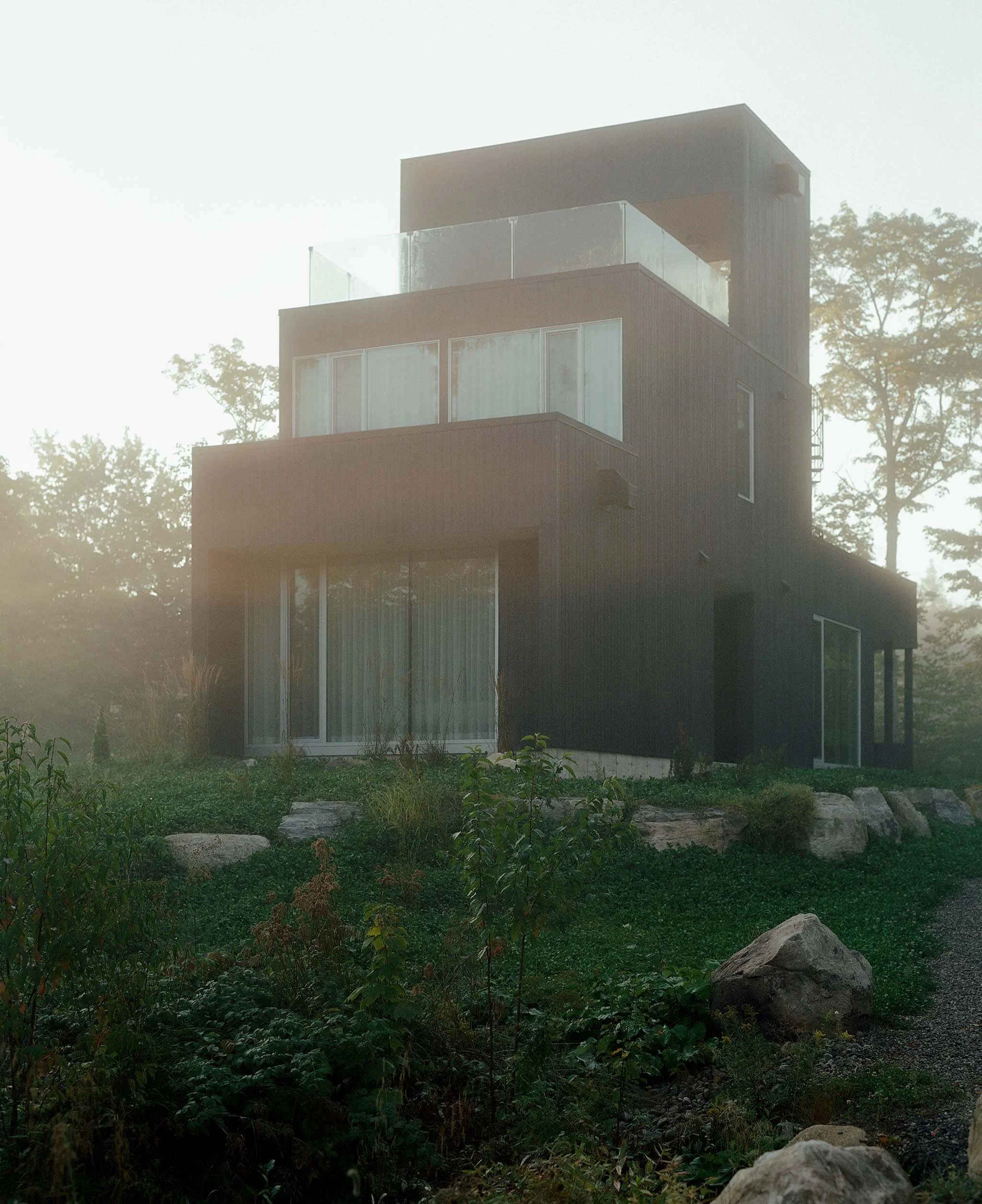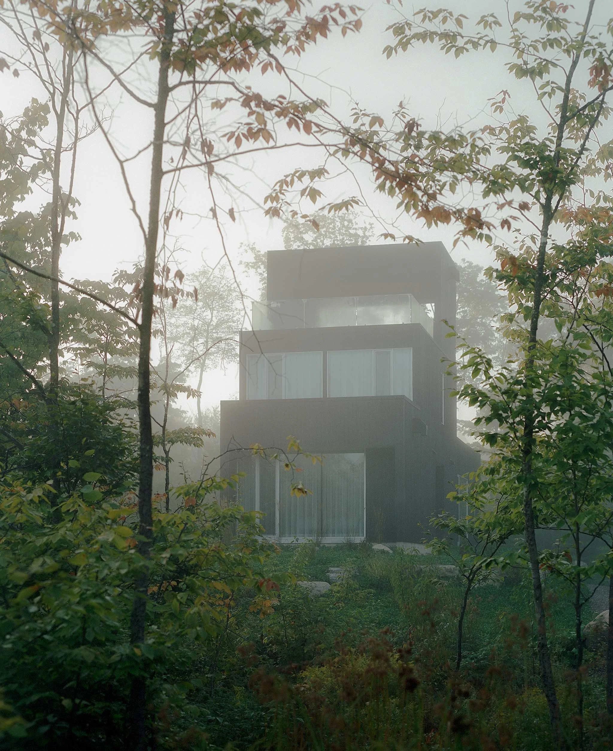 This project, with its sculptural language inspired by the work of Canadian artist Rolland Poulin, is an exercise that seeks to highlight the sublime qualities of the Laurentian Forest through the contrast between the building and its surroundings. The pure, monochromatic aspects of the project do not compete with the lush vegetation but rather engage in a dialogue with it. As the seasons change, one approaches the building and discovers it like a "found object", where the architectural journey culminates in a third-floor terrace/lookout offering views of the mountains.