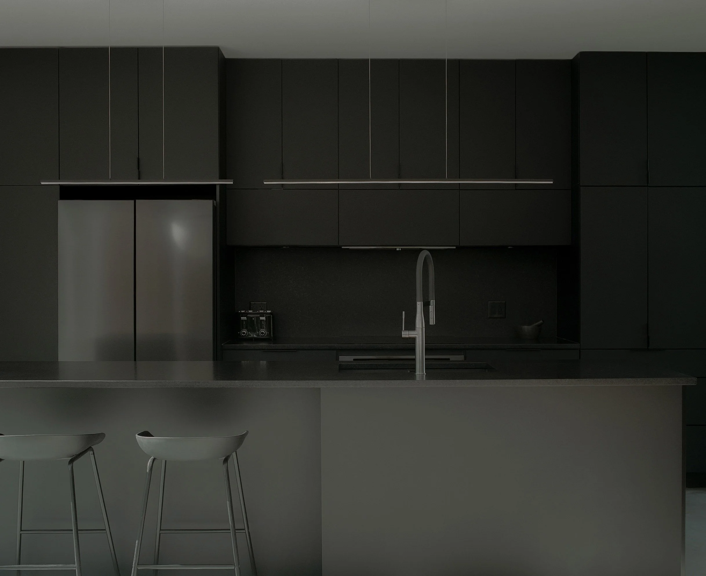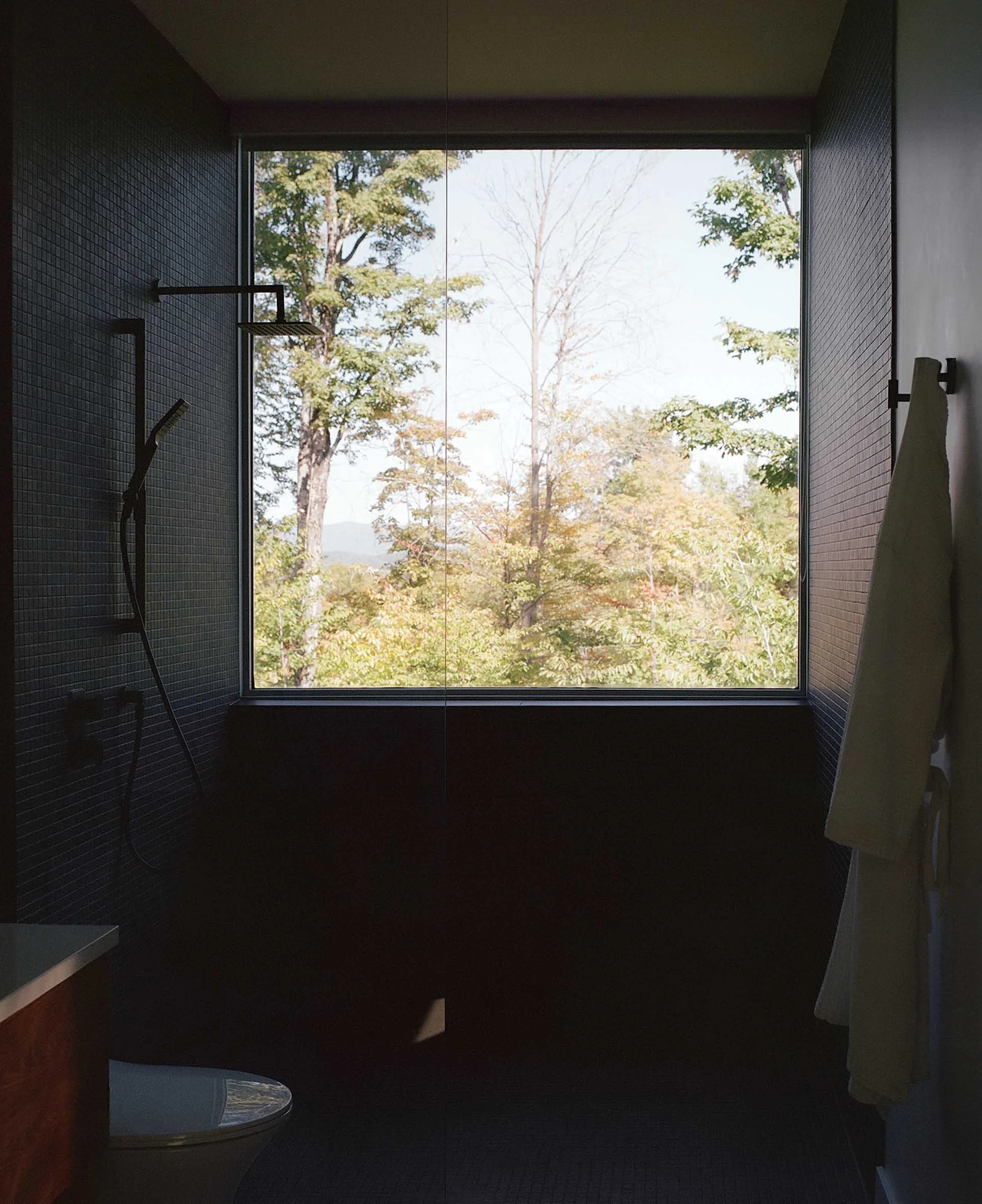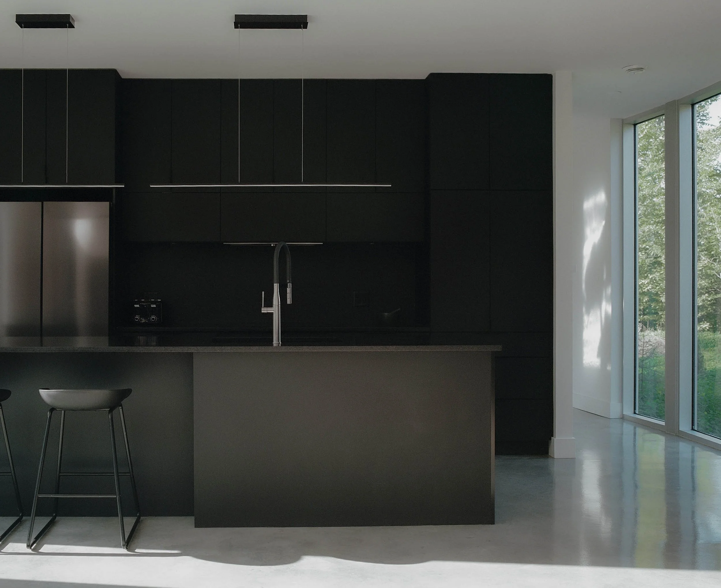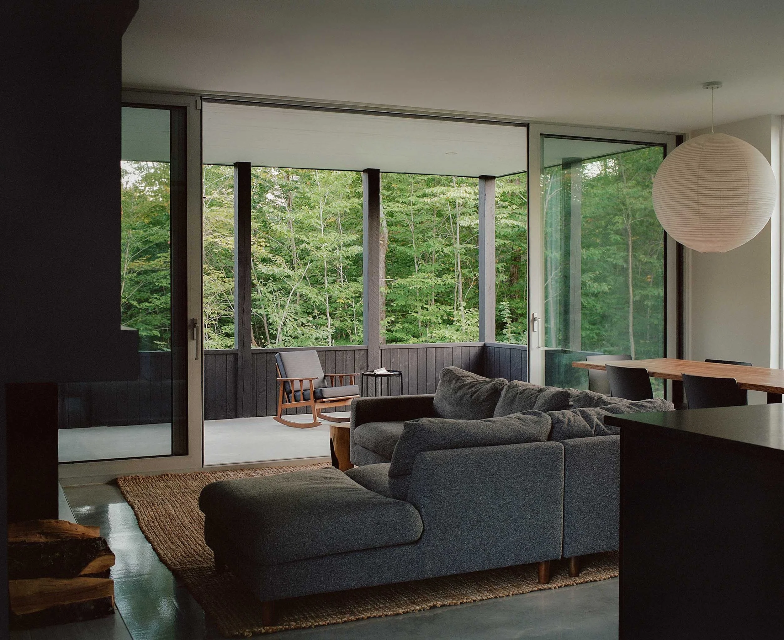 This project, with its sculptural language inspired by the work of Canadian artist Rolland Poulin, is an exercise that seeks to highlight the sublime qualities of the Laurentian Forest through the contrast between the building and its surroundings. The pure, monochromatic aspects of the project do not compete with the lush vegetation but rather engage in a dialogue with it. As the seasons change, one approaches the building and discovers it like a "found object", where the architectural journey culminates in a third-floor terrace/lookout offering views of the mountains.