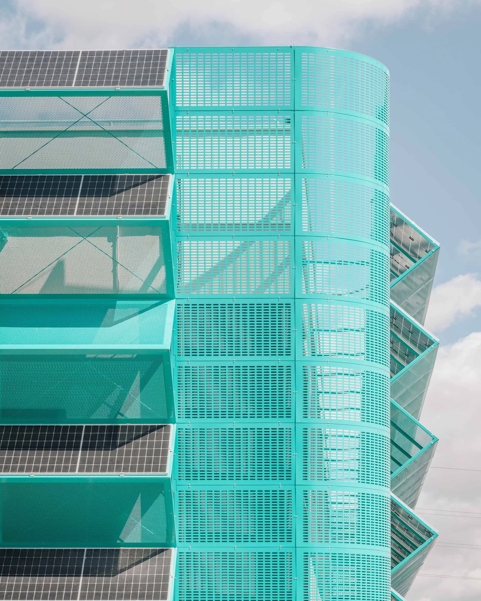 This new approach reimagines traditionally underutilized spaces, such as industrial areas and factories, by proposing a novel, industrialized system that generates sustainable energy. The project consists of a new envelope equipped with photovoltaic panels, angled to optimize solar capture. These panels not only generate clean energy but also act as visual connectors between the different buildings. Additionally, a new perforated metal skin in the company's characteristic color has been integrated, which not only unifies the aesthetic of the campus buildings but also creates a visual interplay of transparency, allowing glimpses of the original building behind it. This design achieves a harmonious relationship between the existing architecture and the new envelope, renewing the complex’s overall image and identity.