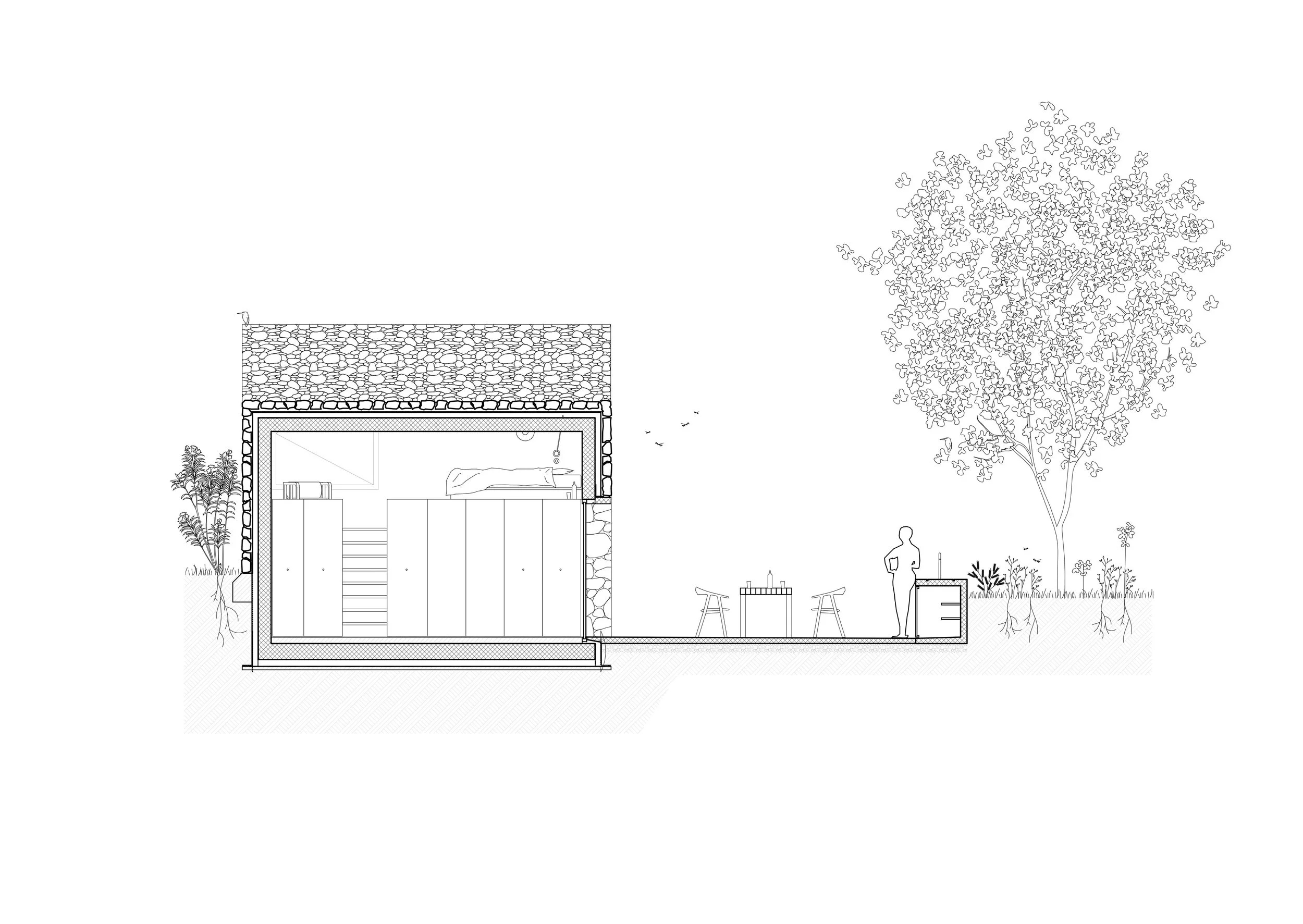 The project is located in an isolated landscape on the Pelješac peninsula. The building was originally conceived as a summer kitchen (Pretpec), functioning as an auxiliary structure to the main house. Pretpec is a local term from Dubrovnik and its surroundings for a structure with an open hearth, originally with a floor of compacted clay, later paved with brick. The intervention is therefore limited to a reconstruction within the existing footprint, position, and volume, without the possibility of expansion or formal redefinition.