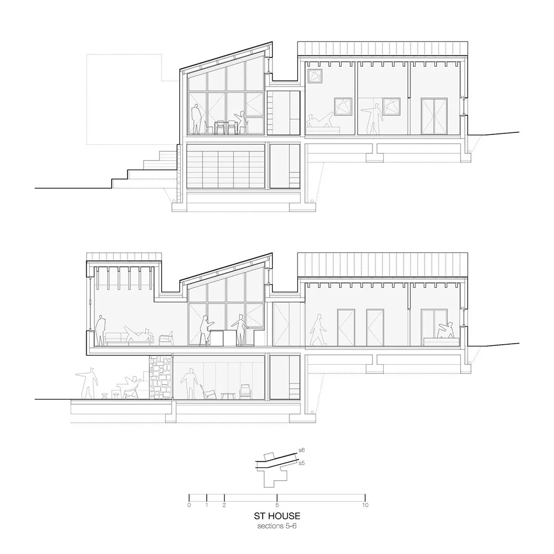 Despite the apparent geometric complexity of the composition, each volume follows a rigorous spatial and constructional logic. The five regular forms are positioned in response to topography and orientation, maximising views and independent access. Constructed with single-pitch timber roofs, they share a consistent structural rhythm, a repetitive sectional profile, and systematic modulation, while their lengths vary according to programme requirements. The interstitial spaces are unified by a flat concrete slab. Exposed timber and concrete define the interior, establishing a clear dialogue between structure, materiality, and domesticity.