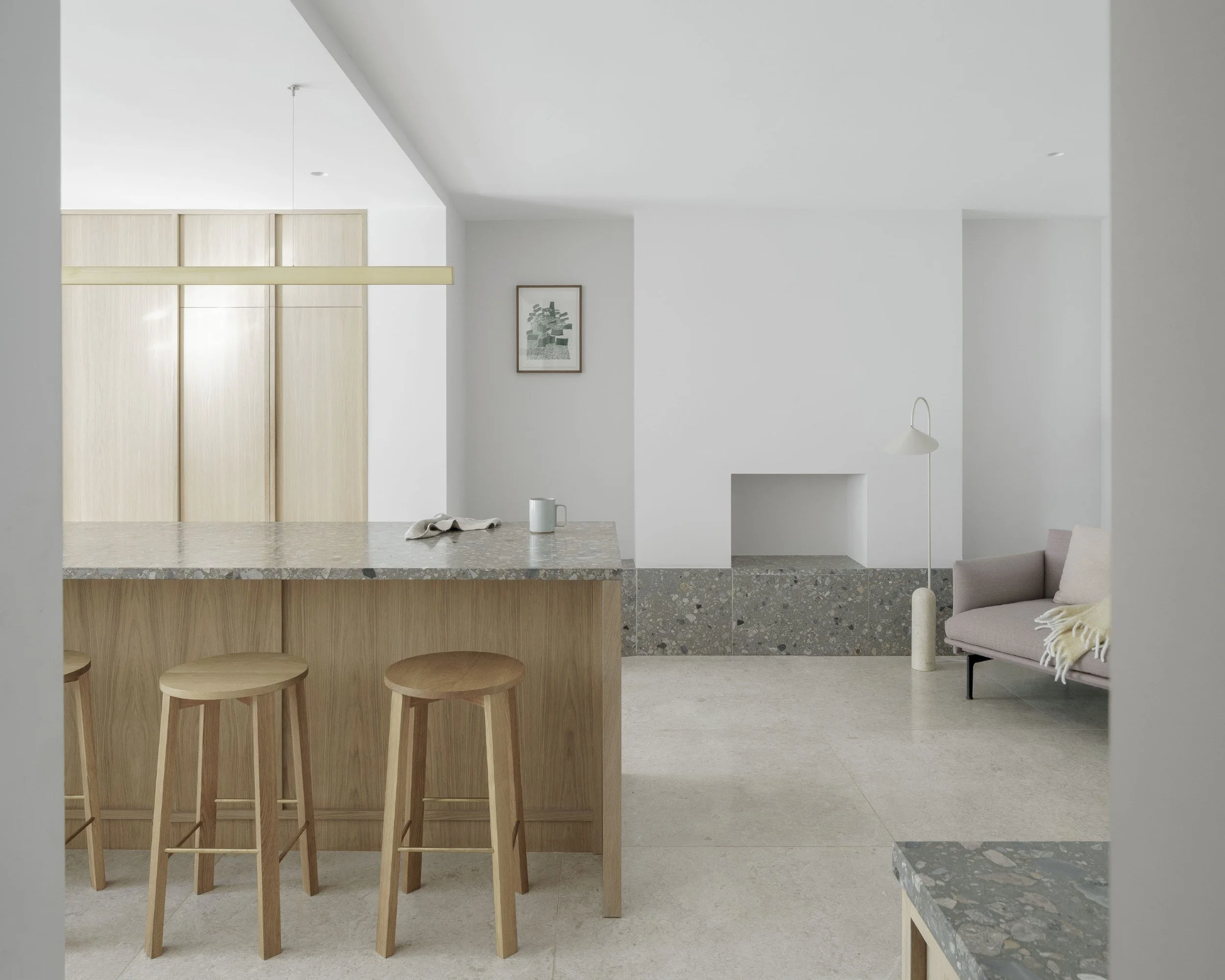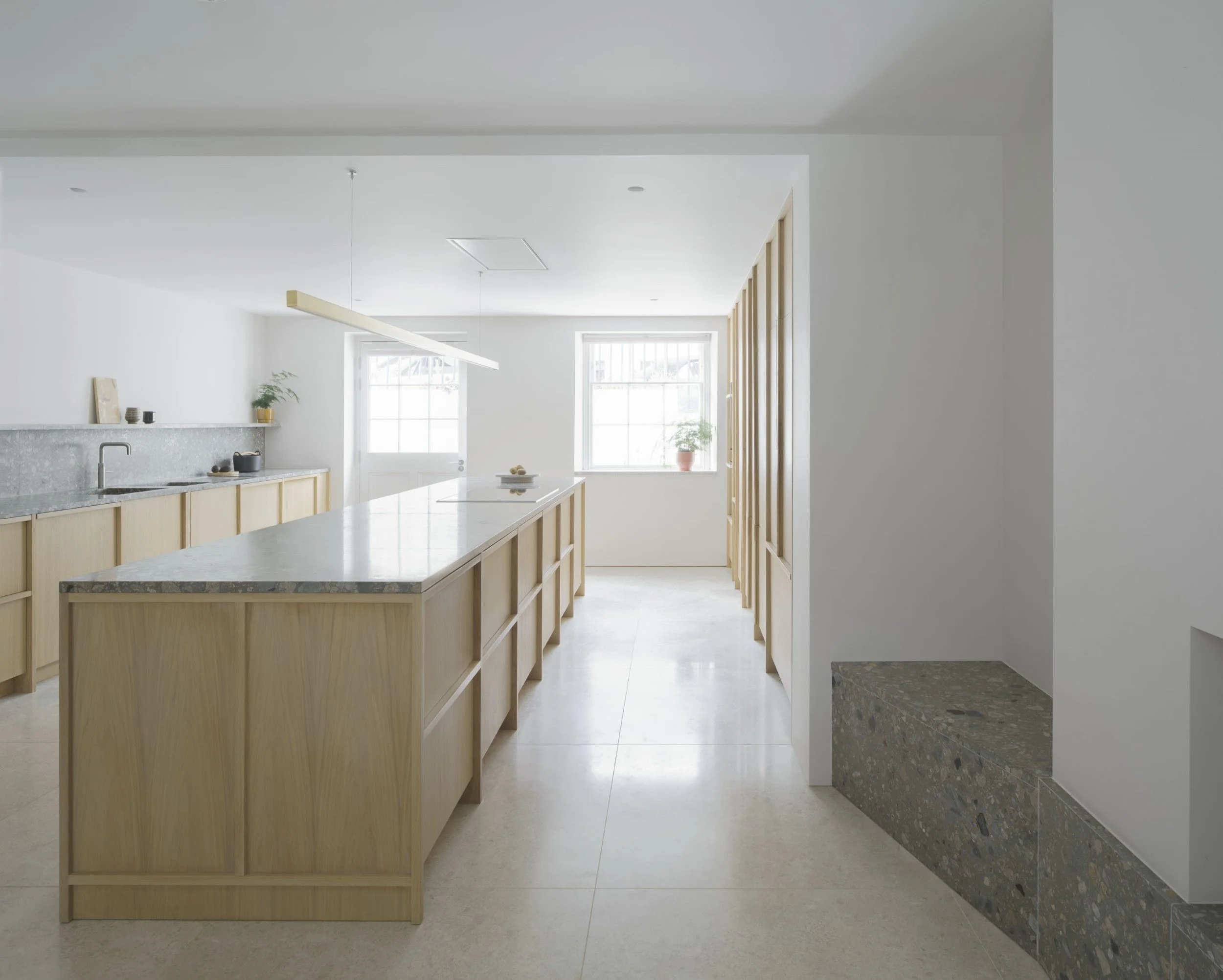 Previously the lower ground floor was divided into smaller dark spaces, which have been opened up and replaced with a kitchen centred around a four-metre-long stone island.
