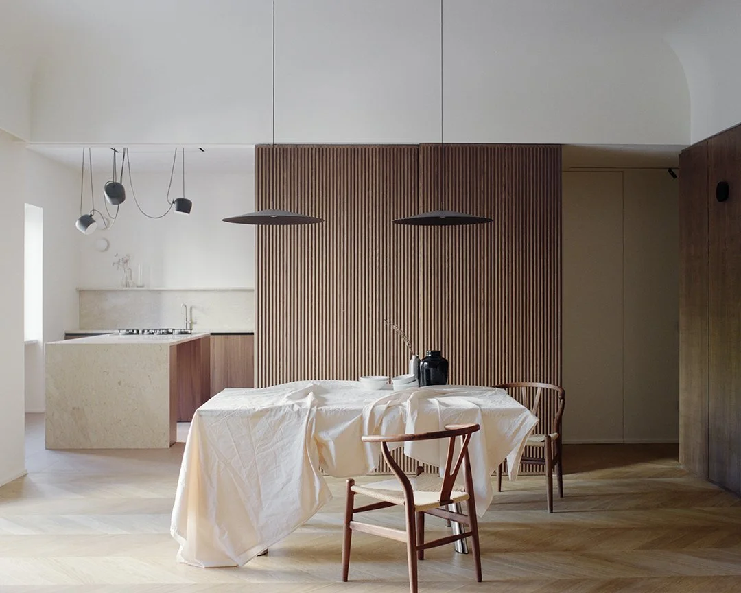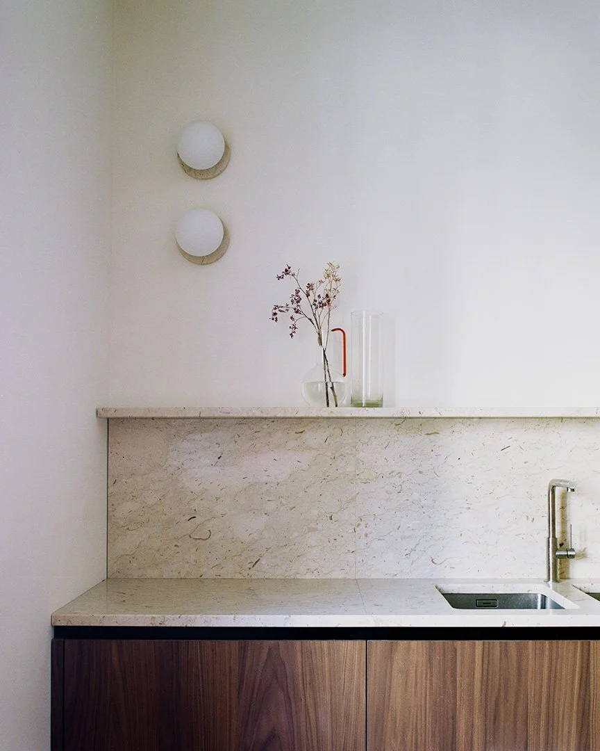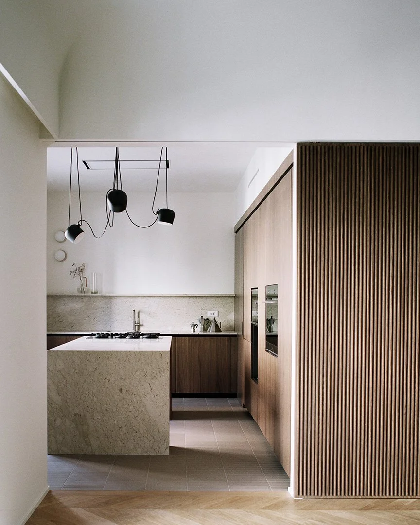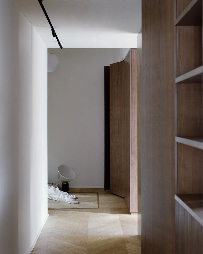 Craftsmanship is present in every detail. The joinery, executed with precision and care, introduces warmth and tactility, while maintaining coherence with the apartment’s restrained geometries. The choice of natural marble further enriches the material palette, adding depth through variations in texture and tone. These stone surfaces interact with wood and light to produce measured contrasts, reinforcing the character of each space without overpowering it.