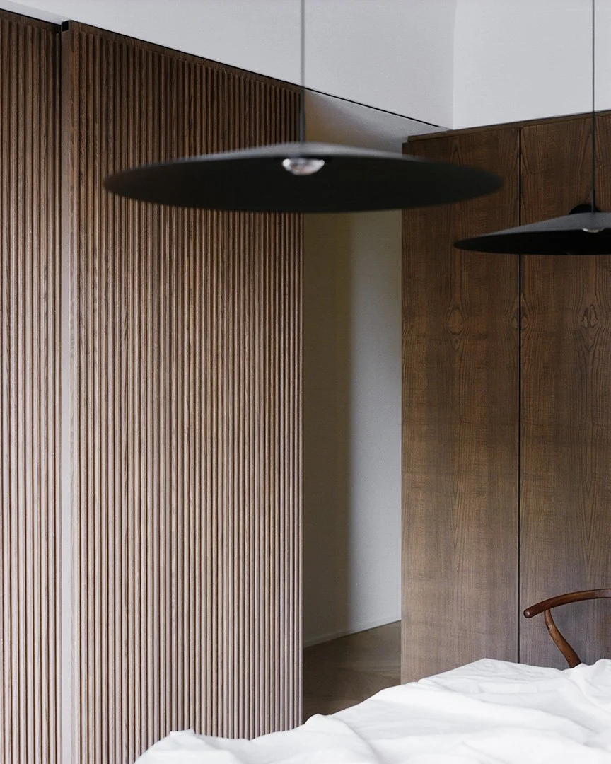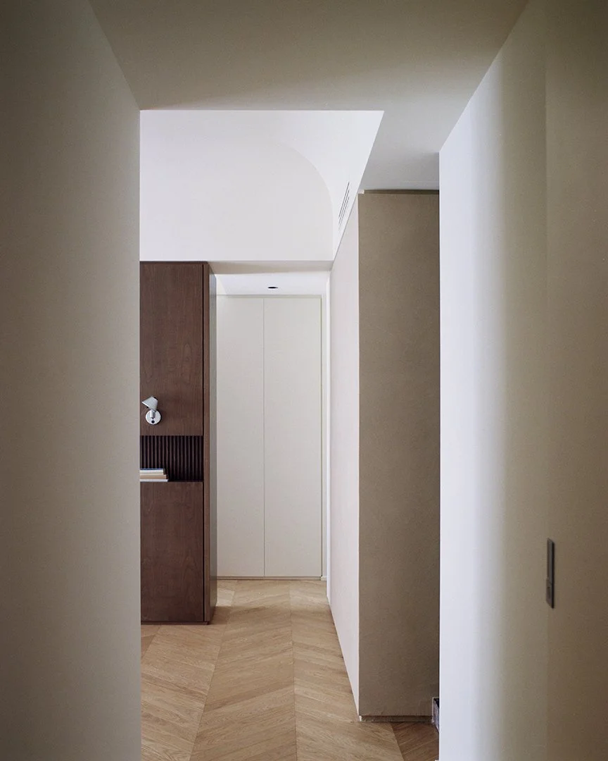 A central role is played by the custom-designed fixed furniture, conceived as an integral part of the architecture rather than simple additions. The main wardrobe system works as both storage and spatial device: it traces a path that connects the entrance with the living area and, without interruption, leads to the private quarters. This continuity organizes the domestic landscape into a logical flow, where functions follow one another seamlessly and the perception of movement is both clear and natural.