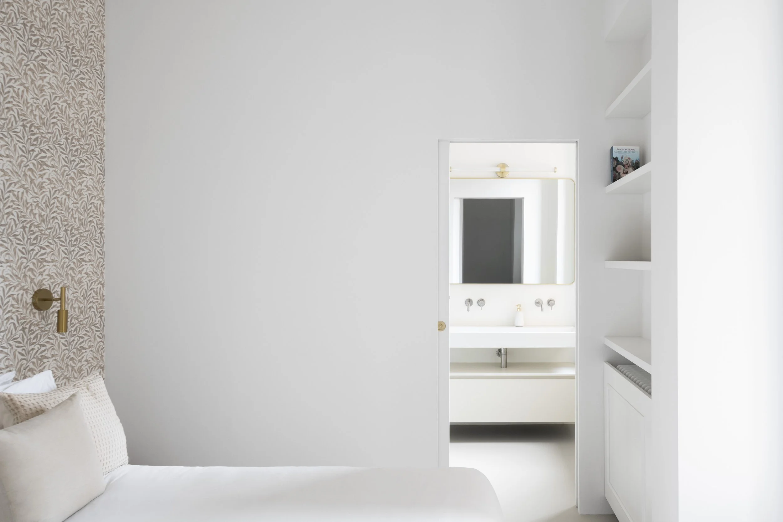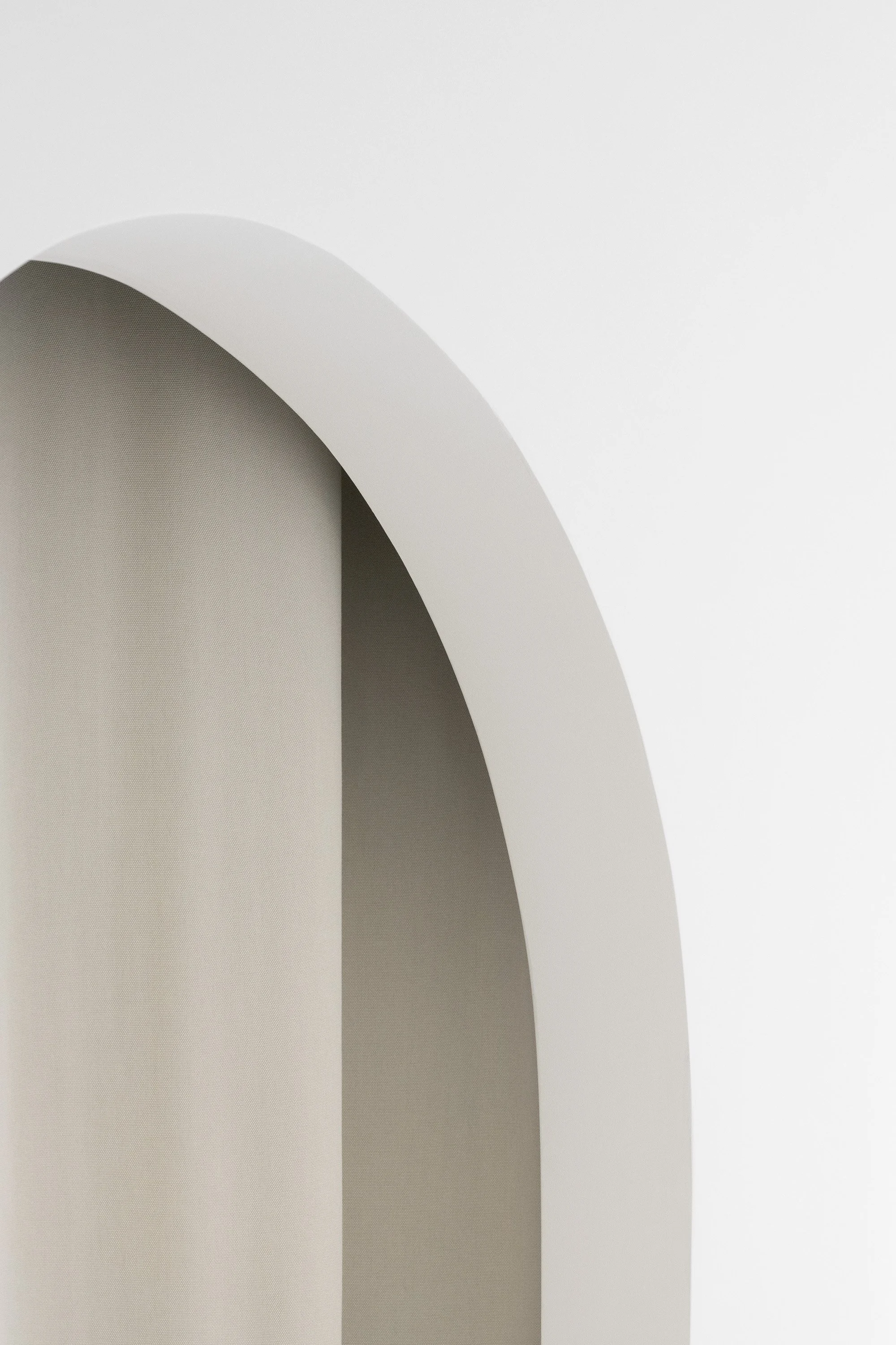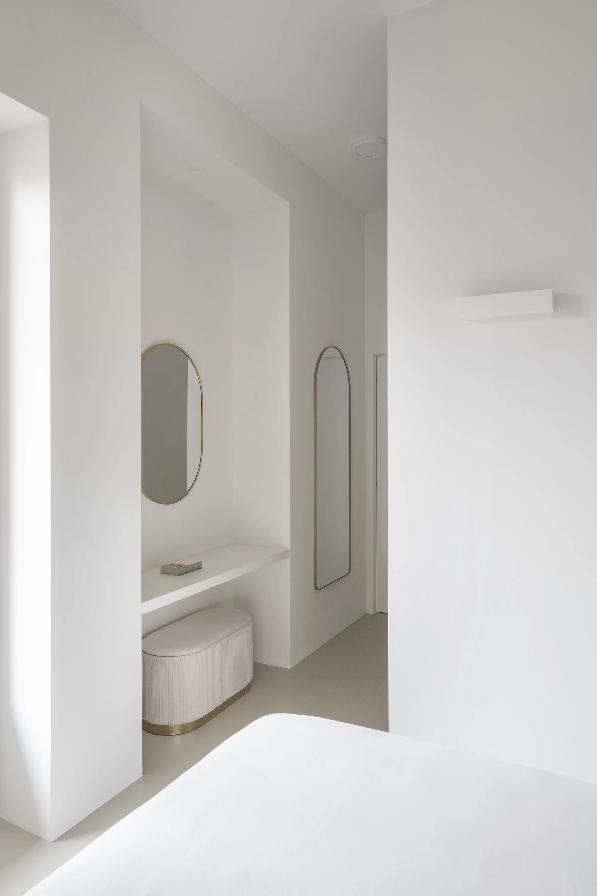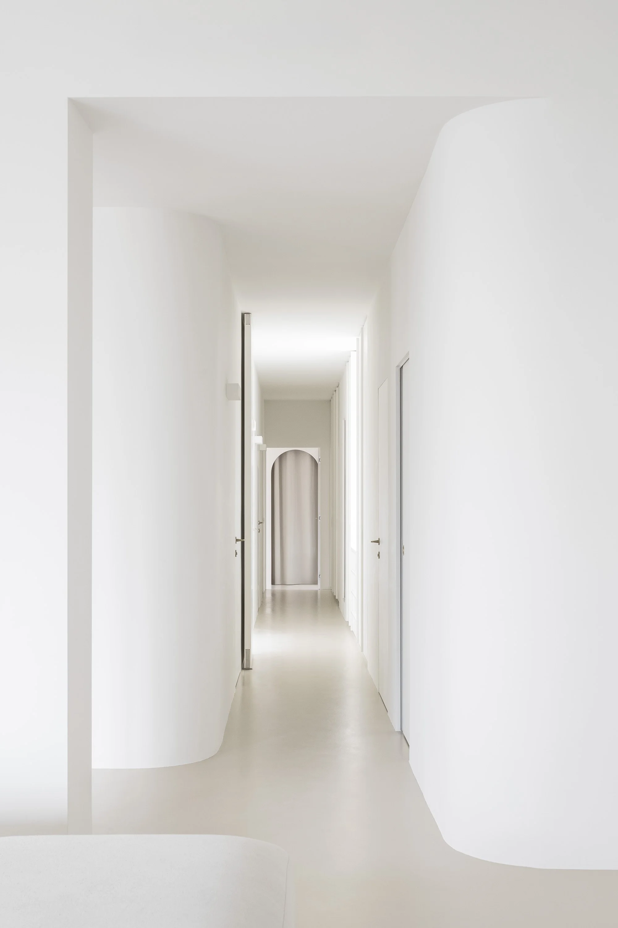 Two curved walls—housing the laundry room and walk-in closet—lead into the bedroom area. The sleeping area is separated by a full-height pivot door, which reduces the visual depth of the corridor and allows, when needed, the separation between the children’s area and the parents’ area. The corridor itself has been reinterpreted as a functional, equipped space; built-in cabinetry follows the geometry of the walls, incorporating both a window and the bathroom door.