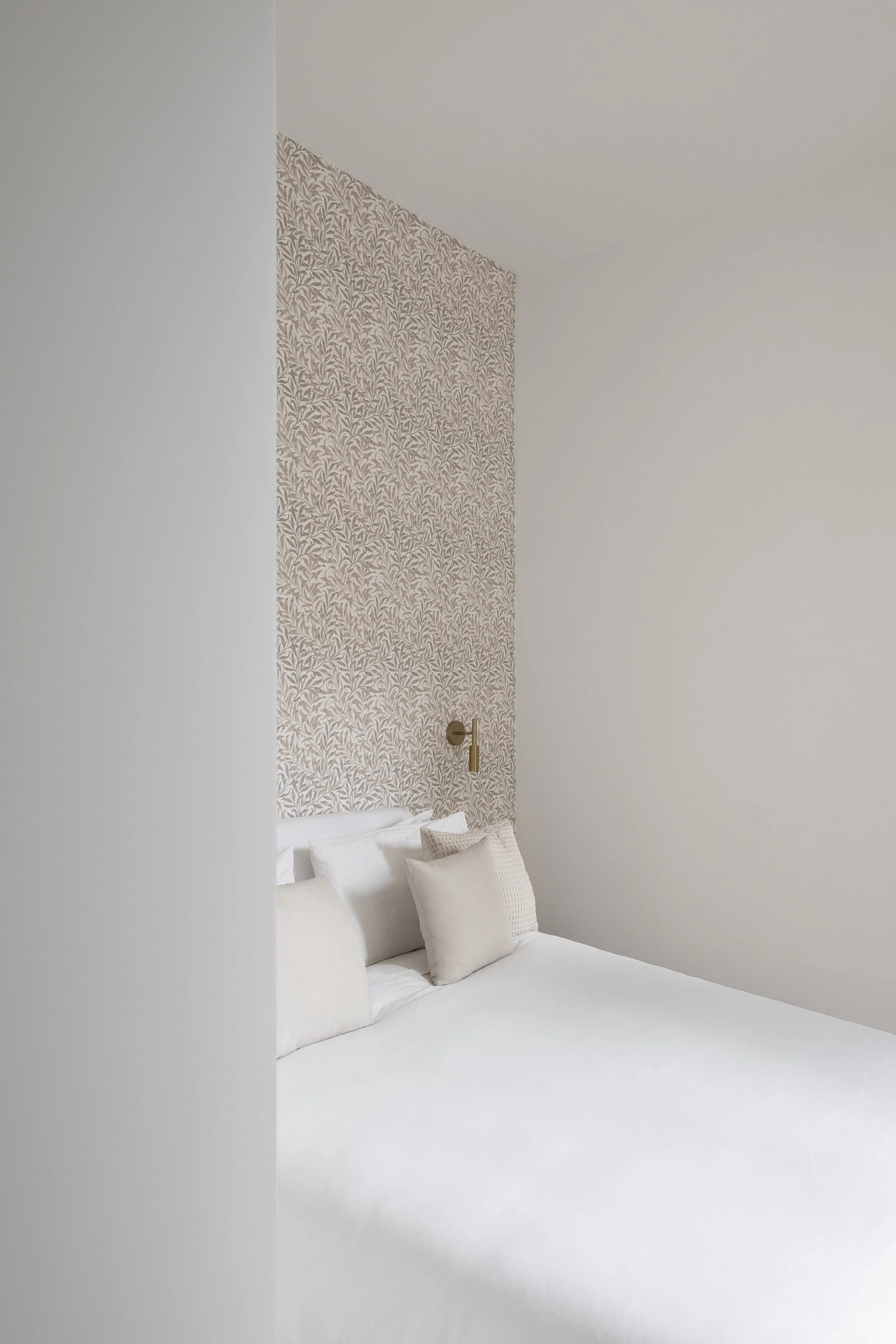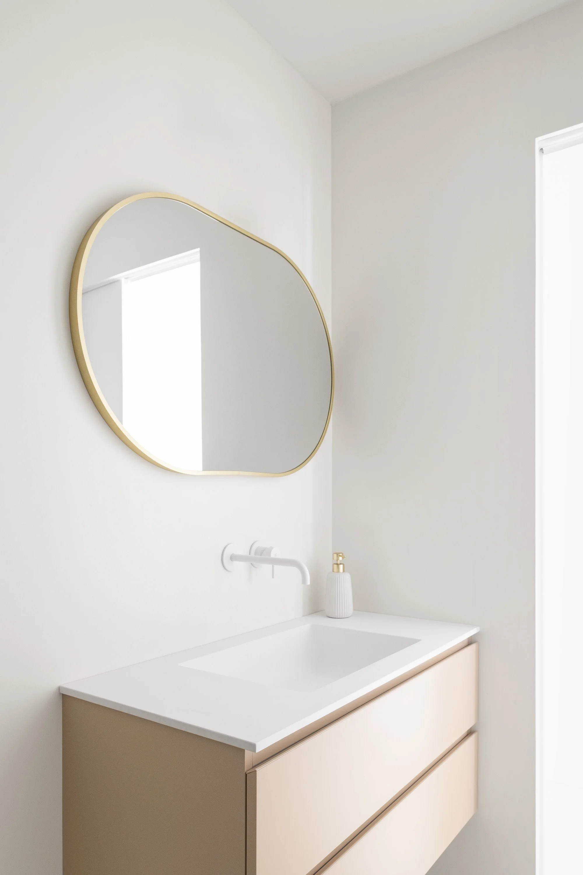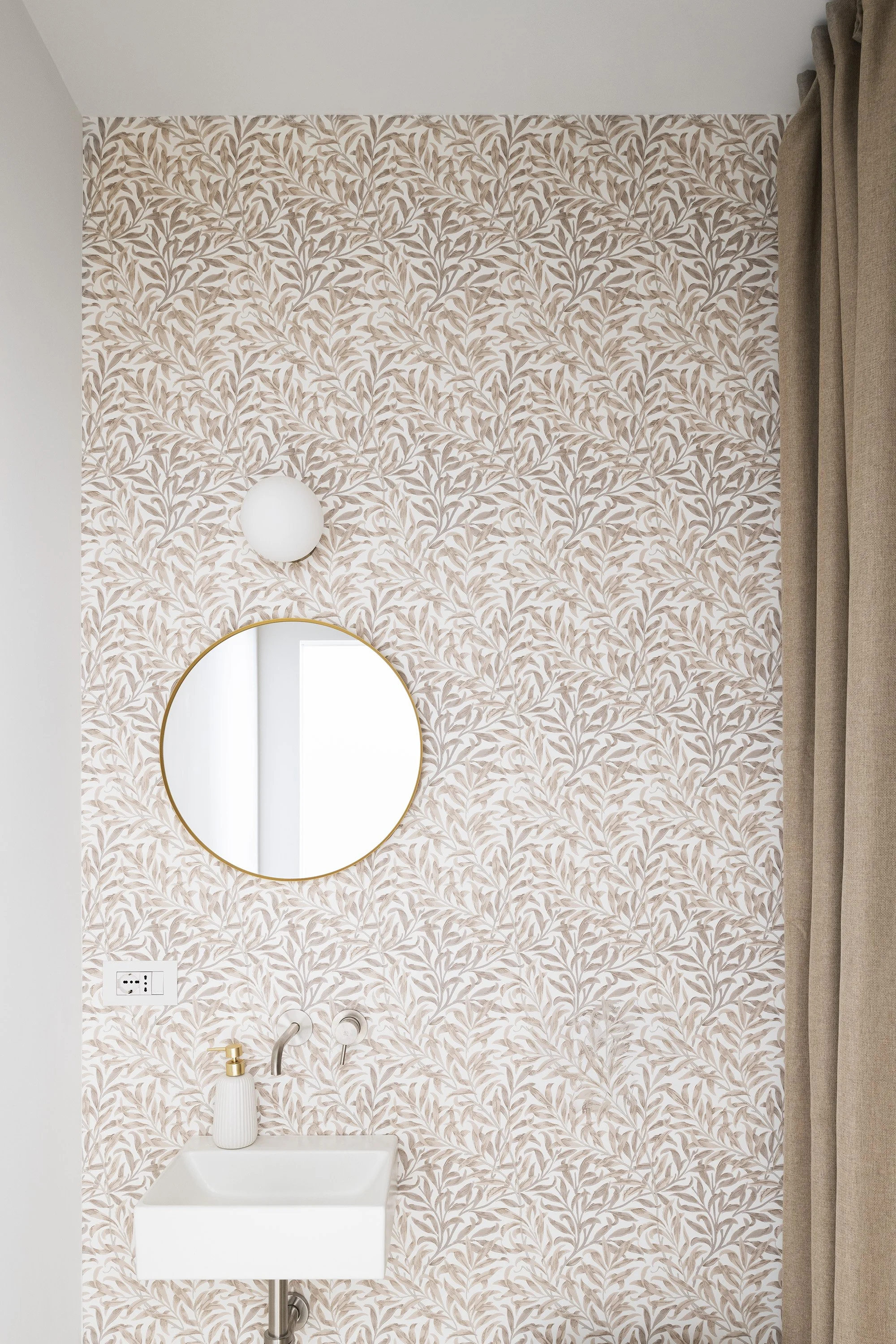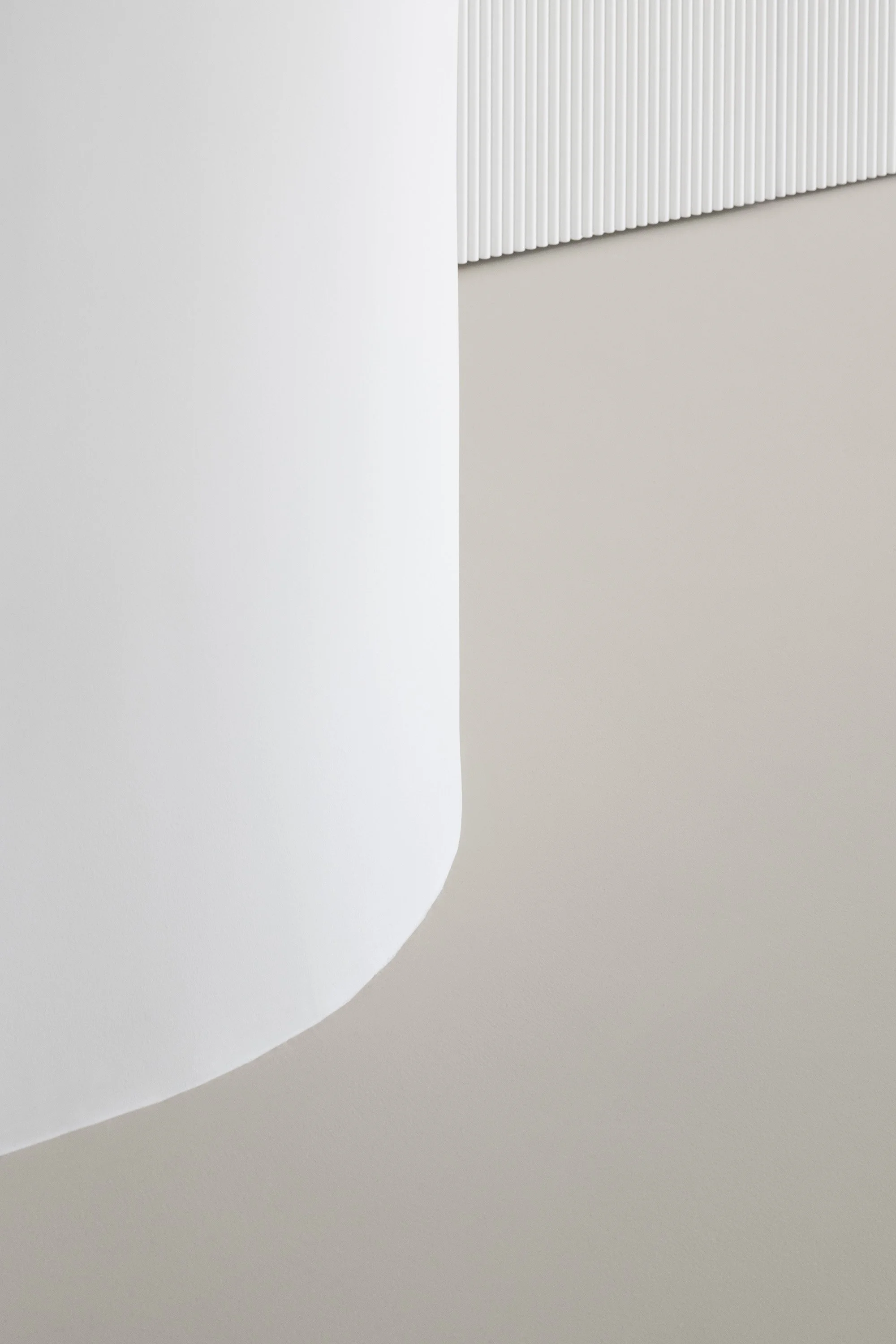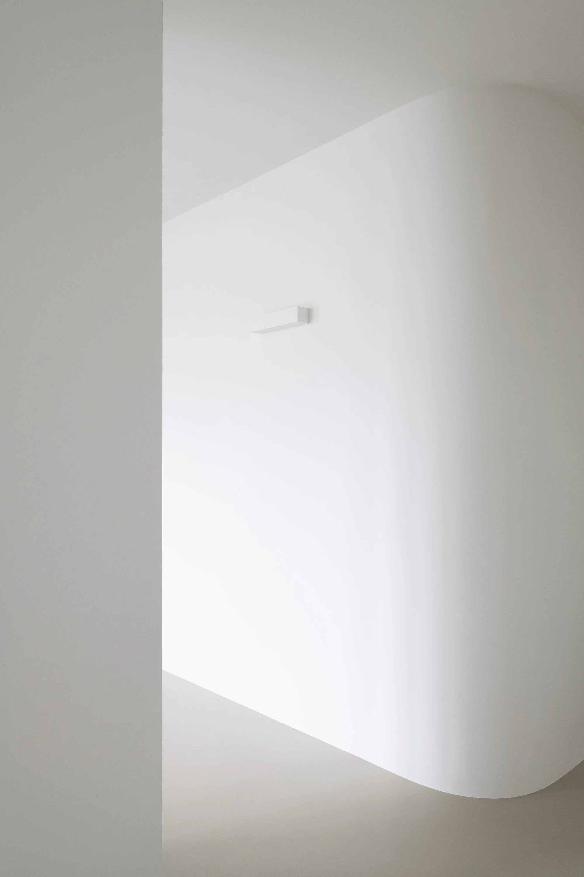 Two curved walls—housing the laundry room and walk-in closet—lead into the bedroom area. The sleeping area is separated by a full-height pivot door, which reduces the visual depth of the corridor and allows, when needed, the separation between the children’s area and the parents’ area. The corridor itself has been reinterpreted as a functional, equipped space; built-in cabinetry follows the geometry of the walls, incorporating both a window and the bathroom door.