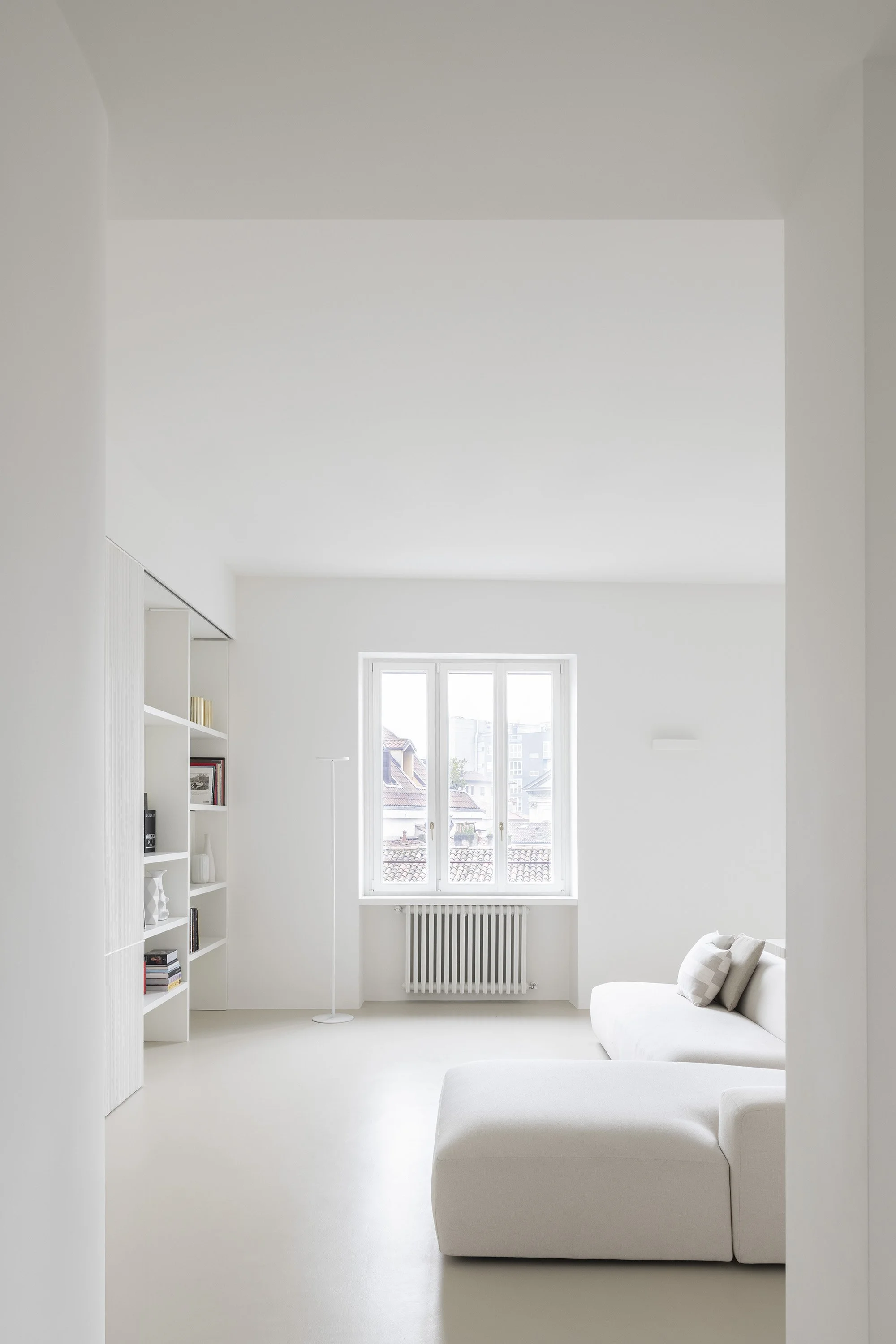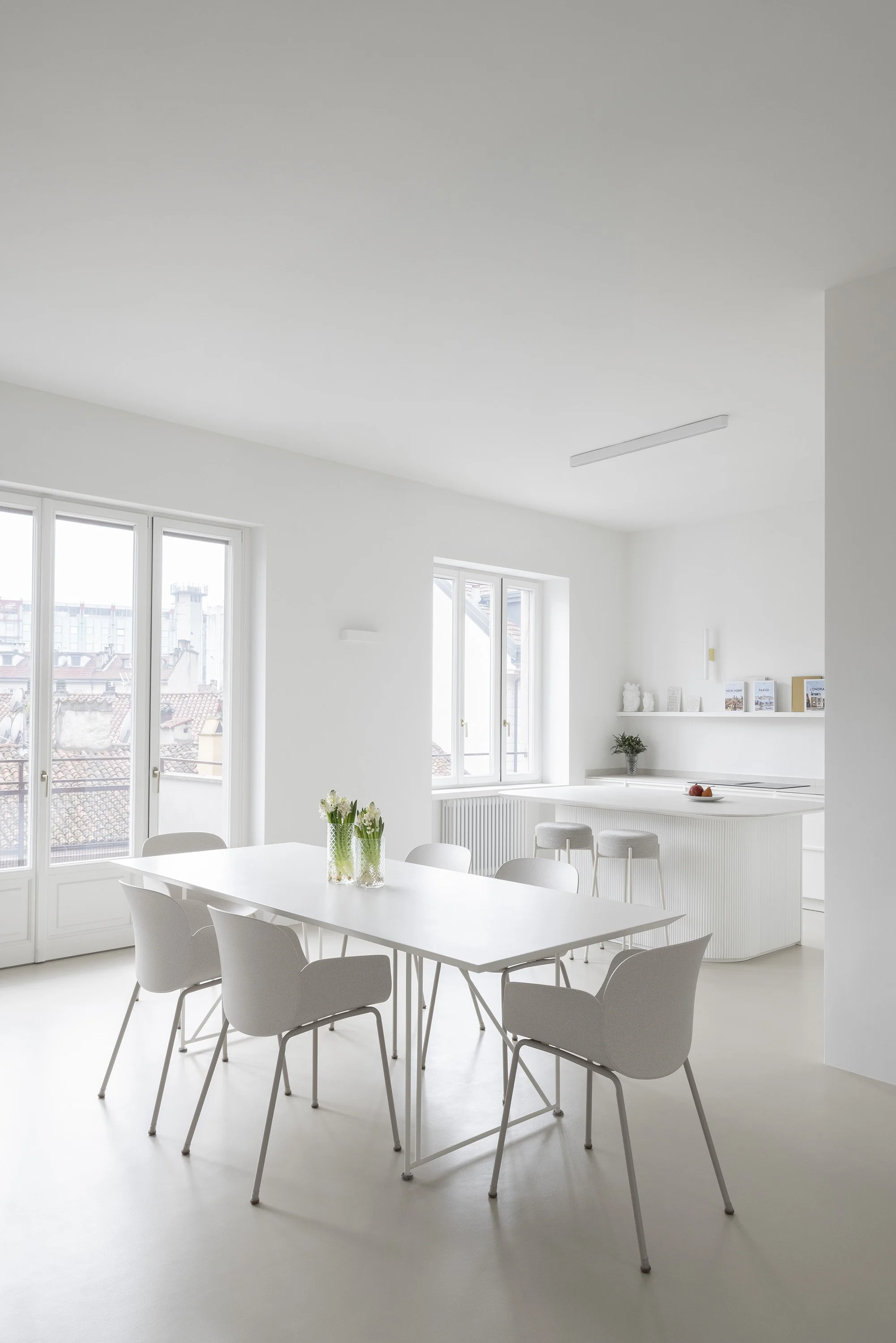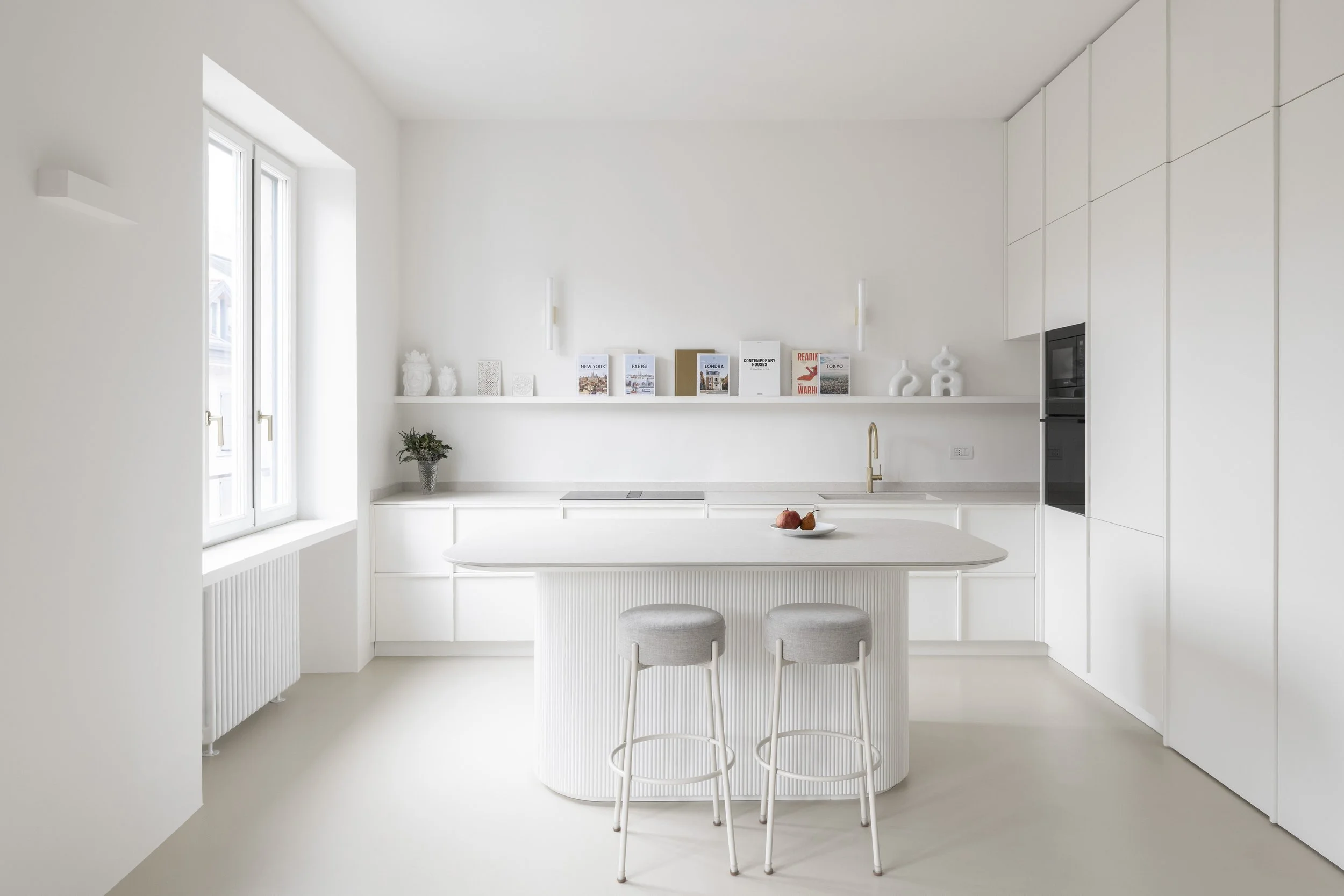 Minimalist furnishings, “Old Milan” elements, and a color palette of beige and white come together to define the spaces and enhance their brightness. Particular attention has been given to materials and surfaces: the continuous beige Kerakoll resin flooring creates a neutral yet warm surface that extends throughout the apartment. Fixed furnishings are designed in chromatic continuity with the walls, with details and finishes that add structure and materiality.