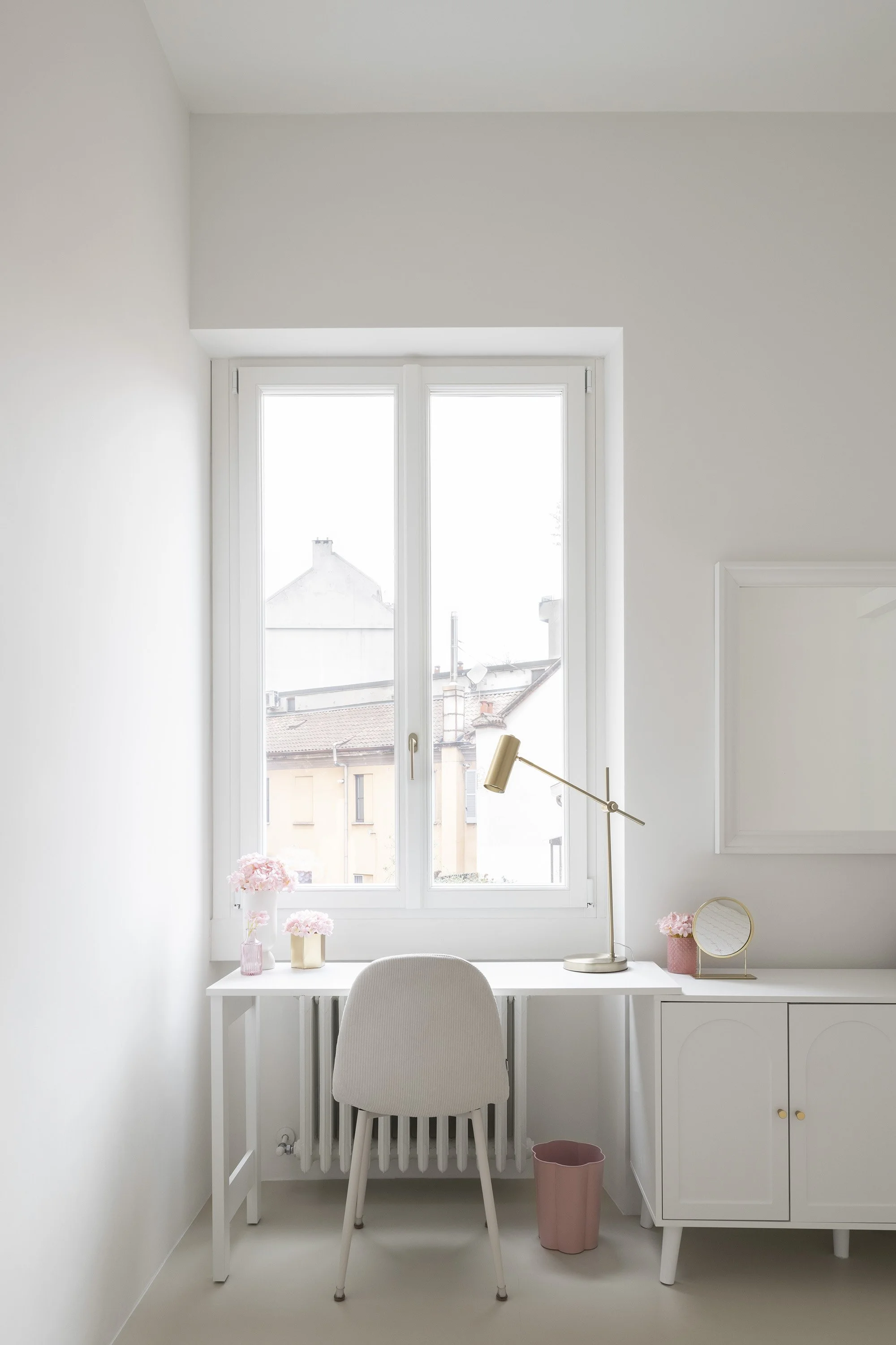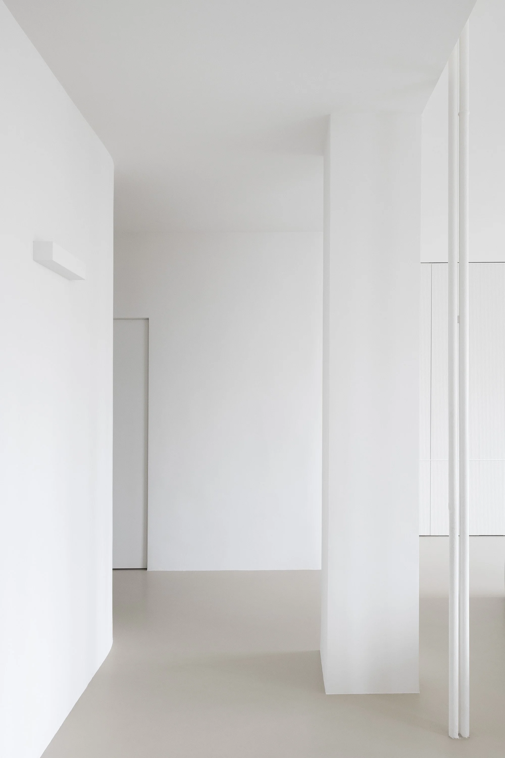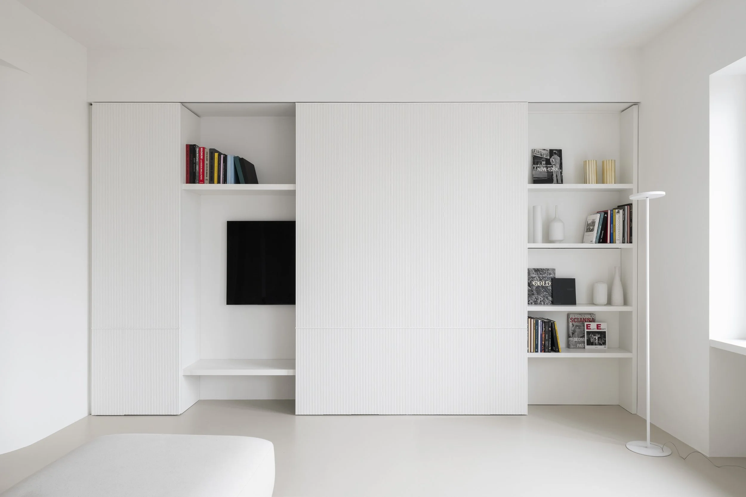 Minimalist furnishings, “Old Milan” elements, and a color palette of beige and white come together to define the spaces and enhance their brightness. Particular attention has been given to materials and surfaces: the continuous beige Kerakoll resin flooring creates a neutral yet warm surface that extends throughout the apartment. Fixed furnishings are designed in chromatic continuity with the walls, with details and finishes that add structure and materiality.