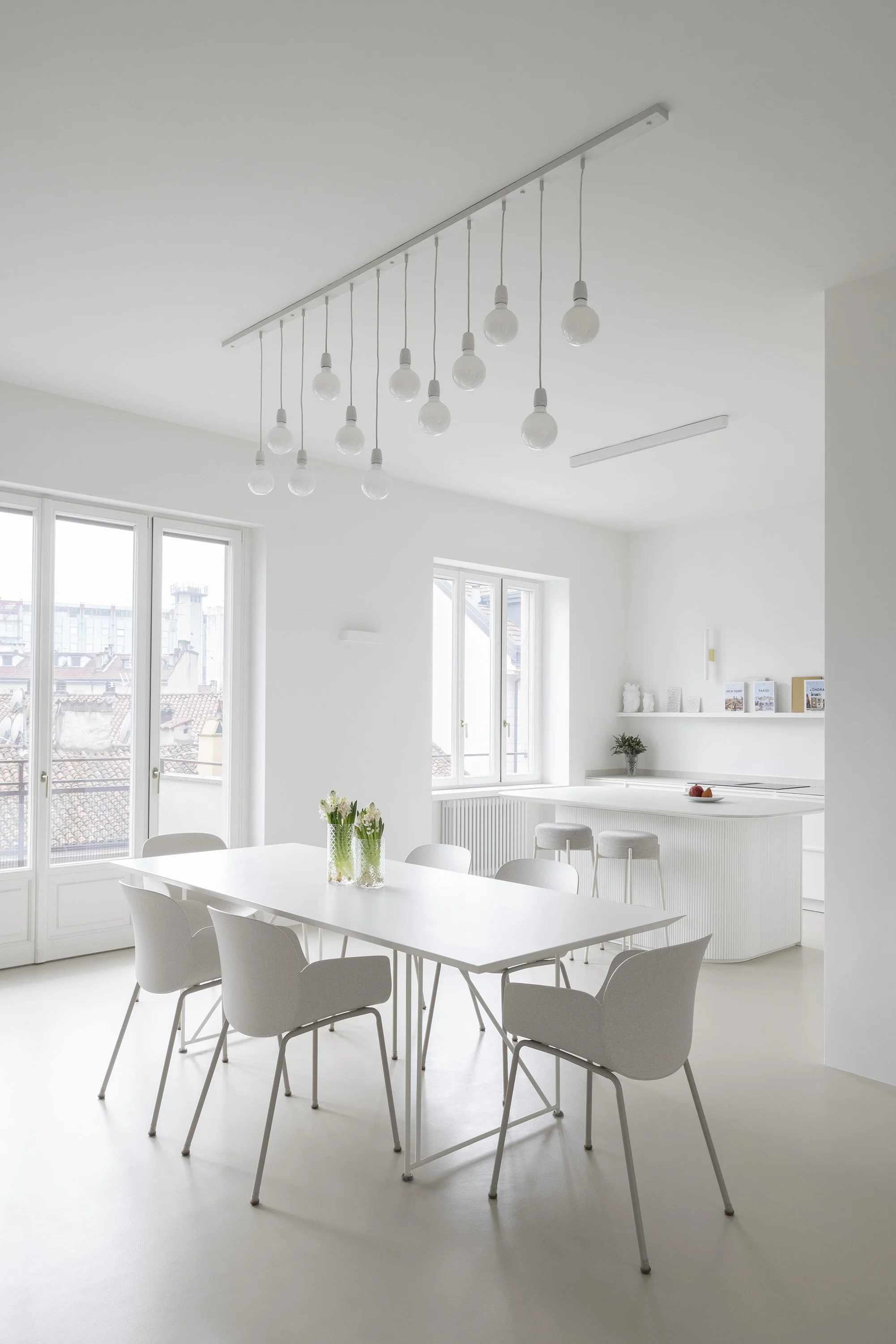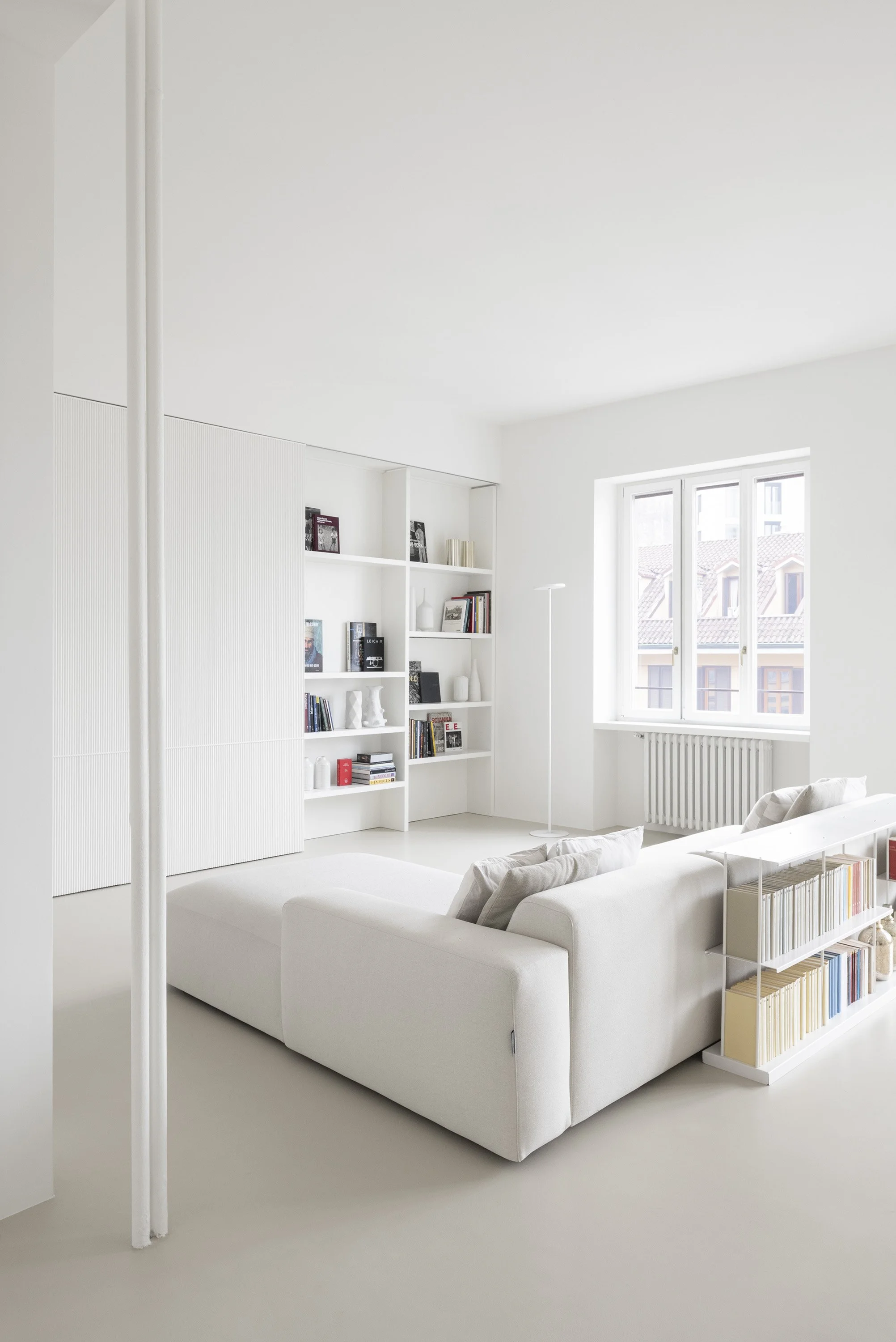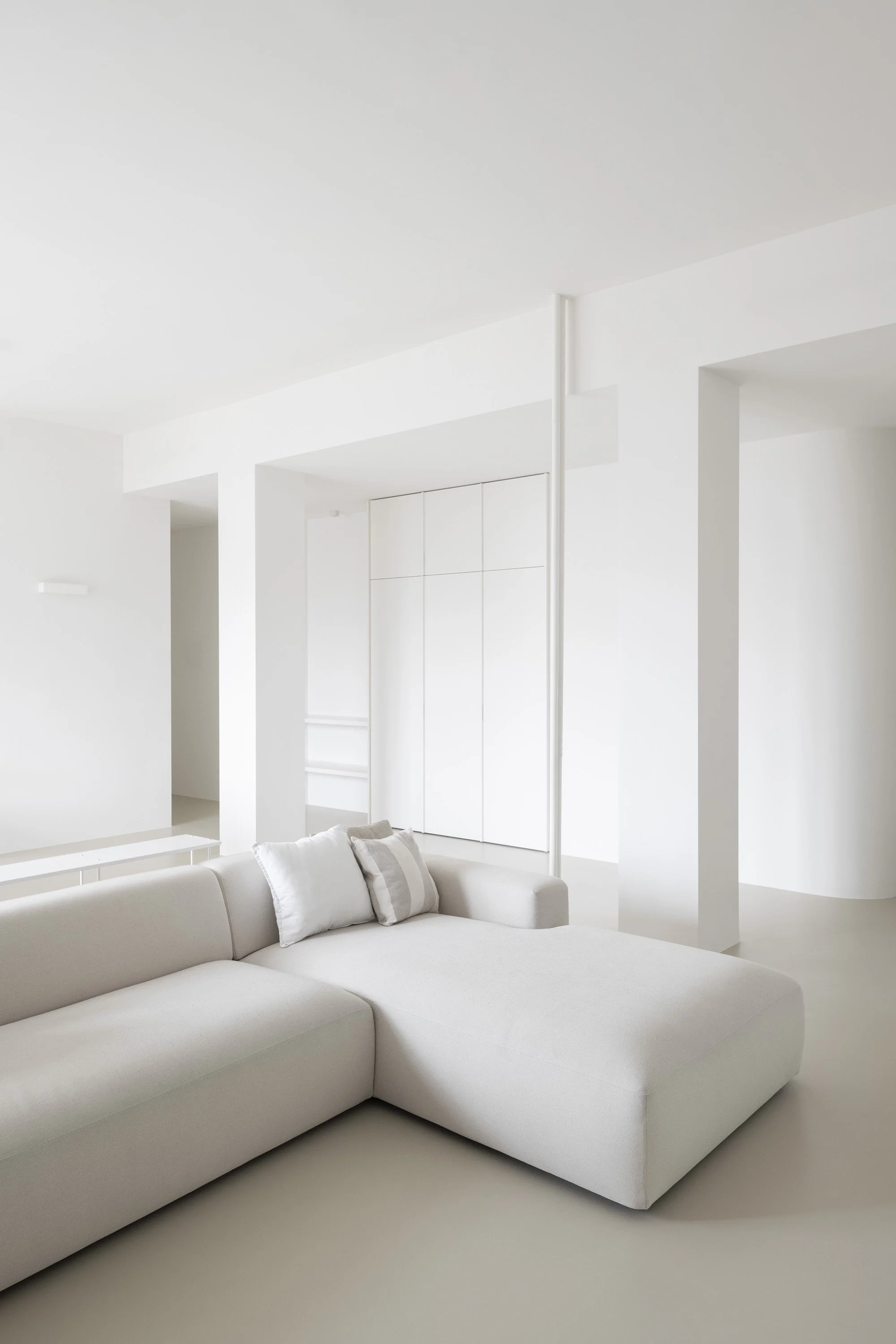 The entrance, set back from the living area, leads into the living room, which extends across the full depth of the apartment and features large windows overlooking the street. Two exposed structural columns define circulation paths and sightlines from the entrance, while also creating spatial continuity between the living, dining, and kitchen areas. Natural light, reflected by continuous light-colored surfaces, floods the space and highlights its volumes.
