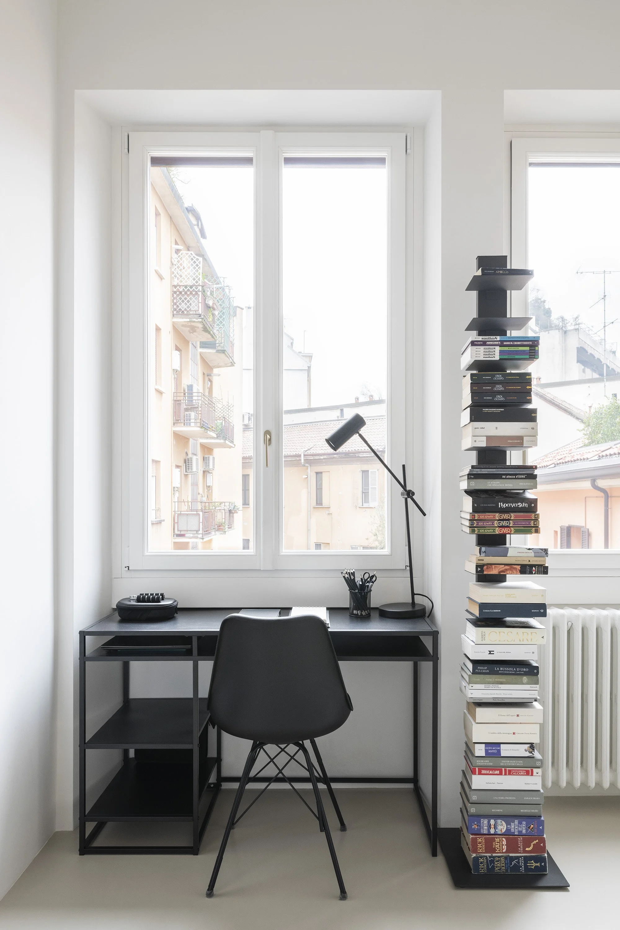 A perfect backdrop for the owners’ passions: books, photography, and music enrich the bookshelves and the small study area. Text description by the architects.