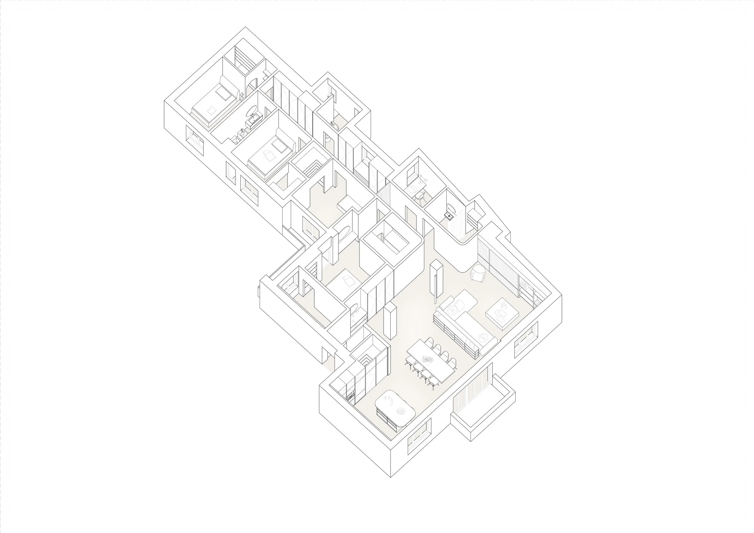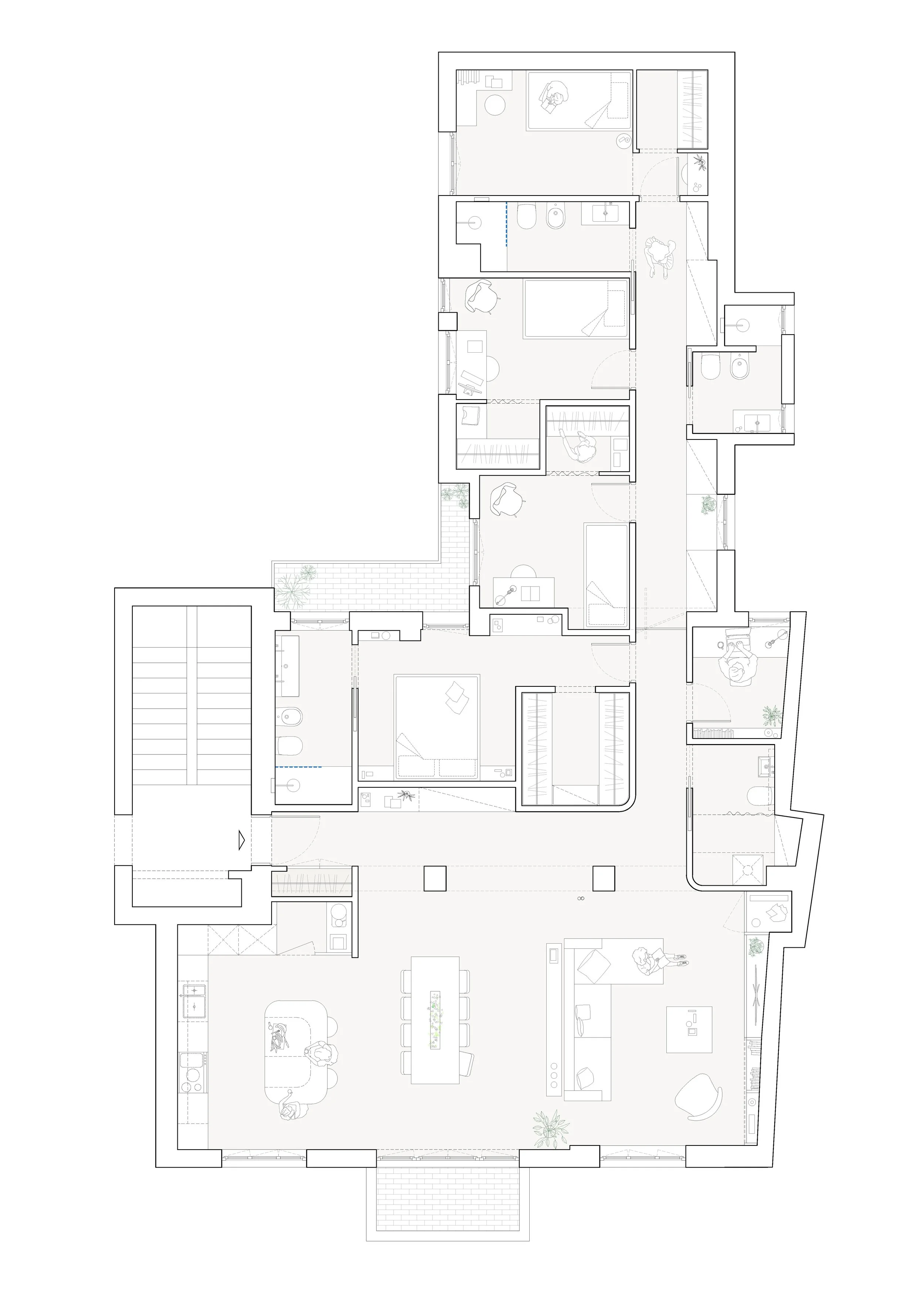The apartment is located in a 1960s building in Milan. Its original condition reflected the needs, tastes, and materials of its time, along with a series of additions and alterations made by previous owners. A long L-shaped corridor with a sequence of rooms, combined with dark flooring and finishes, made the space dim and no longer suited to contemporary living.