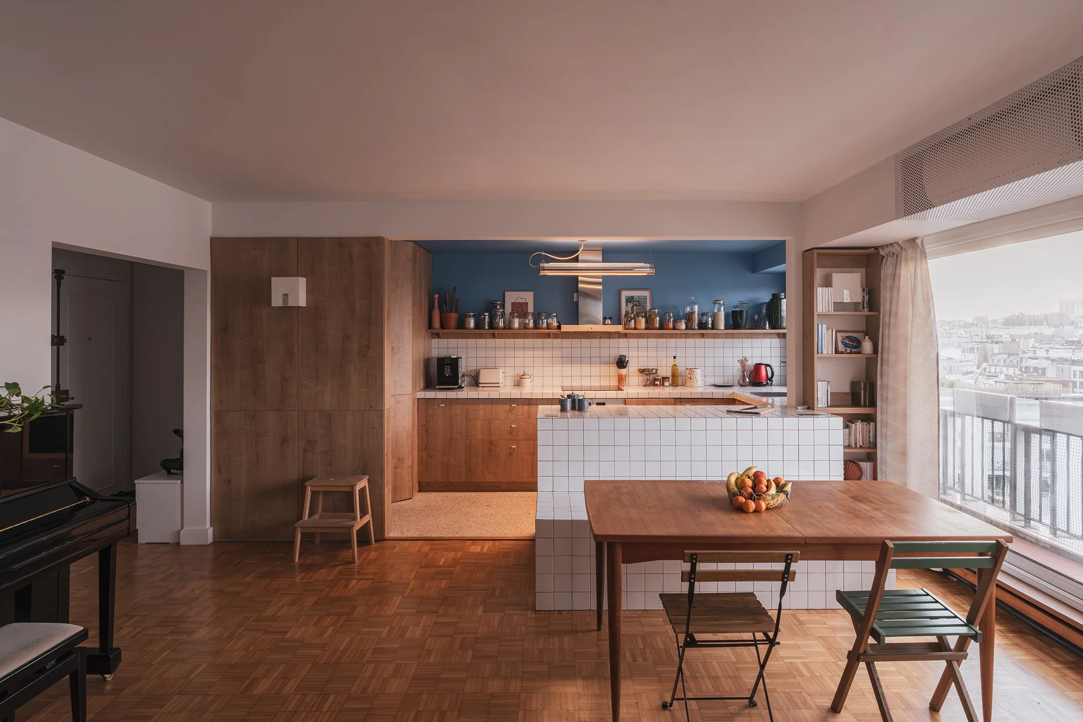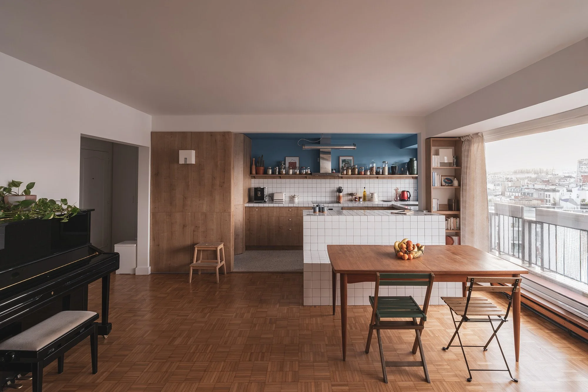 Located on the twelfth floor of a 1970s residential building, the apartment enjoys a rare asset: a fully unobstructed panoramic view, embracing Paris and its distant horizons. The renovation was conceived around this majestic presence of the landscape, while engaging with the reinforced concrete structural grid—both the backbone and the primary constraint of the project.