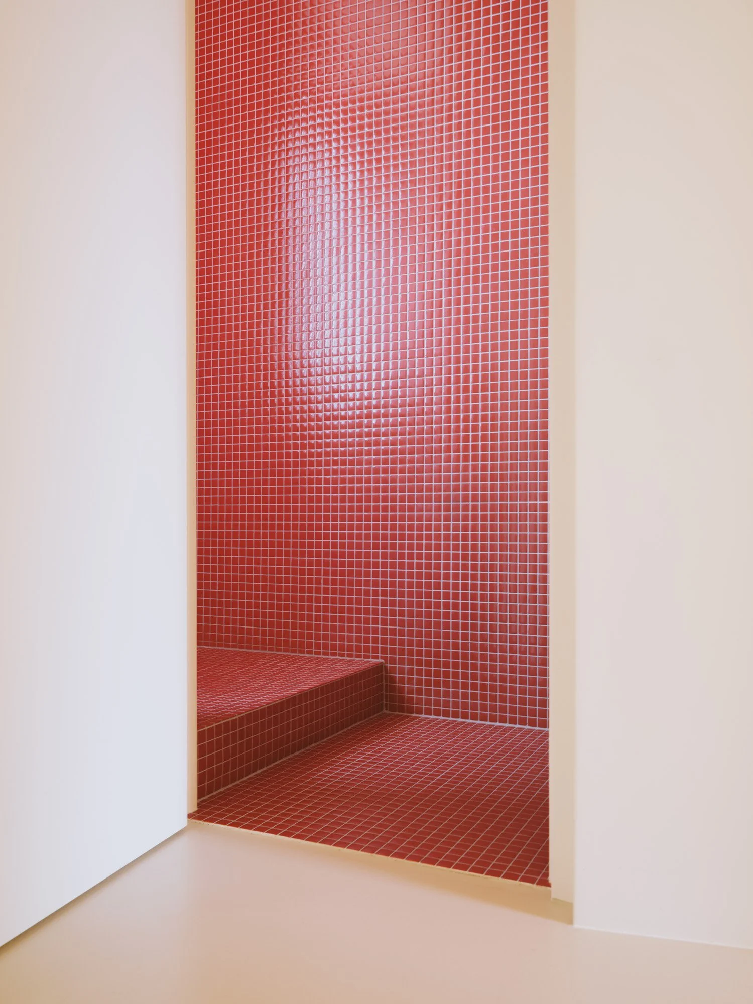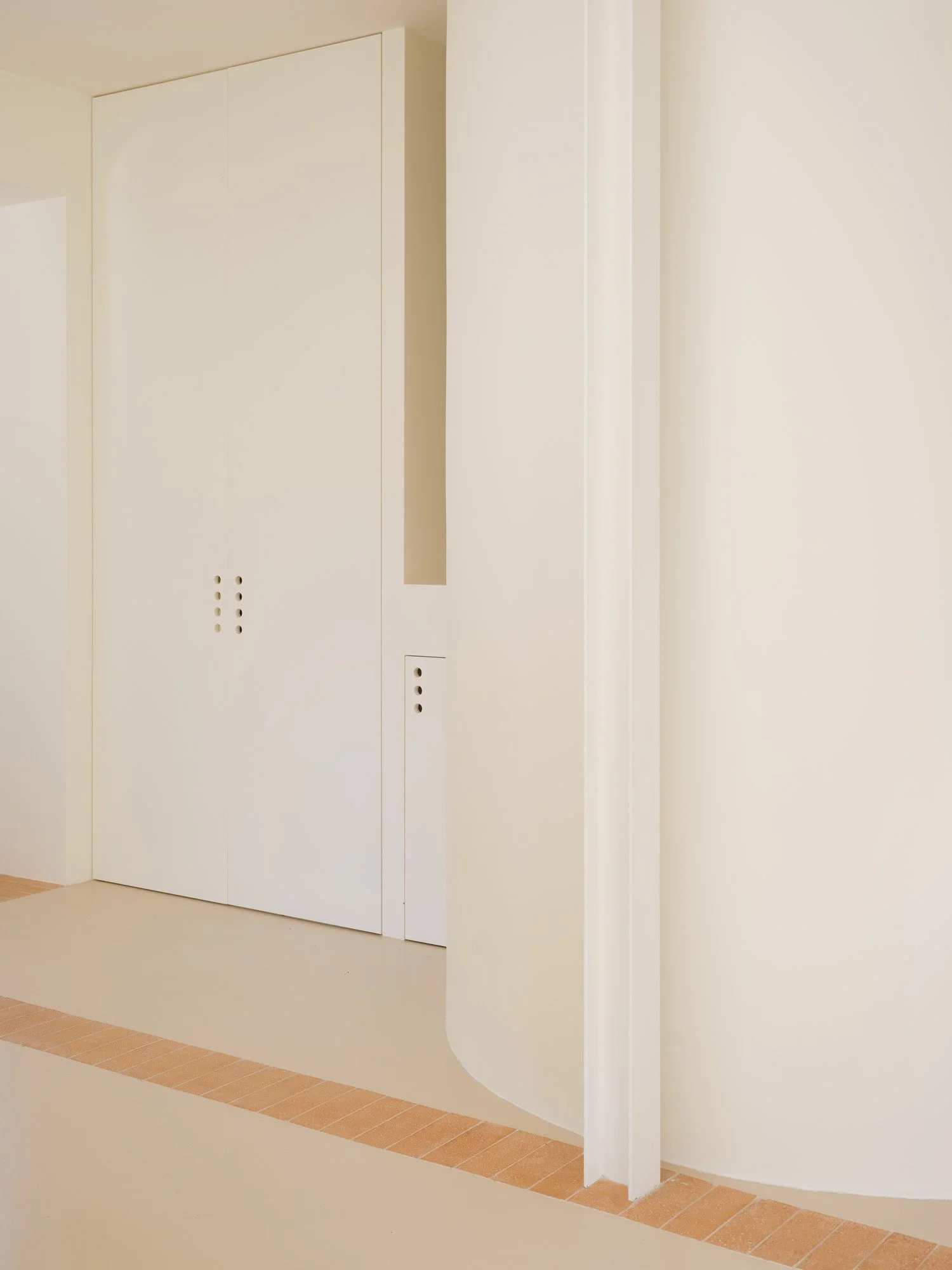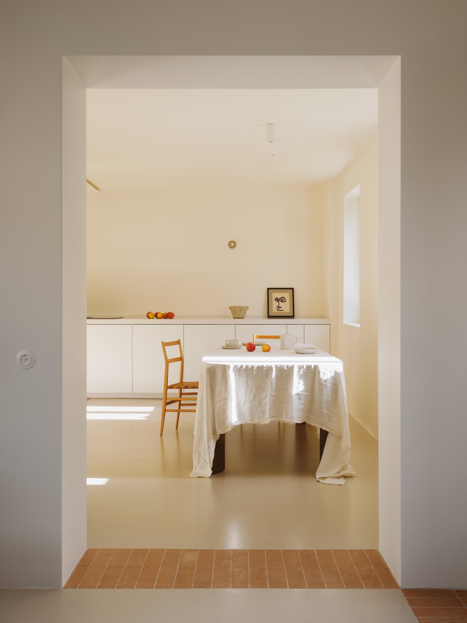 The project embraces a minimalist approach, expressed through simple and consistent materials, notably a continuous, uniform floor, punctuated by a few interventions in pink terracotta. This material palette unifies the spaces and establishes a warm, luminous atmosphere.
