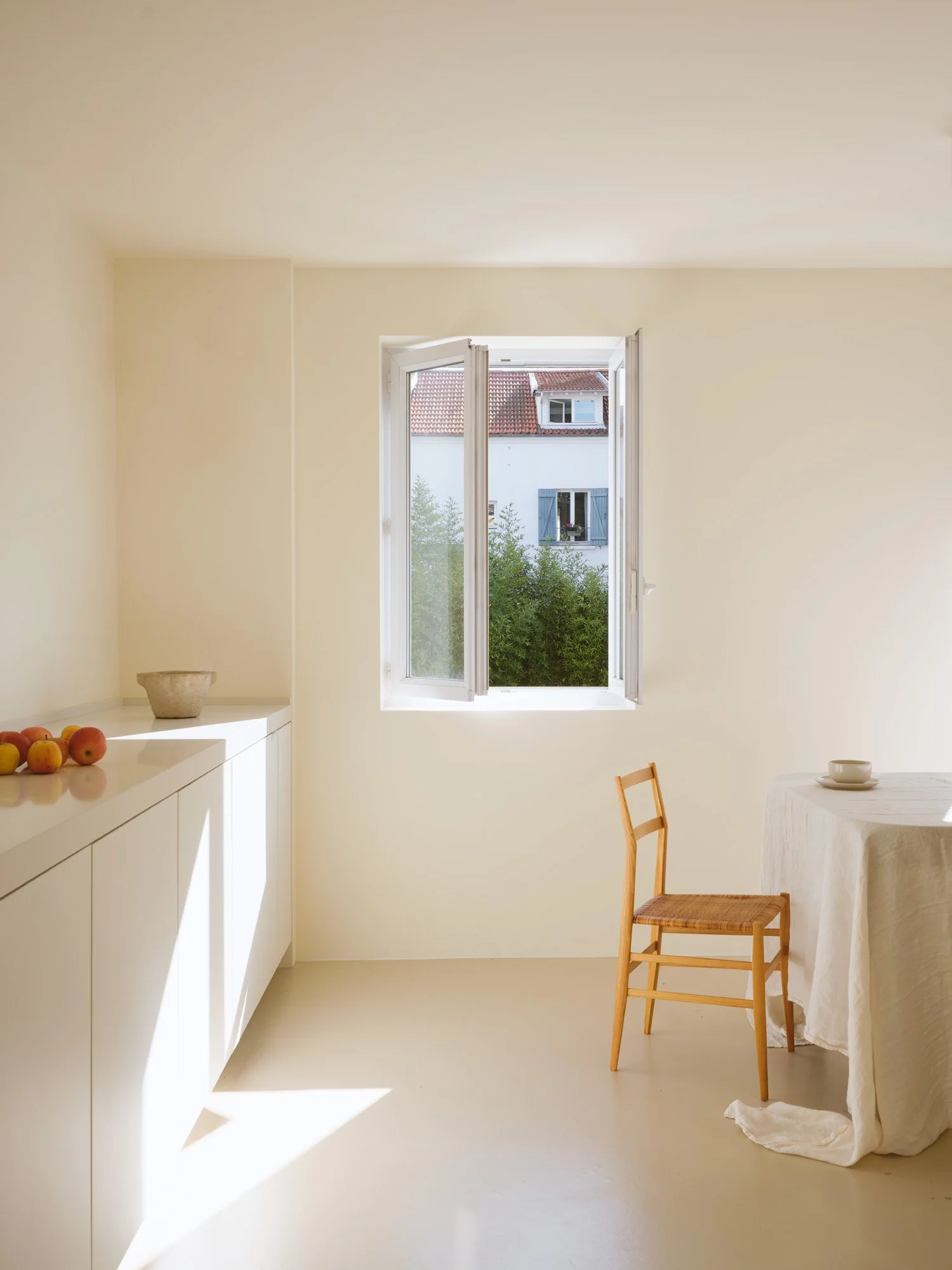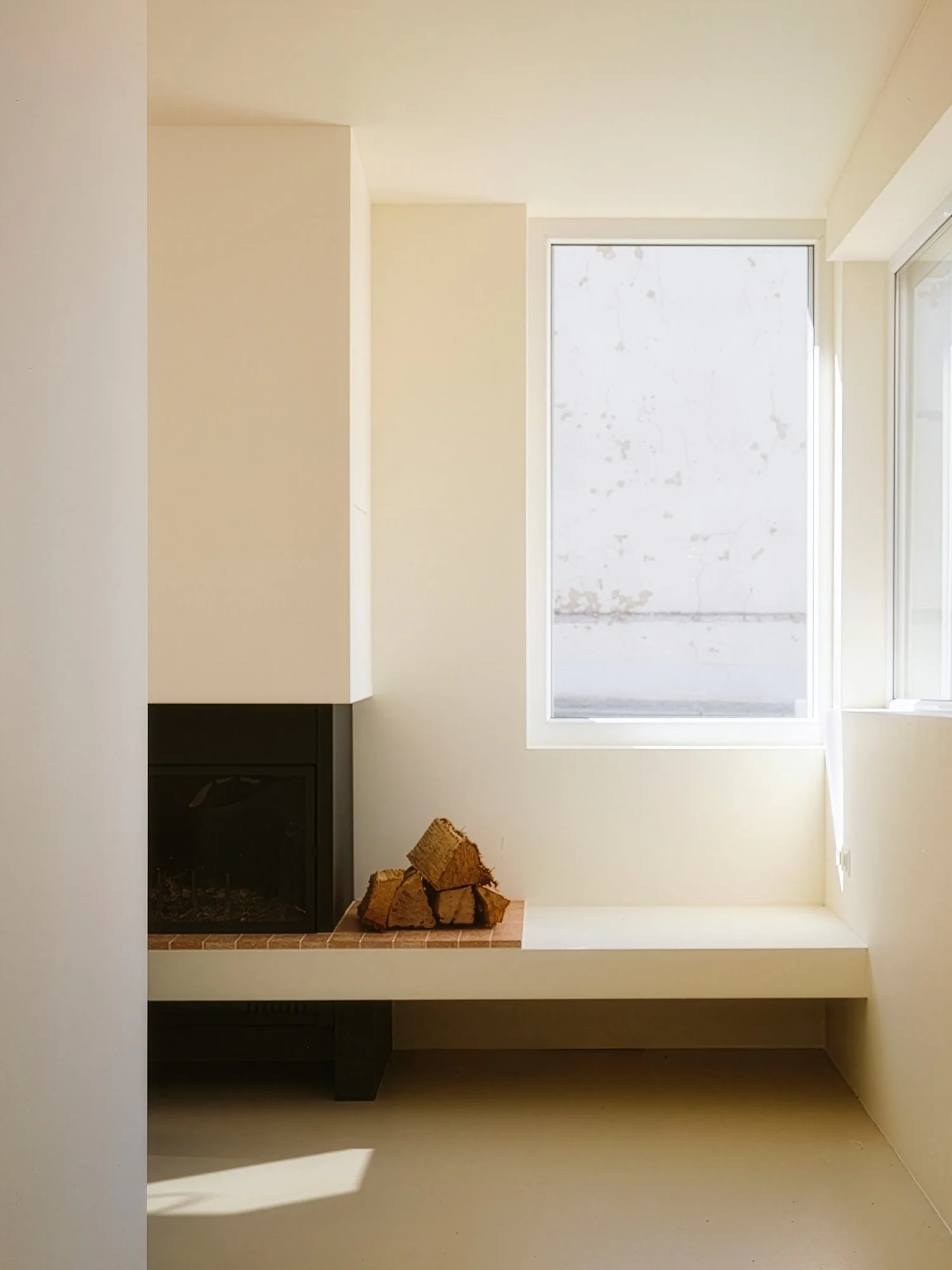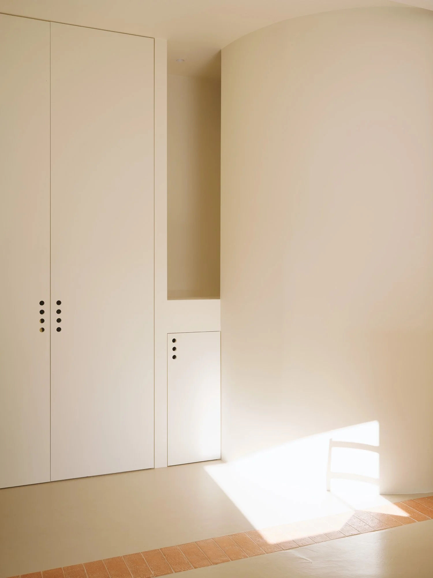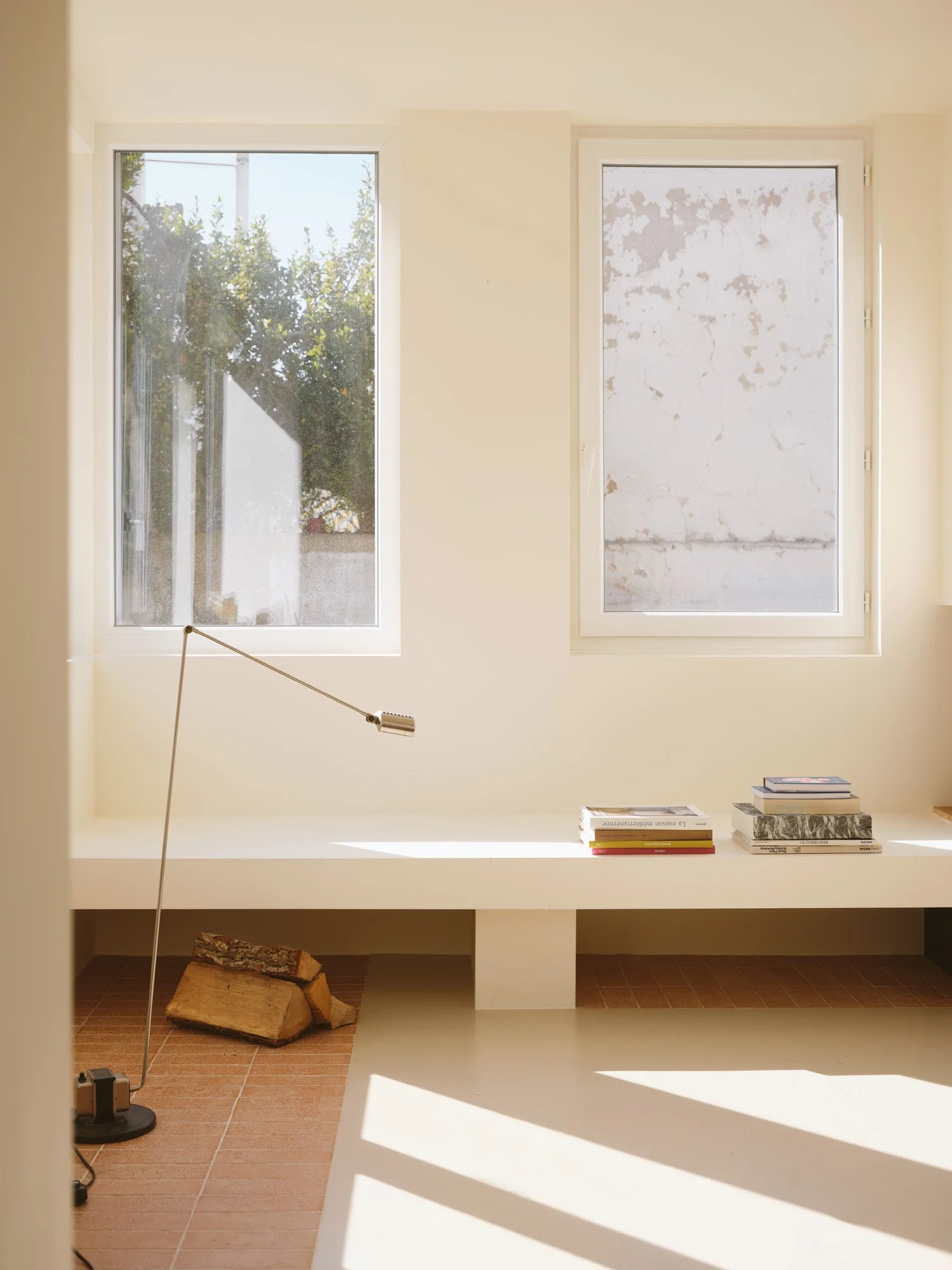 The project embraces a minimalist approach, expressed through simple and consistent materials, notably a continuous, uniform floor, punctuated by a few interventions in pink terracotta. This material palette unifies the spaces and establishes a warm, luminous atmosphere.