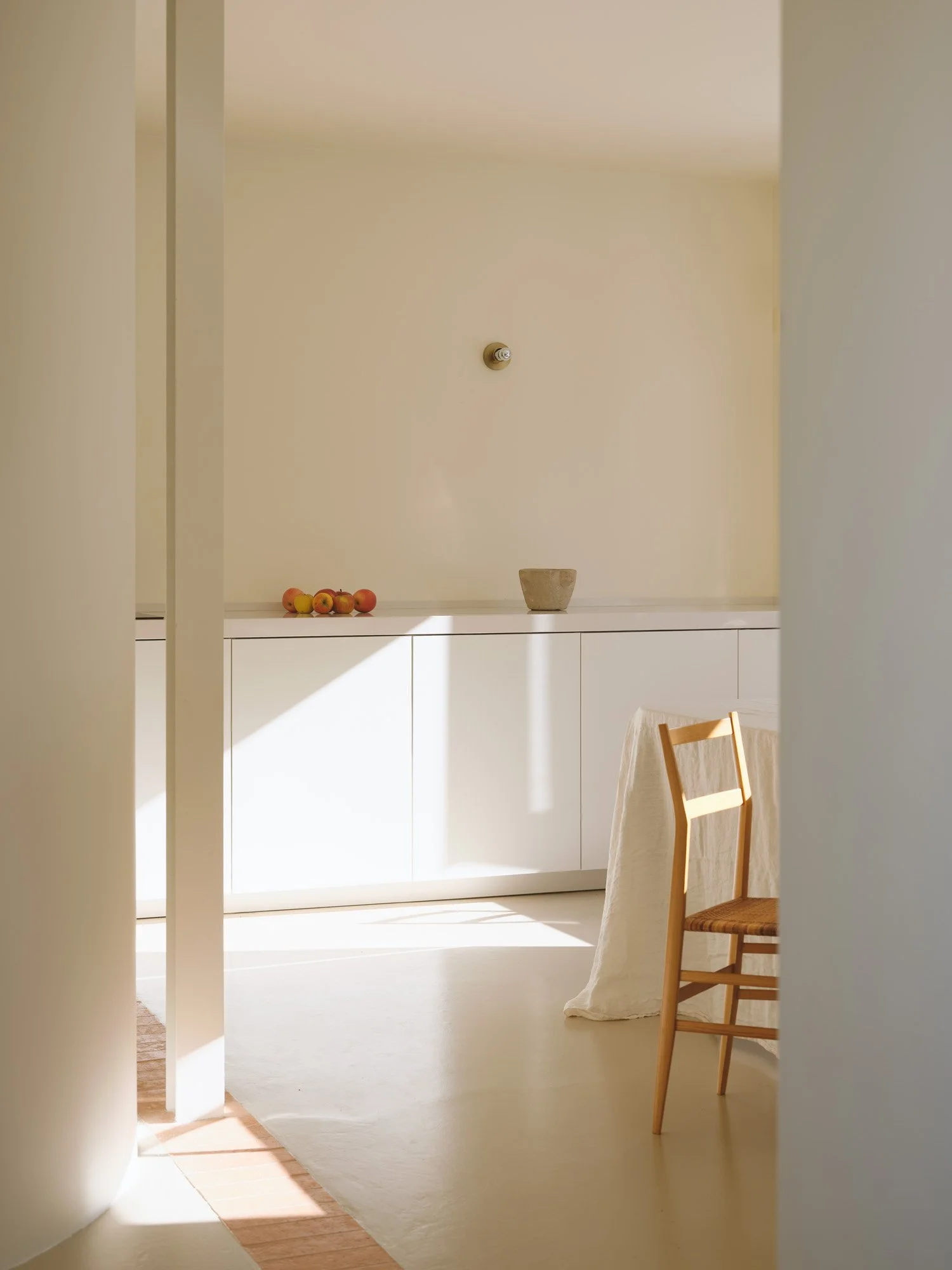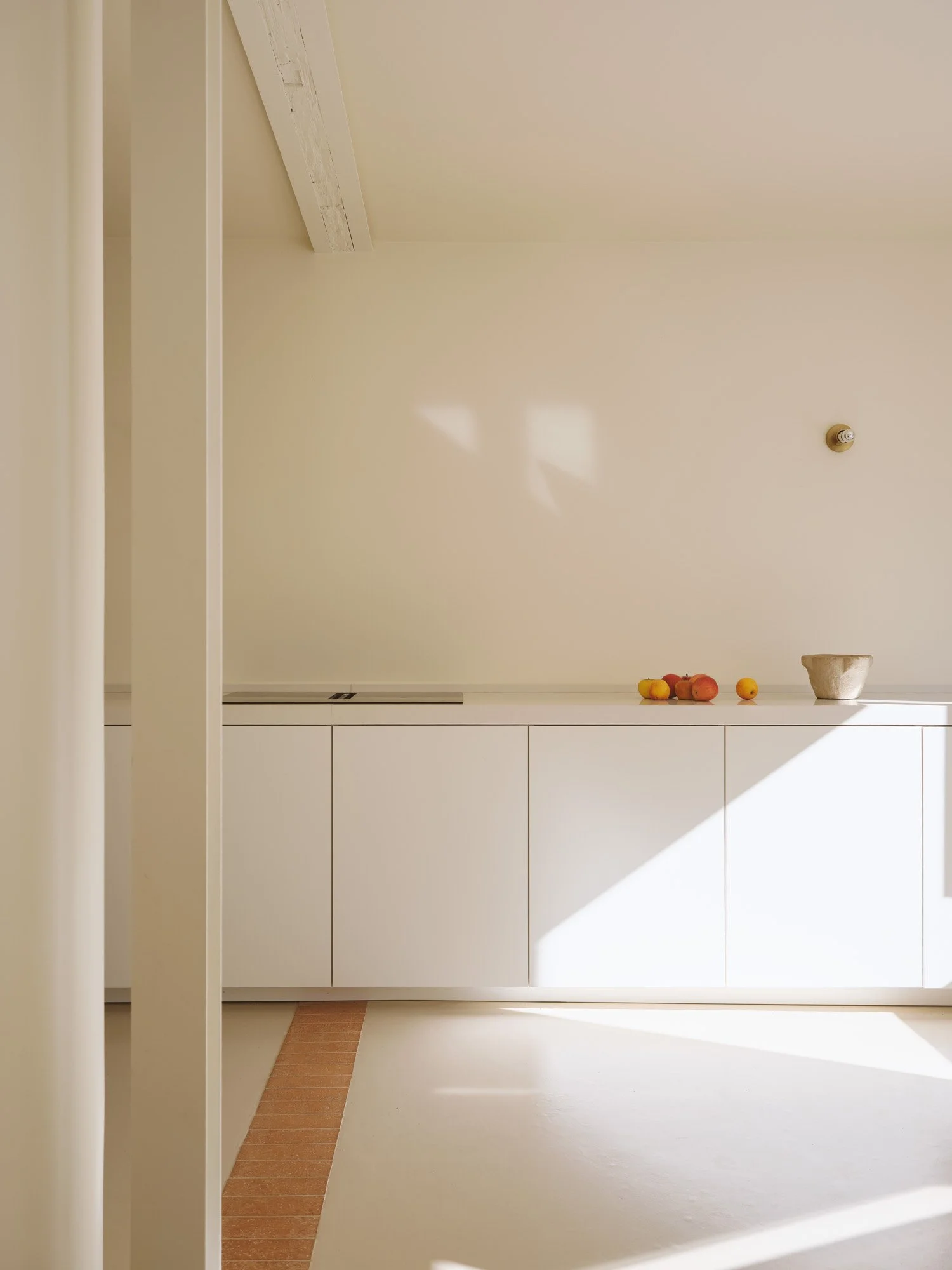 On the ground floor, the kitchen is developed as a long, low linear element connecting the two façades, creating through-views and reinforcing the spatial continuity of the ground-floor living areas.