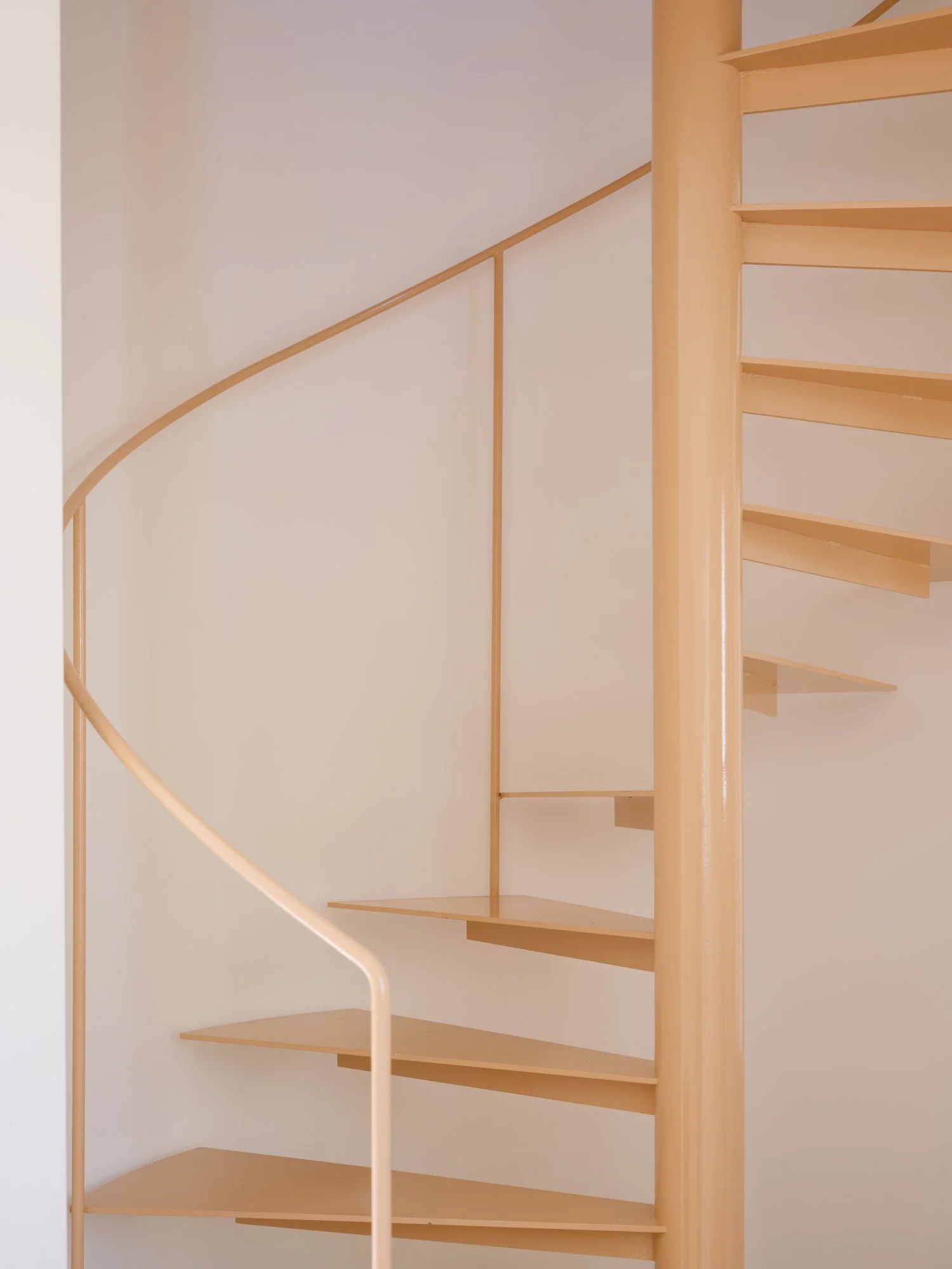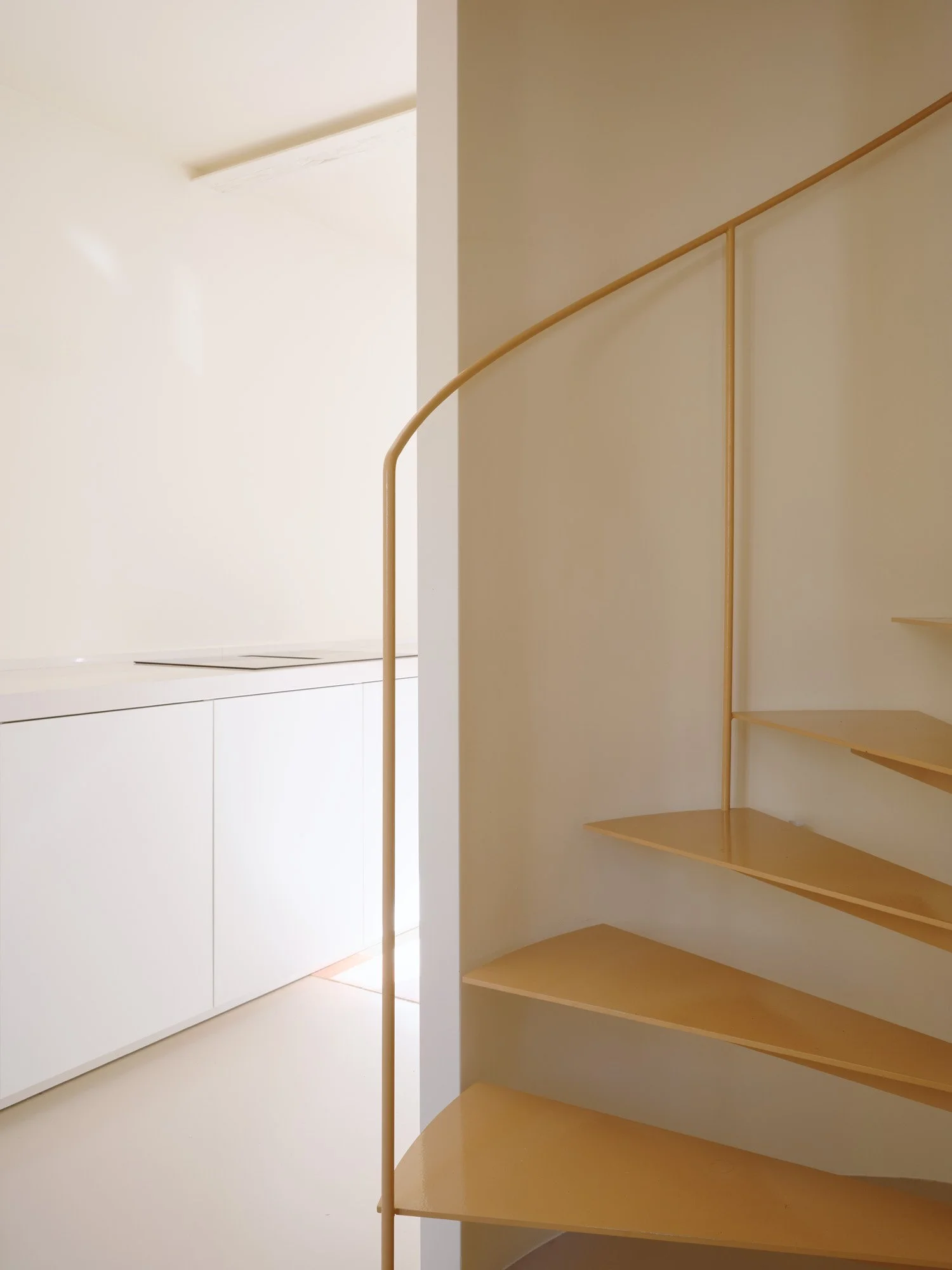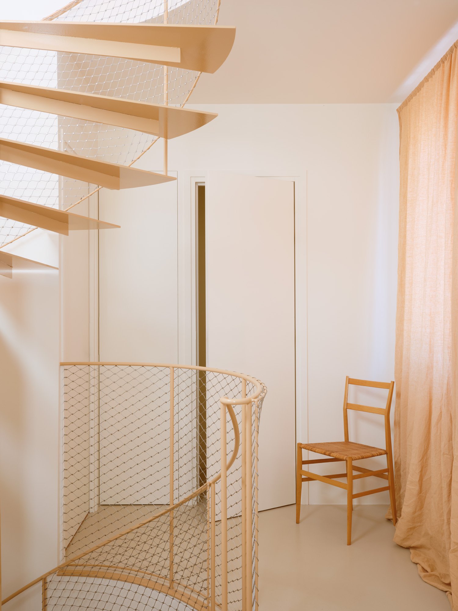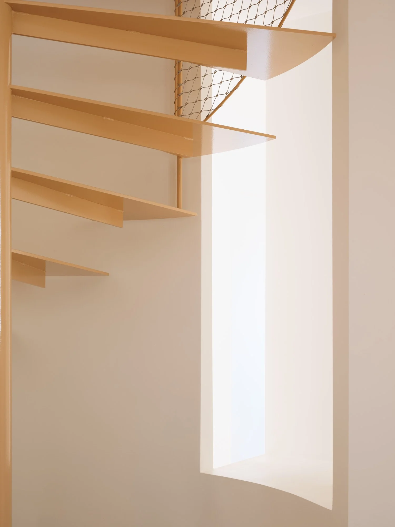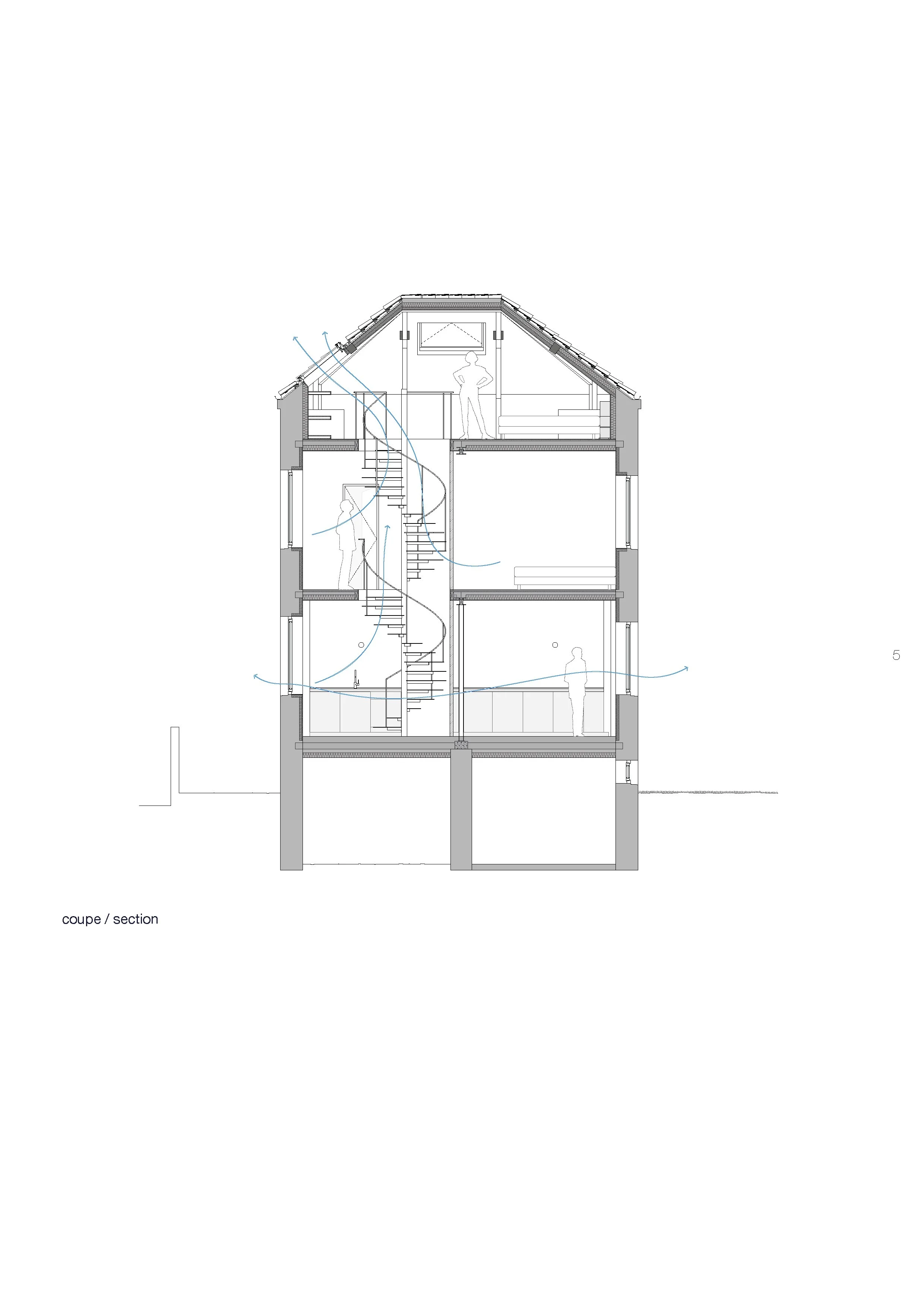 This opening of the plan allows for the insertion of a metal spiral staircase at the center of the house, creating a vertical connection to the previously unused attic space. The staircase’s simple geometry and light lines structure the spaces and provide natural vertical ventilation, encouraging the circulation of air and light throughout the house.