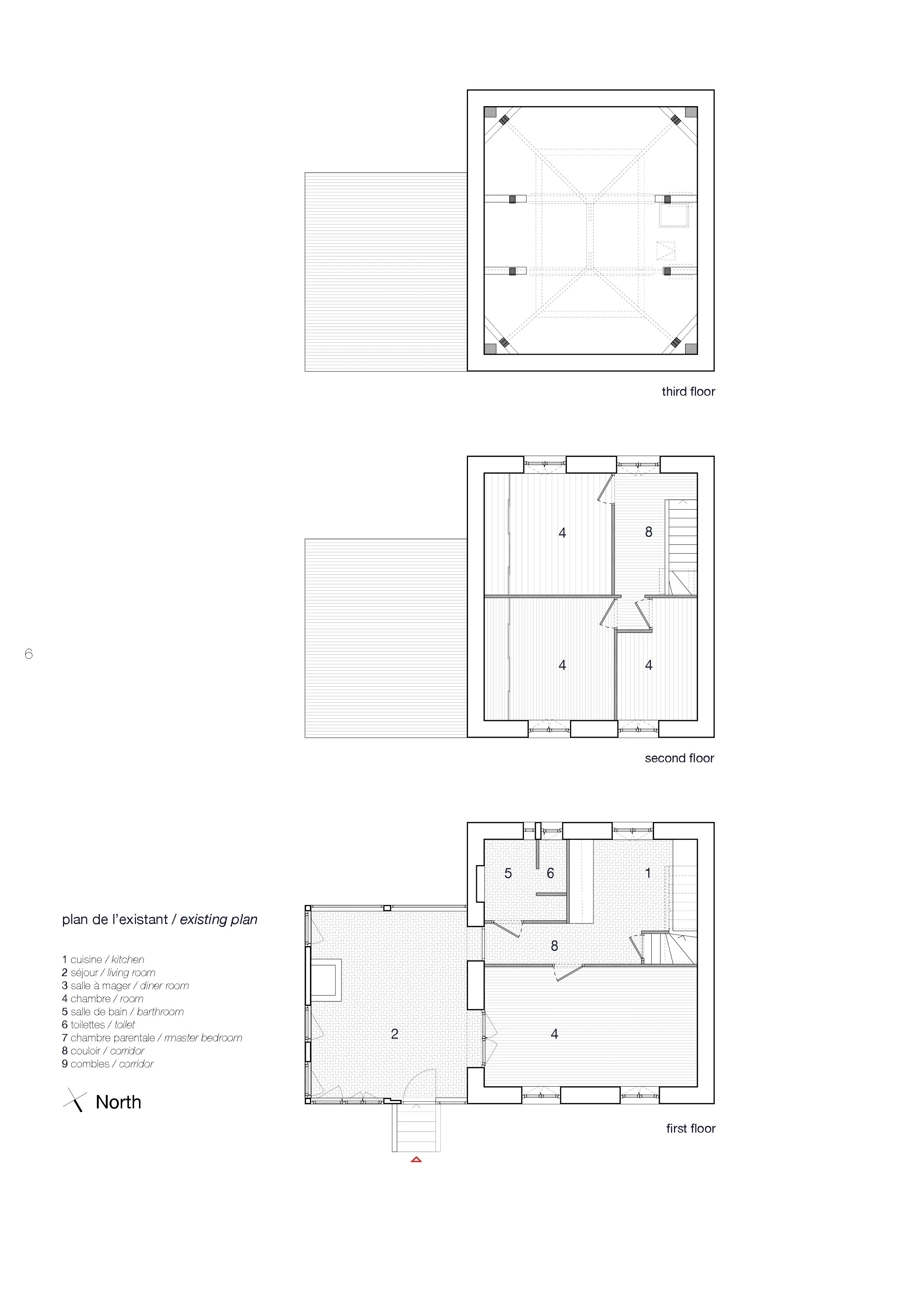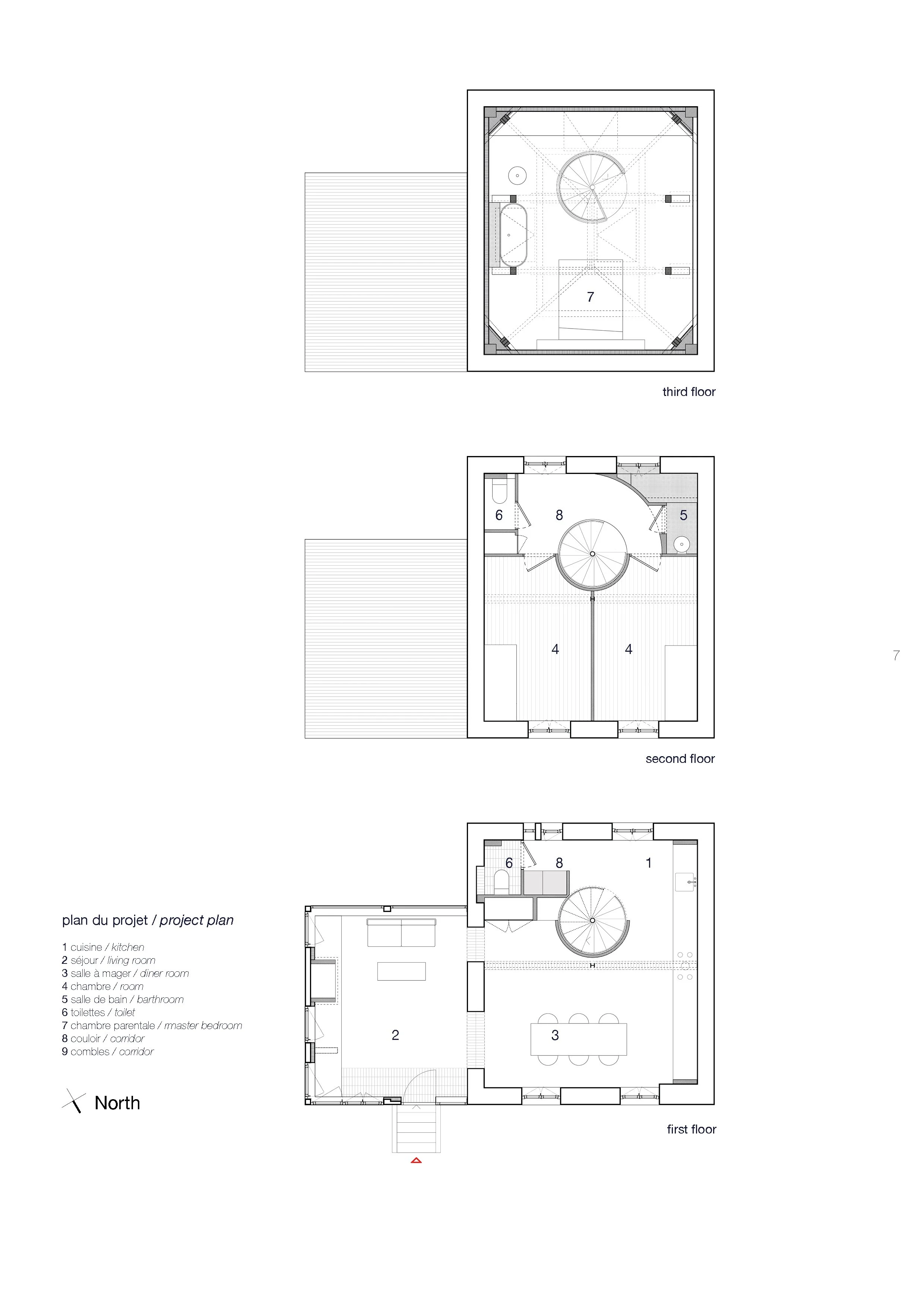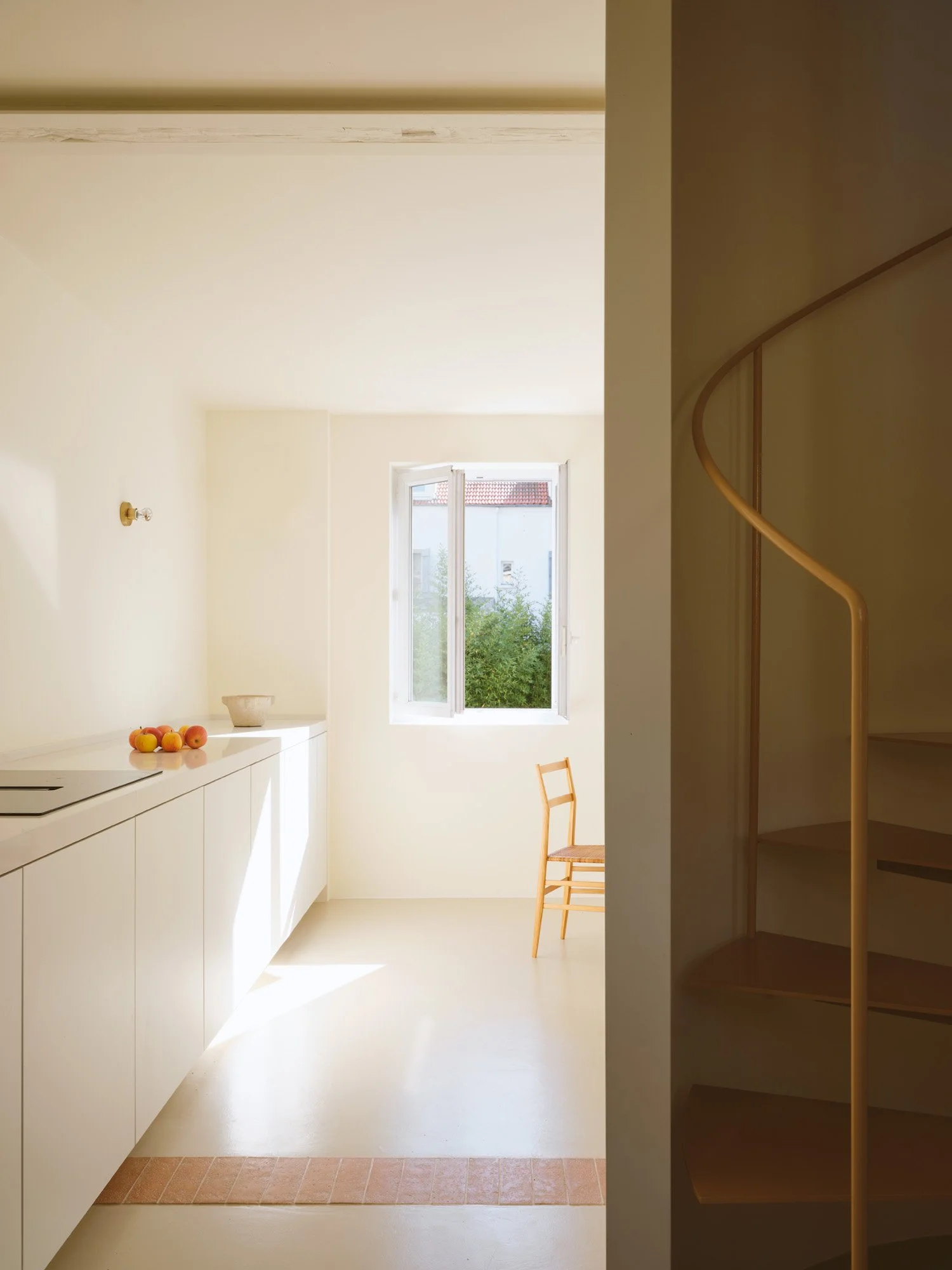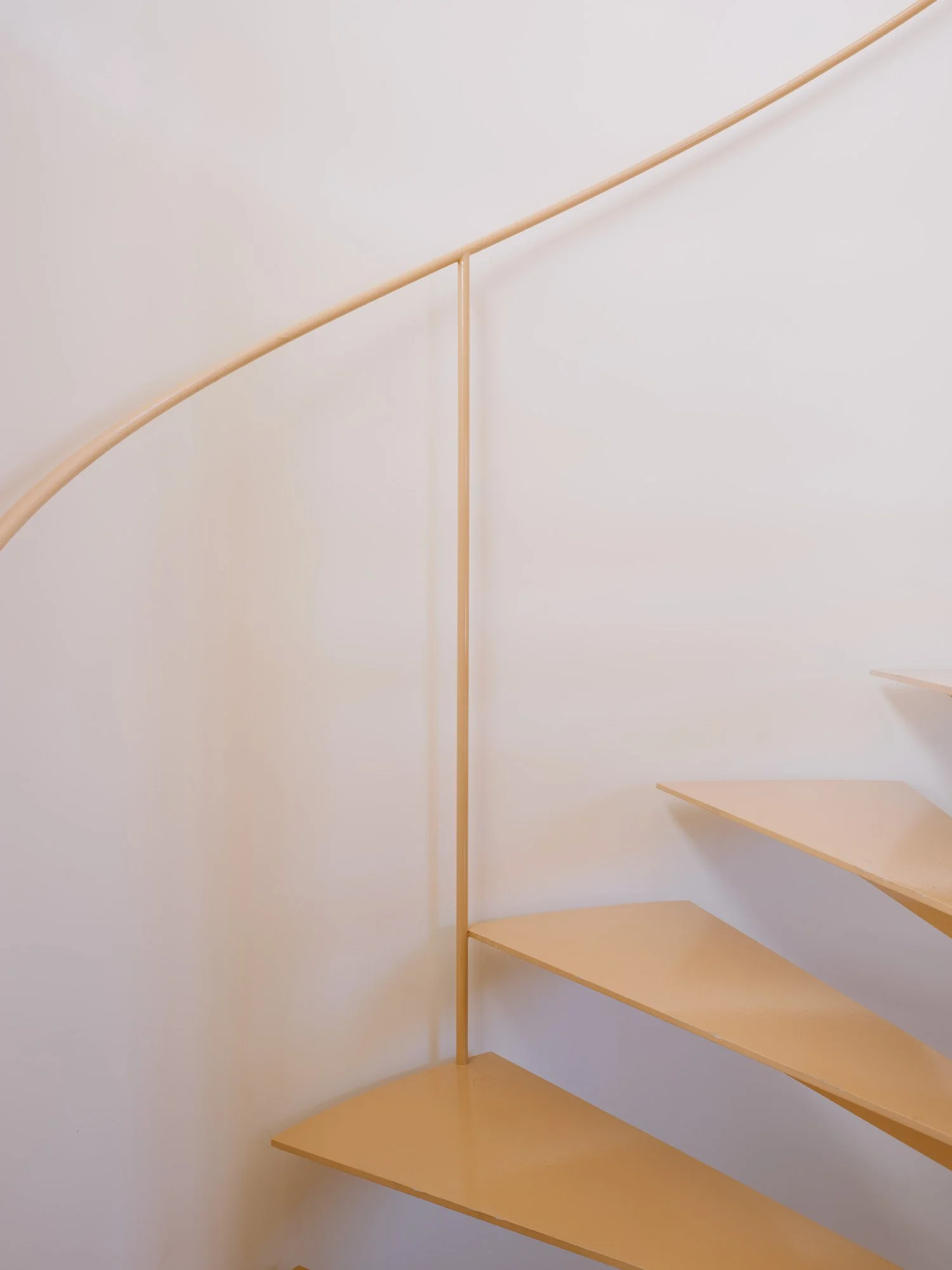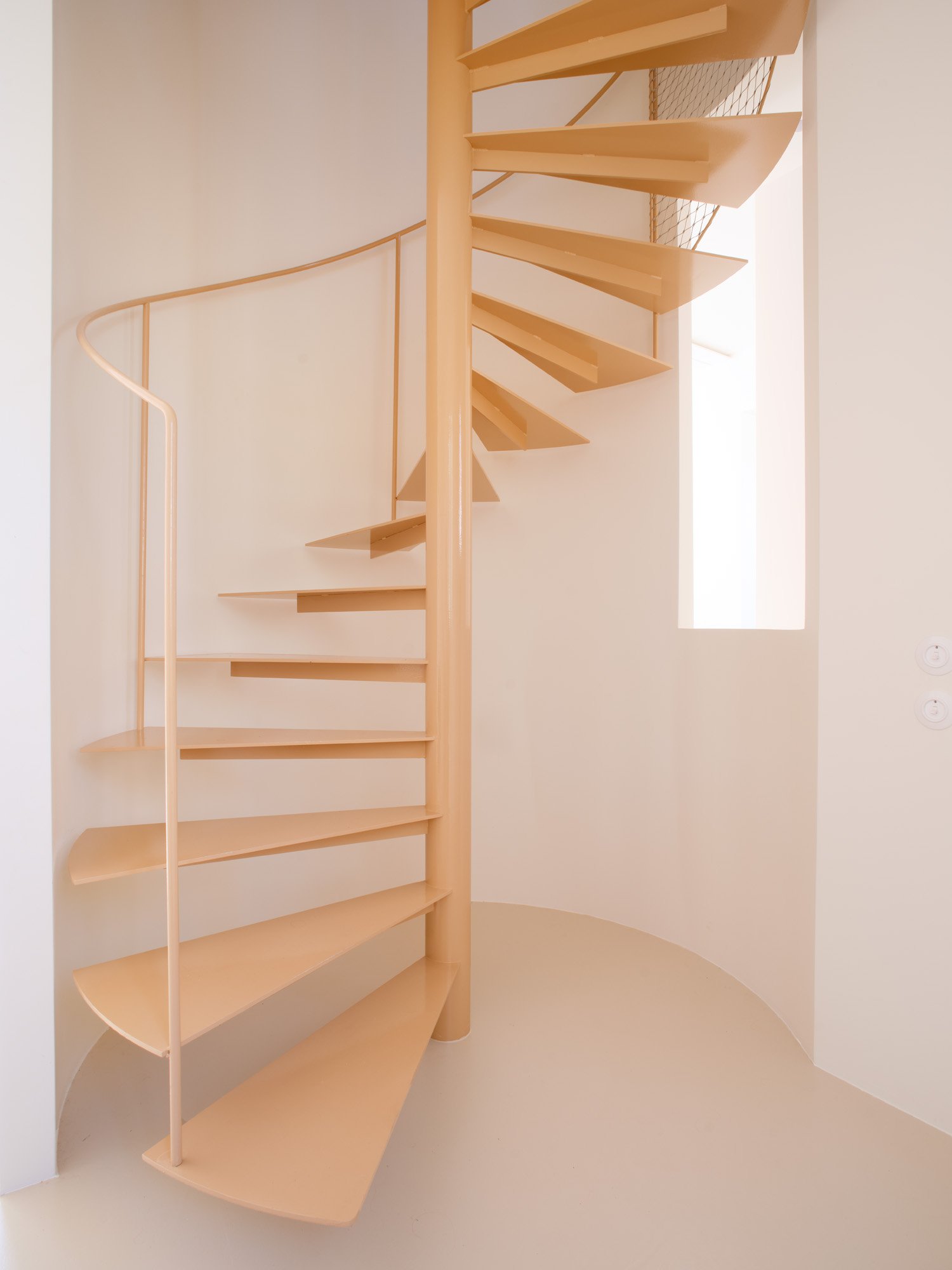 This opening of the plan allows for the insertion of a metal spiral staircase at the center of the house, creating a vertical connection to the previously unused attic space. The staircase’s simple geometry and light lines structure the spaces and provide natural vertical ventilation, encouraging the circulation of air and light throughout the house.