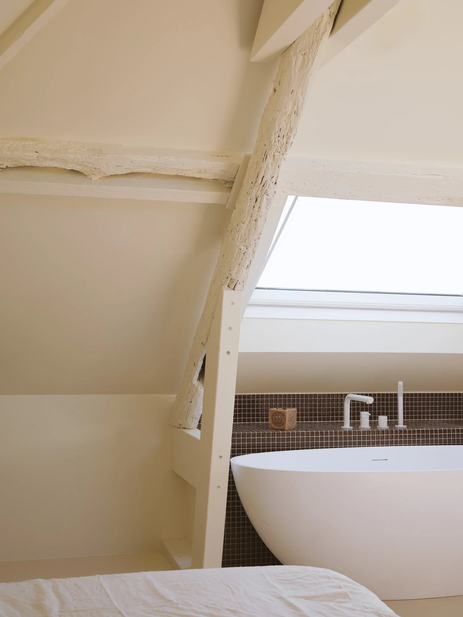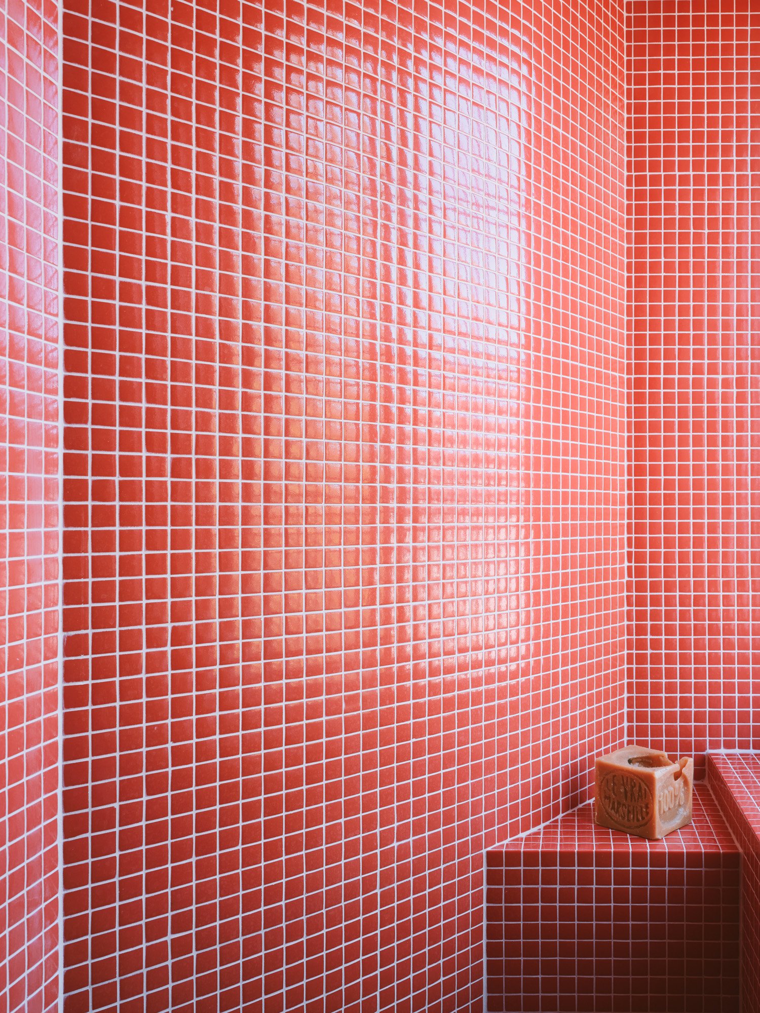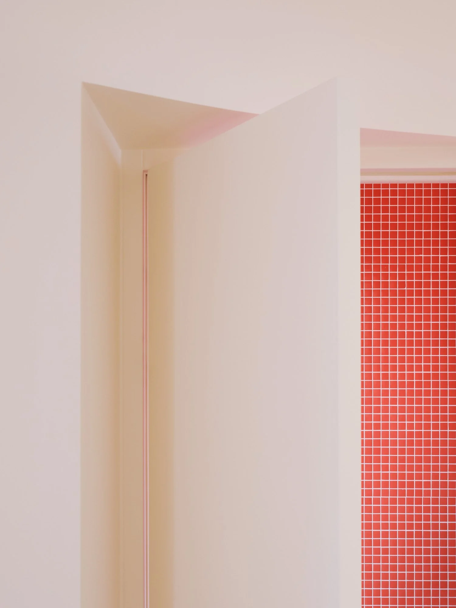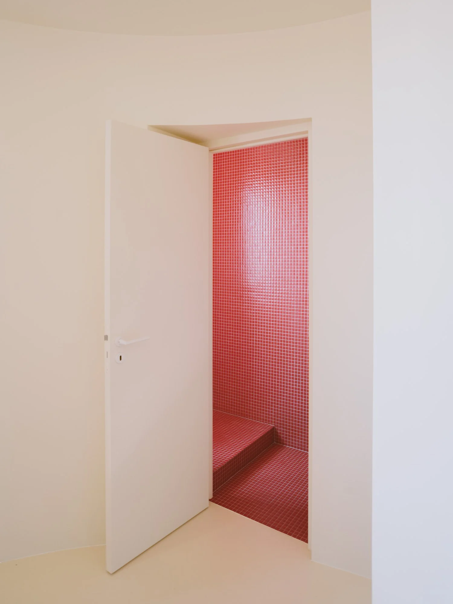 This restrained ambience is animated by a few distinct color accents, including the metal staircase in a soft pink tone and the children’s bathroom entirely clad in red-orange mosaic tiles; it extends and reinterprets the warm tonalities of the overall project. Text description by the architects.