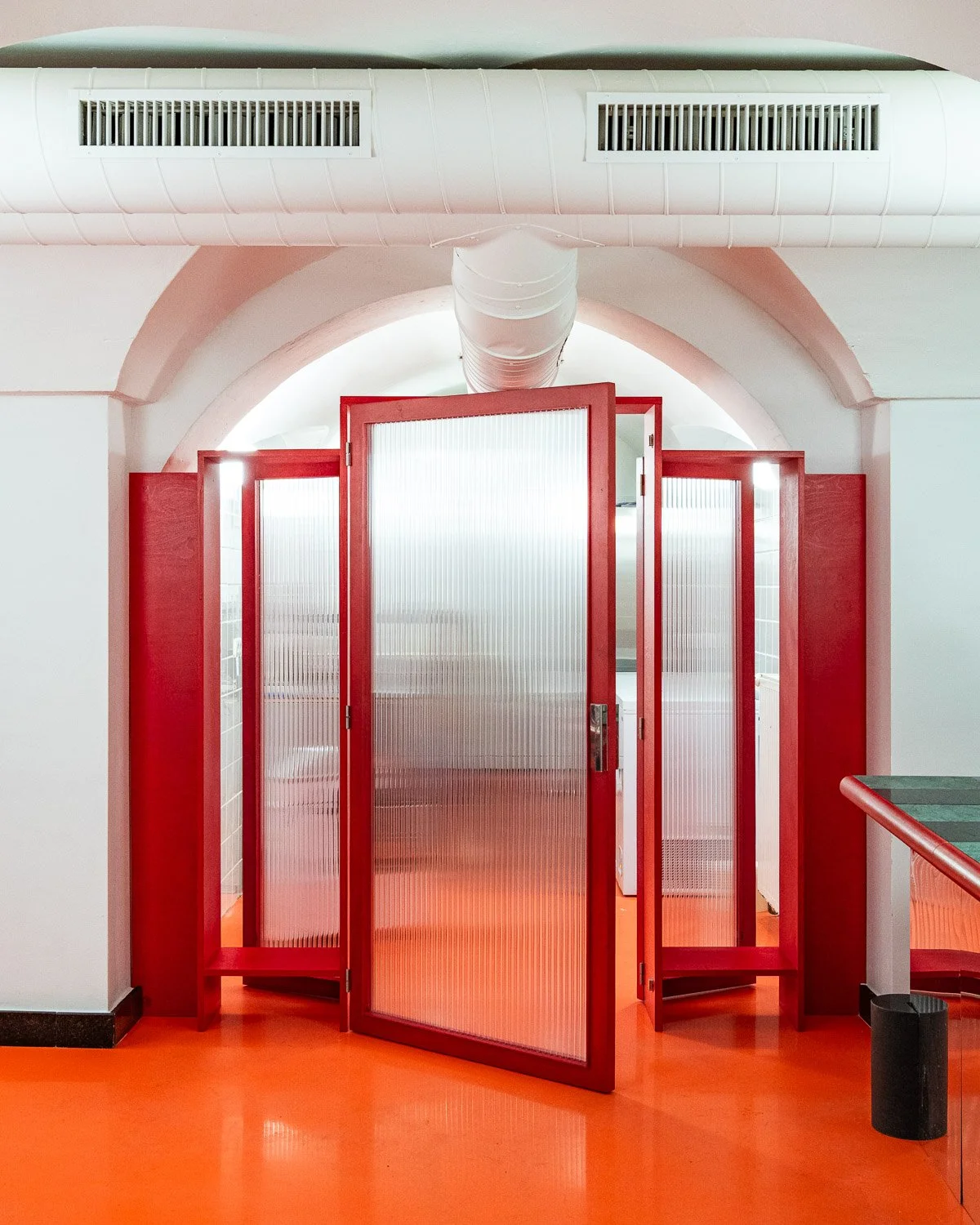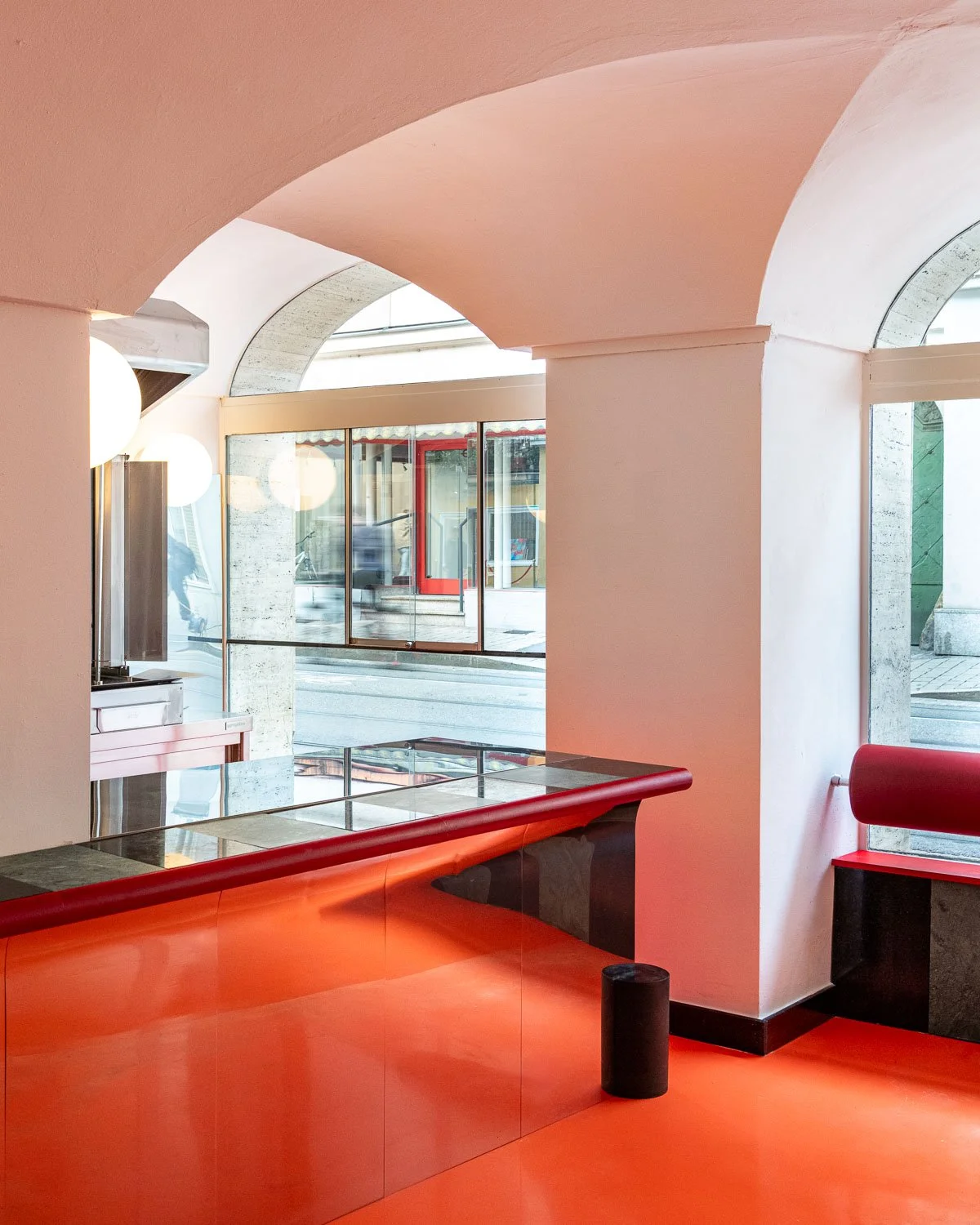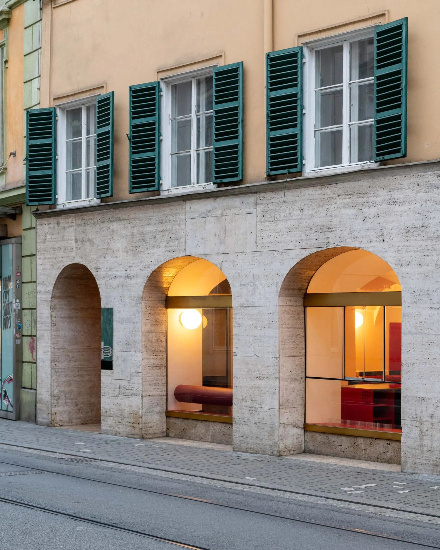 We make use of inexpensive yet effective means to create spatial impact — color and light. Through them, the space gains presence within the dynamics of the urban environment. At a location defined by constant movement — trams, cyclists, pedestrians. Otherwise, nothing hints at anything new from the outside — except for a subtle “repair” on the façade. Text description by the architects.