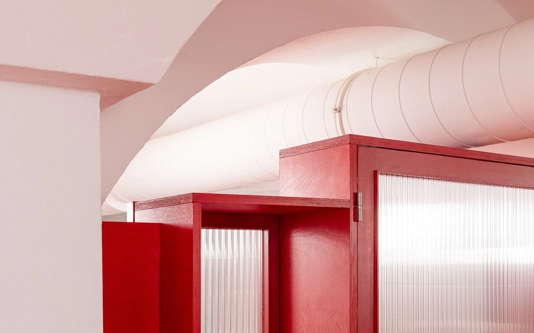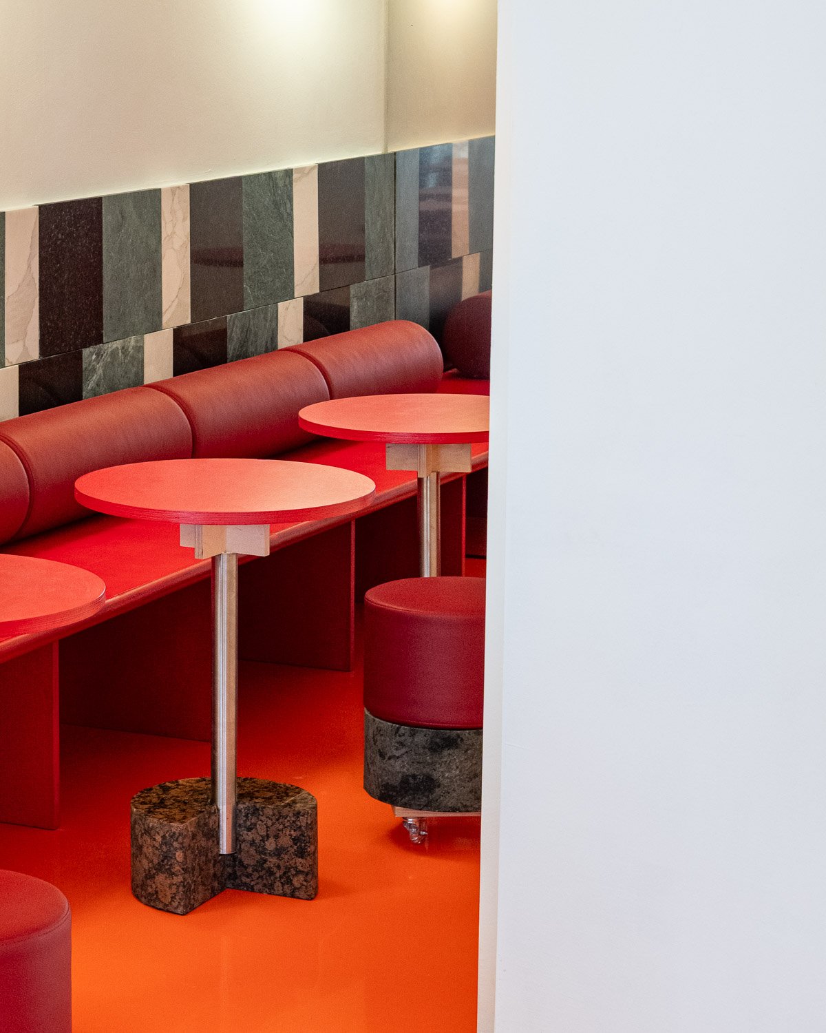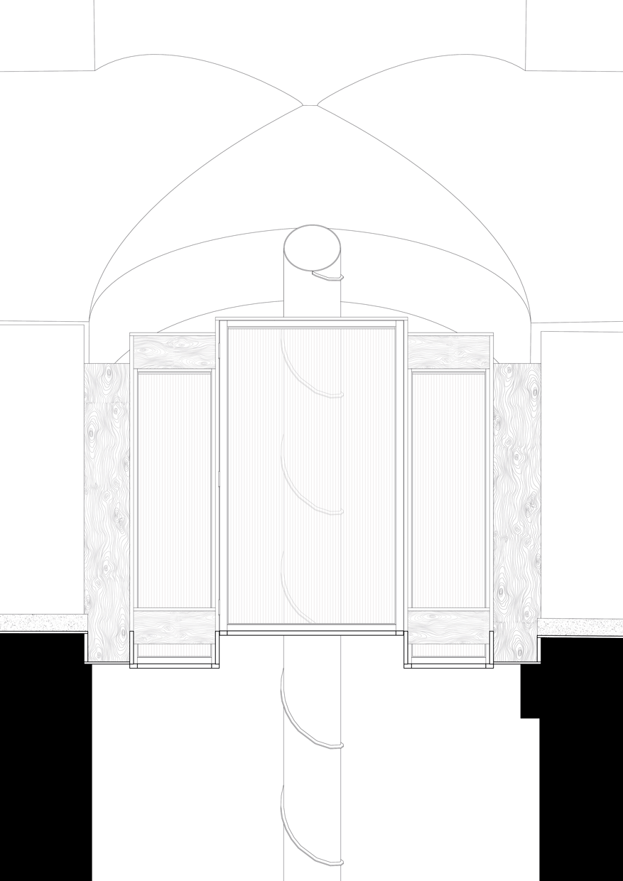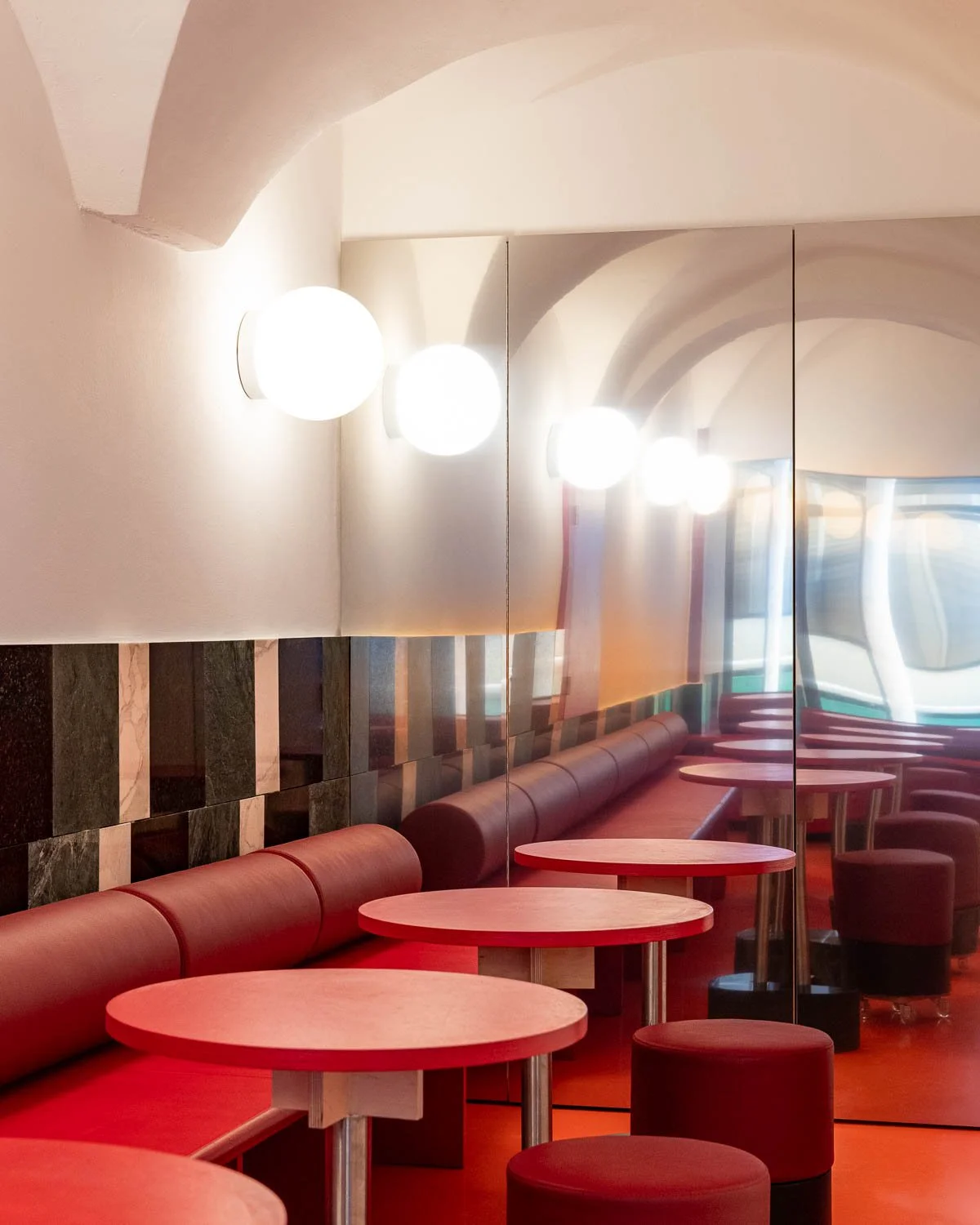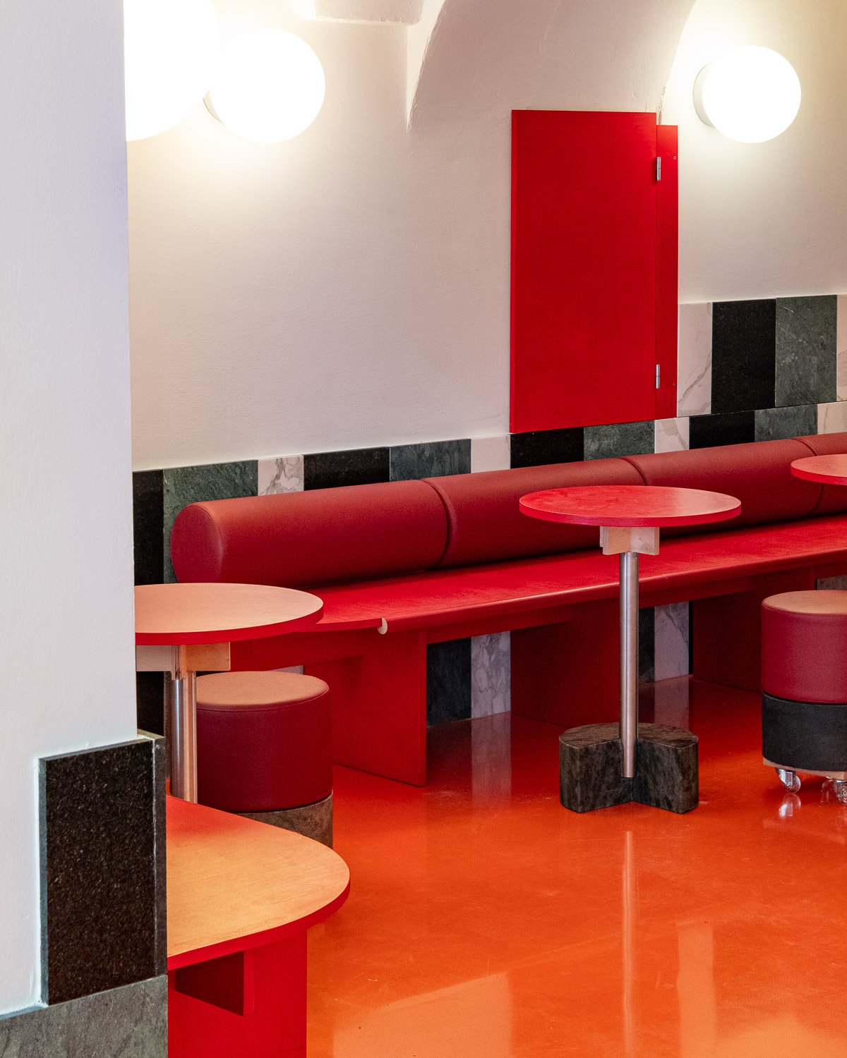 The new elements and layers unfold in dialogue with what was found. The counter follows the rotation of the structure, opening up into the space. A volumetric portal mediates between different functions, spatial zones and elements — wall, ceiling, ventilation. Benches and built-in structures make use of existing niches and the deep, narrow space. The layout traces the workflows of the kebab shop. Reflections and mirrored surfaces amplify the sense of movement. Within it, differentiated spatial impressions emerge.