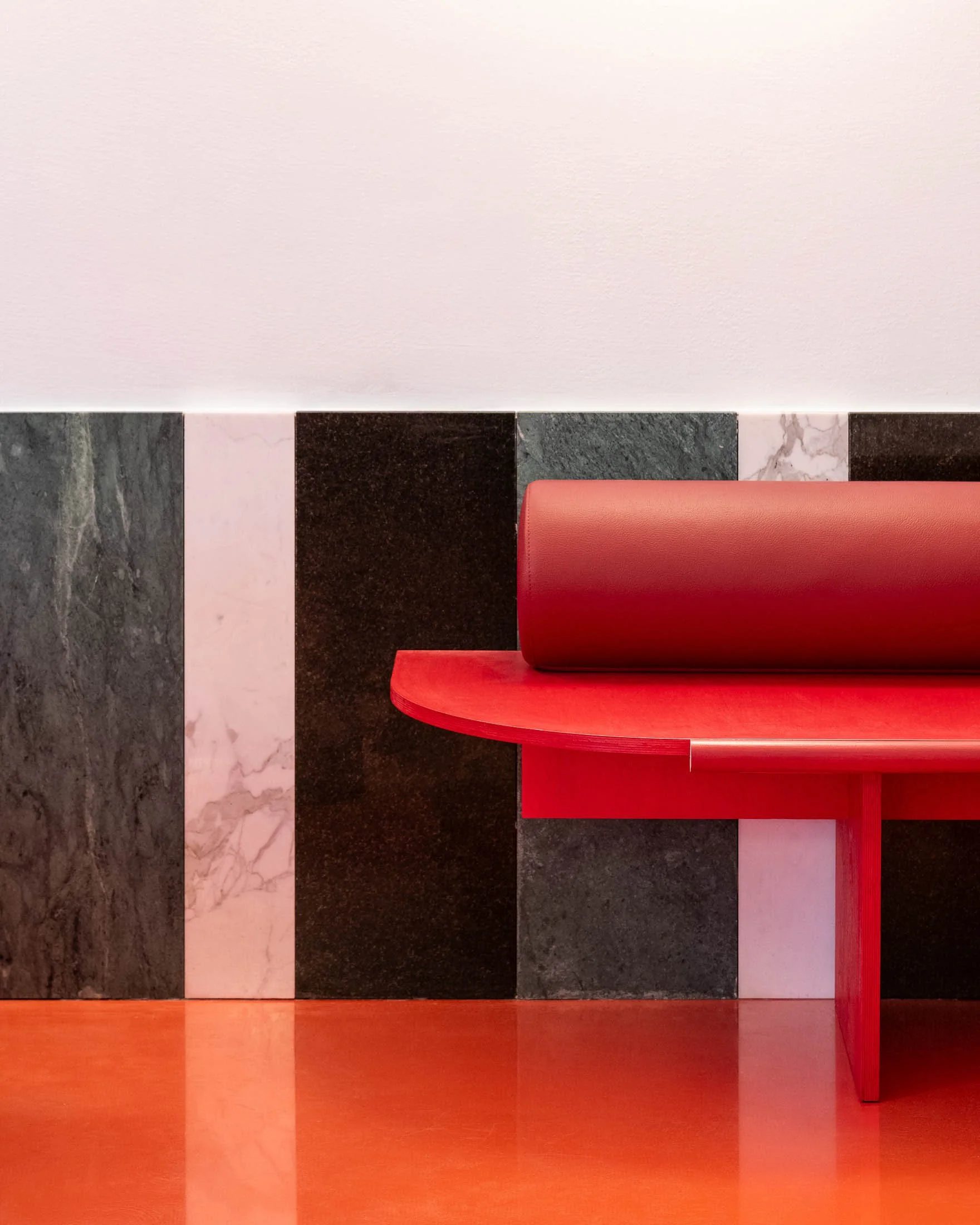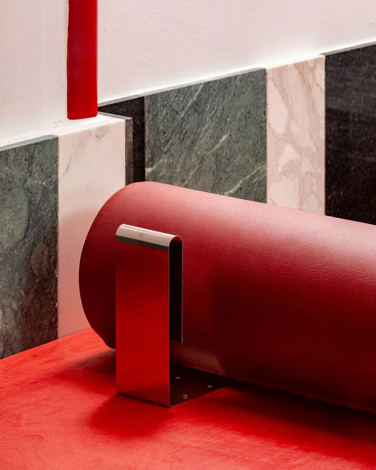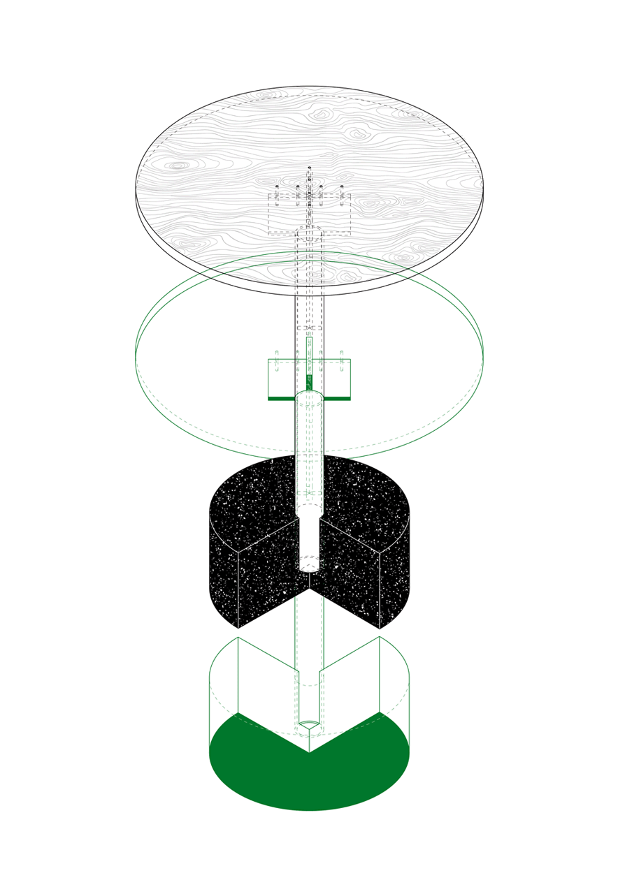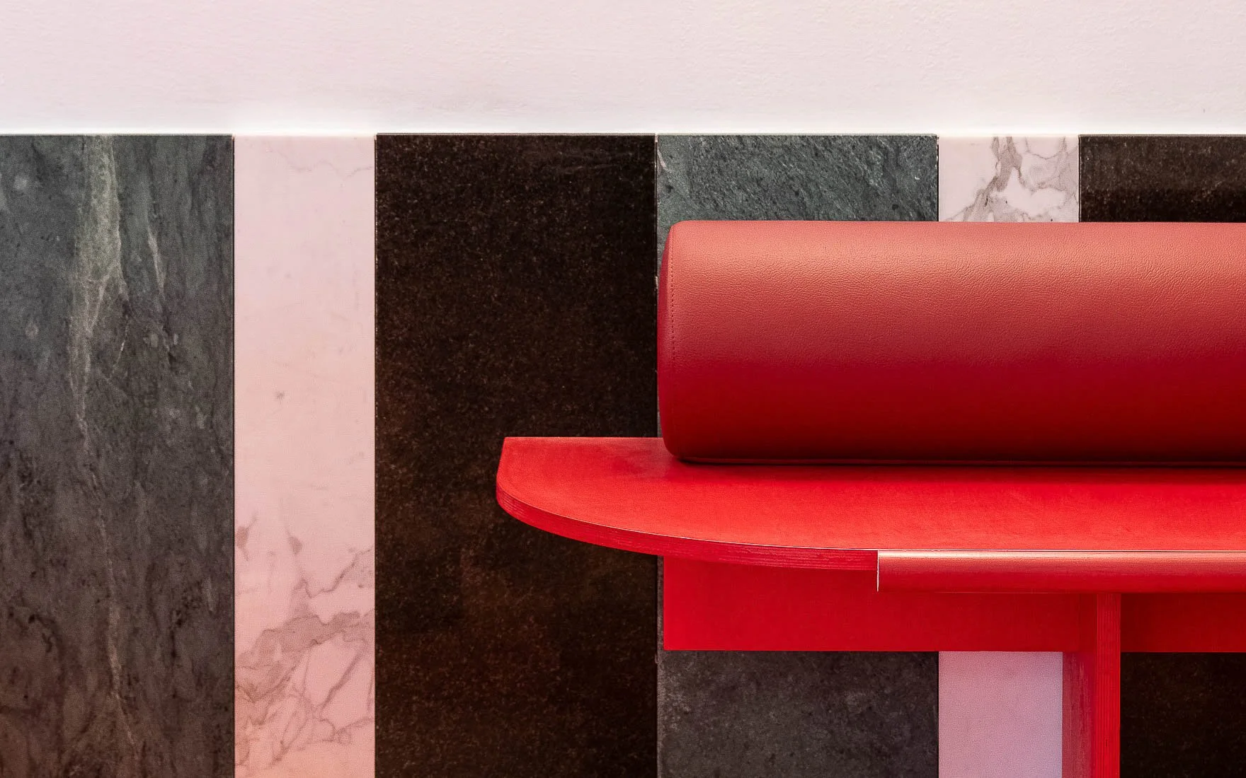 The green marble was leftover from one of the company’s trade show stands. Already cut to the size 30 × 90 cm, it set the design rhythm. In contrast, the black granite, originally a carrier for a higher-quality stone, and the white marble — a fragment left behind on its way to its intended destination, a jeweler in Doha.