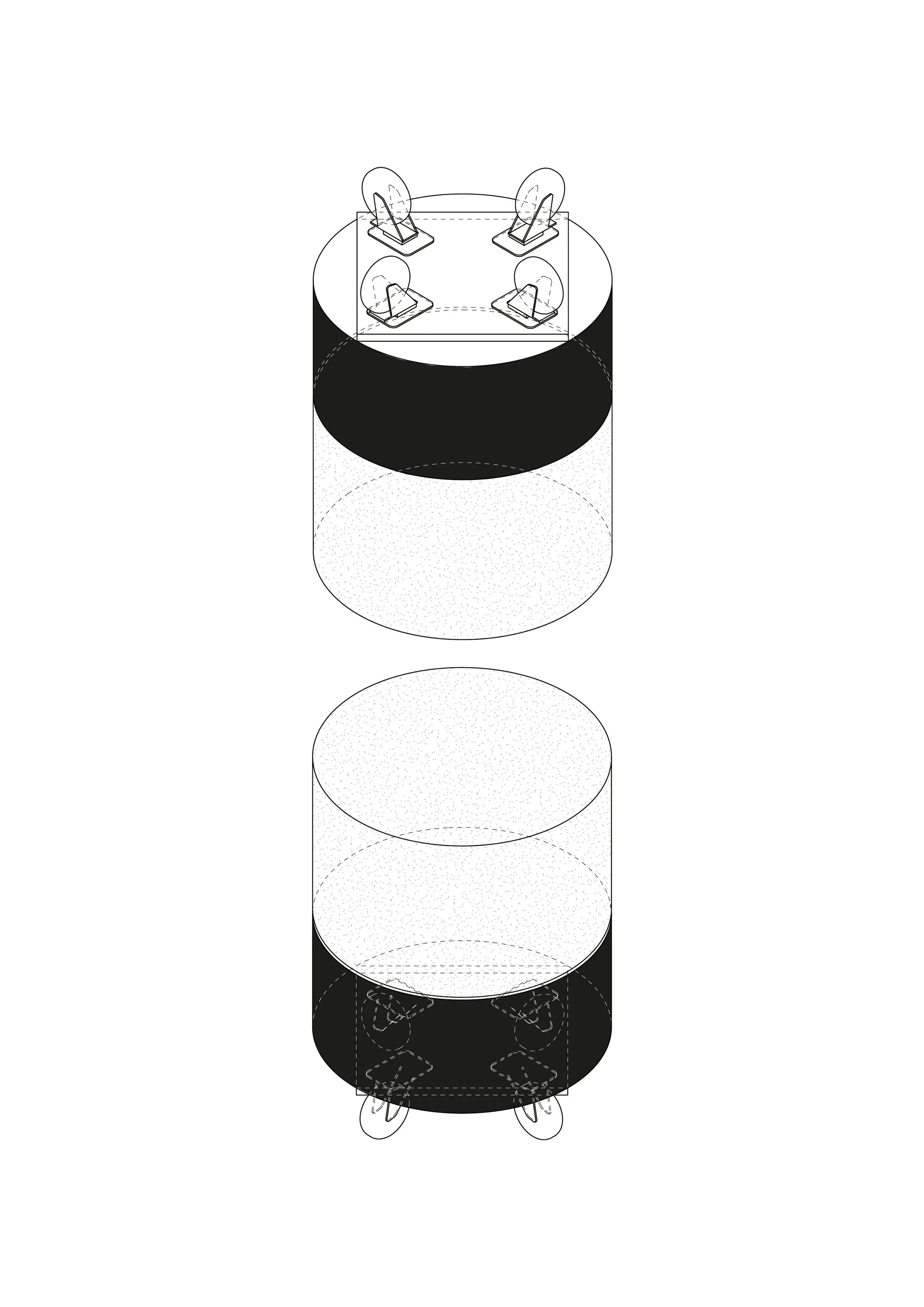 Among them, the stone cylinders — waste from the production of urns. A local specialty. In various proportions, colors, and segmentations, they were used as bases for tables and stools, as well as corner protection for the counter.