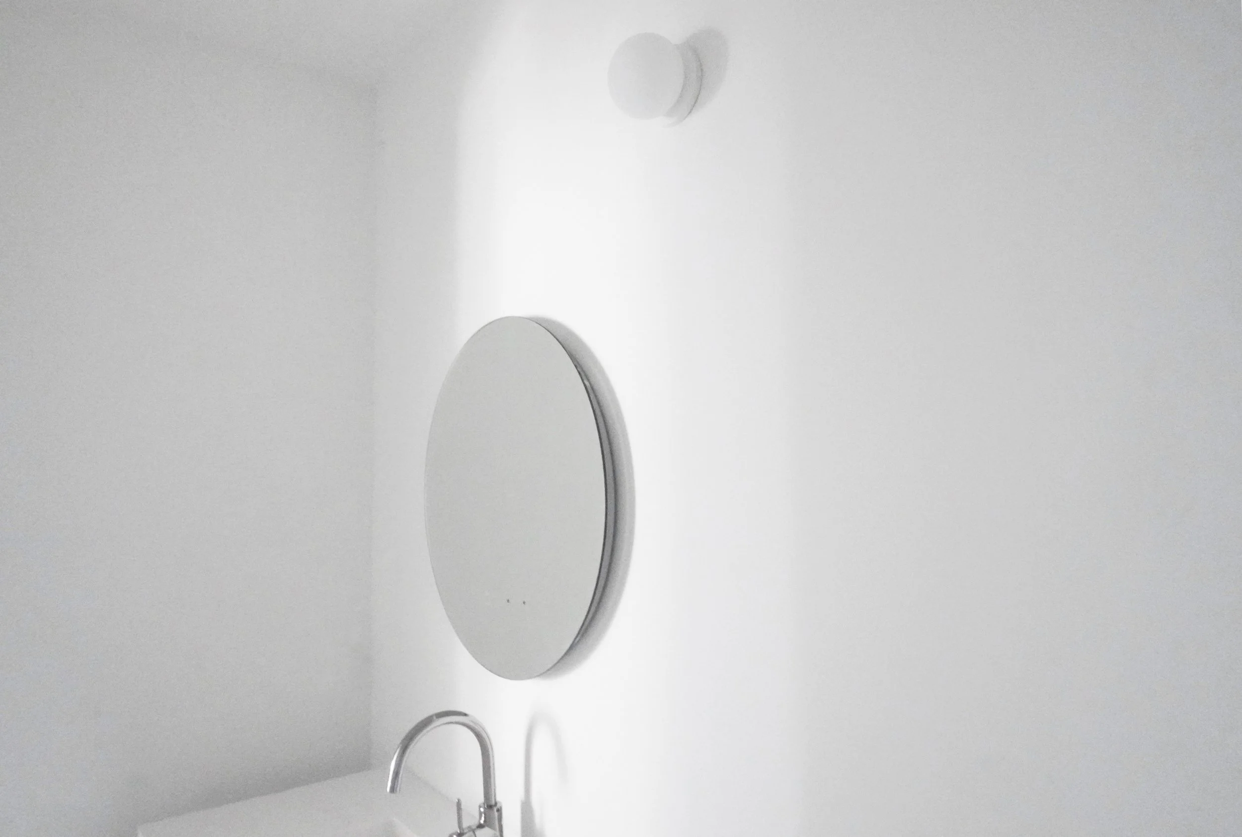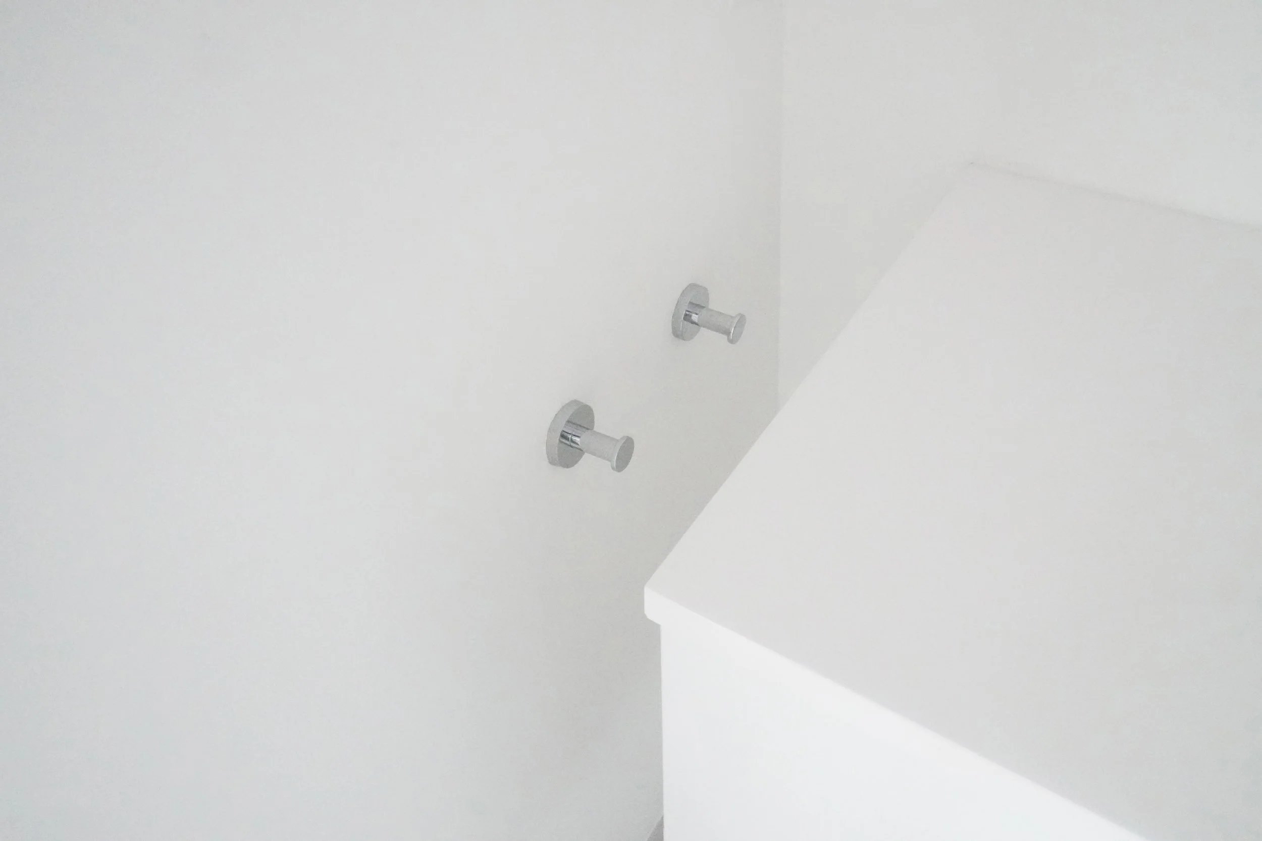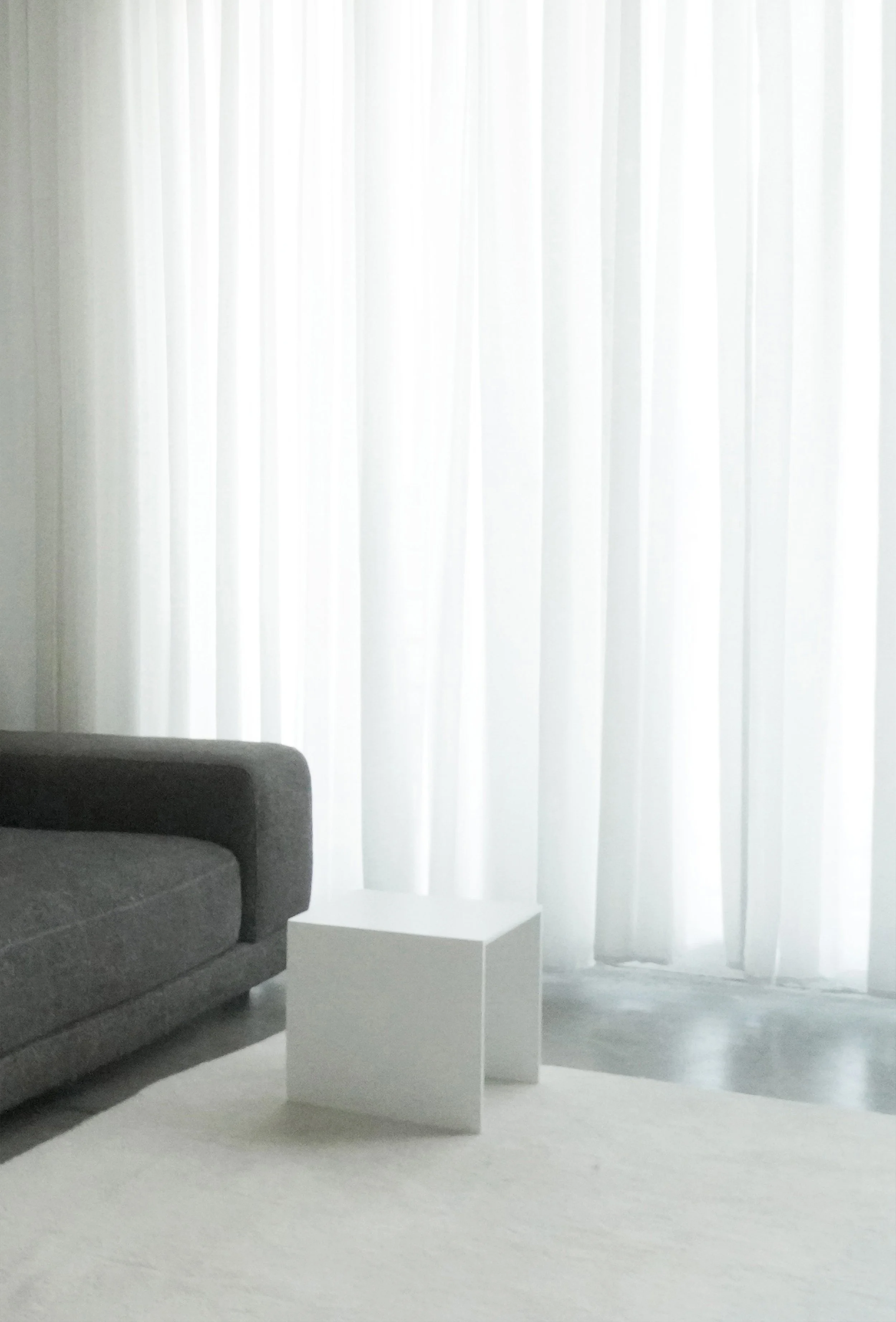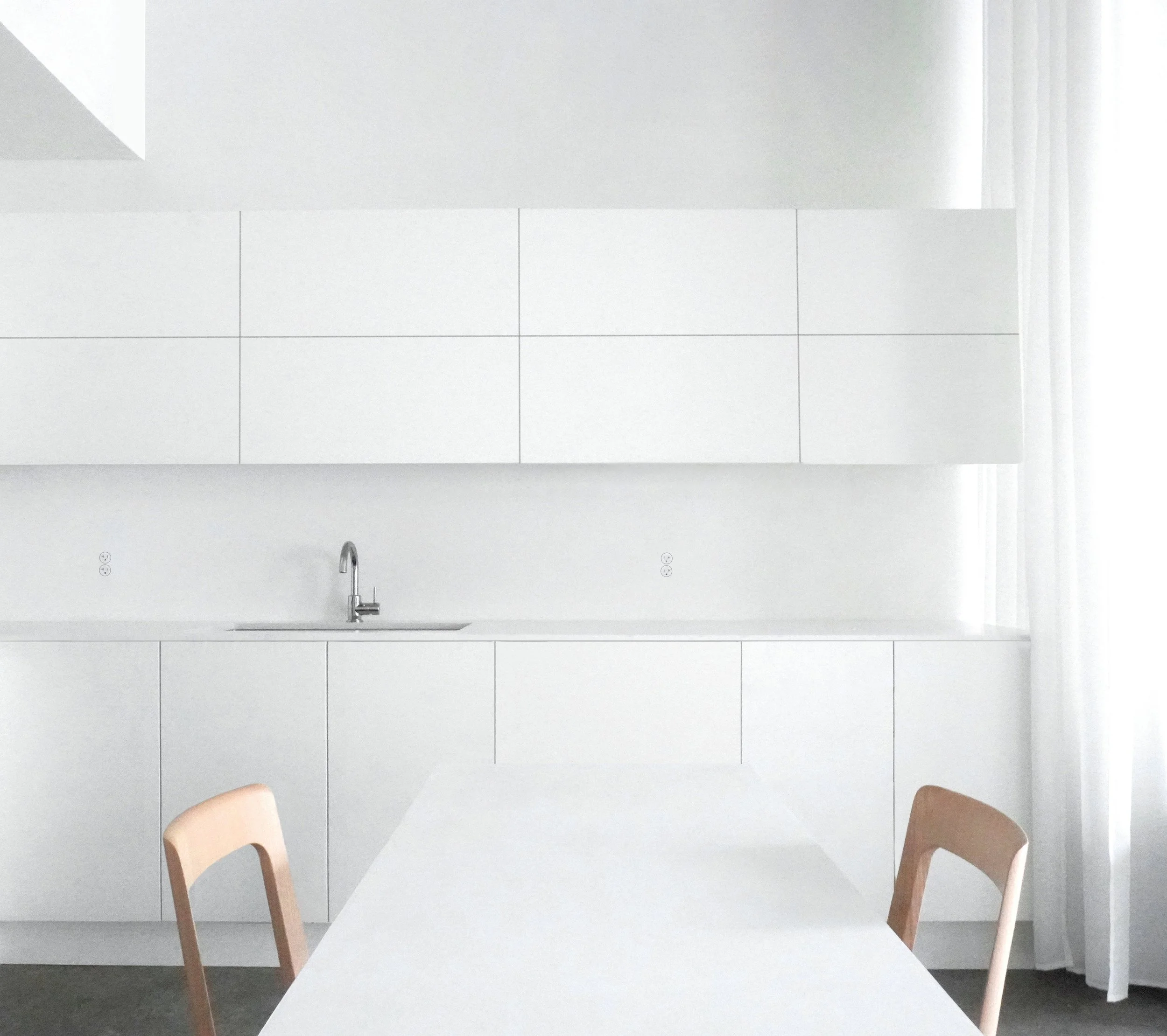 The aesthetic is defined by white accents and a rigorous reduction of detail. Doors are frameless, appearing as wall surfaces defined only by a seam. Walls meet the concrete floor directly, without floorboards or reveals. The kitchen is a composition of modules with no visible hardware, featuring a 0.75-inch-thick stone countertop aligned perfectly with the cabinetry.