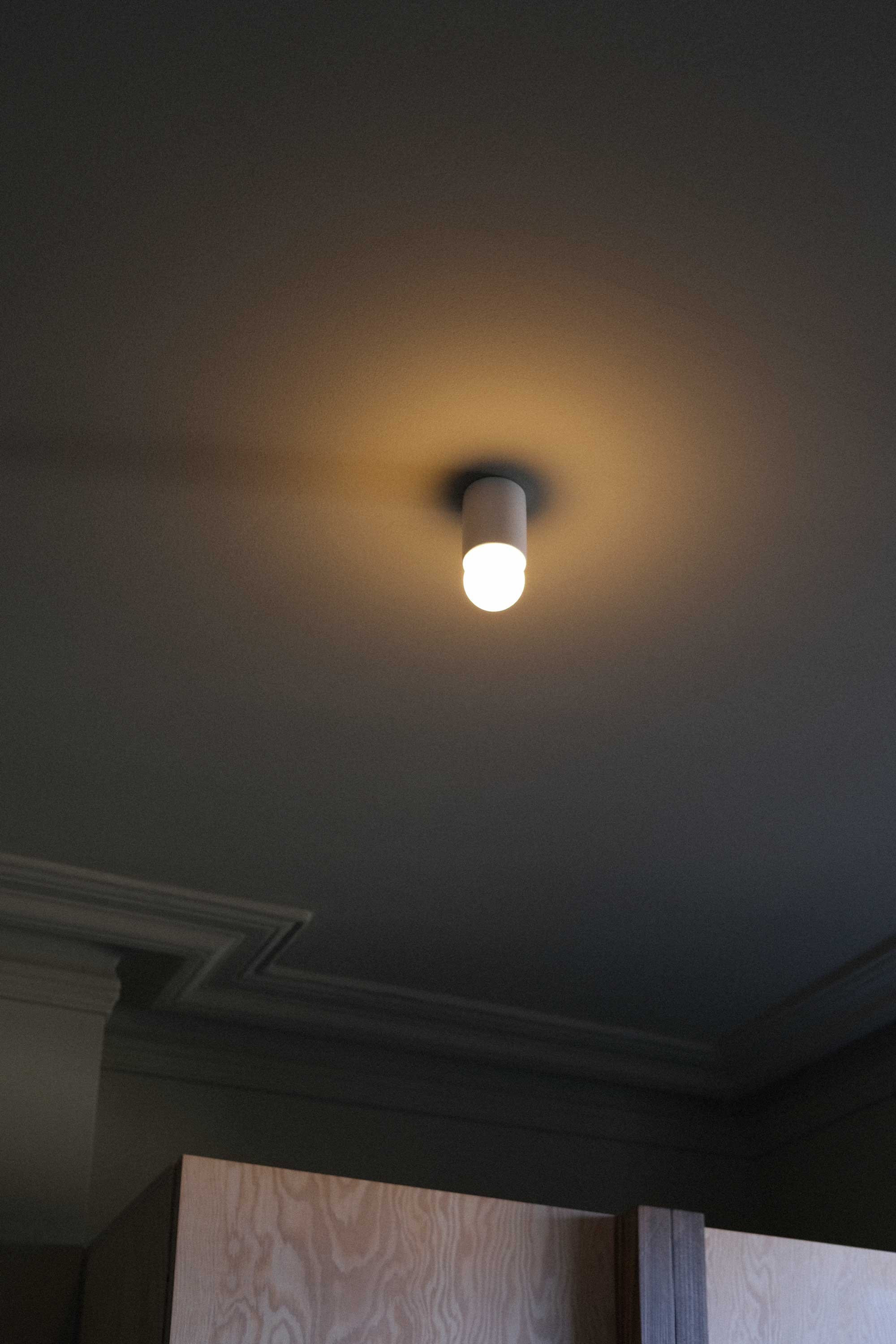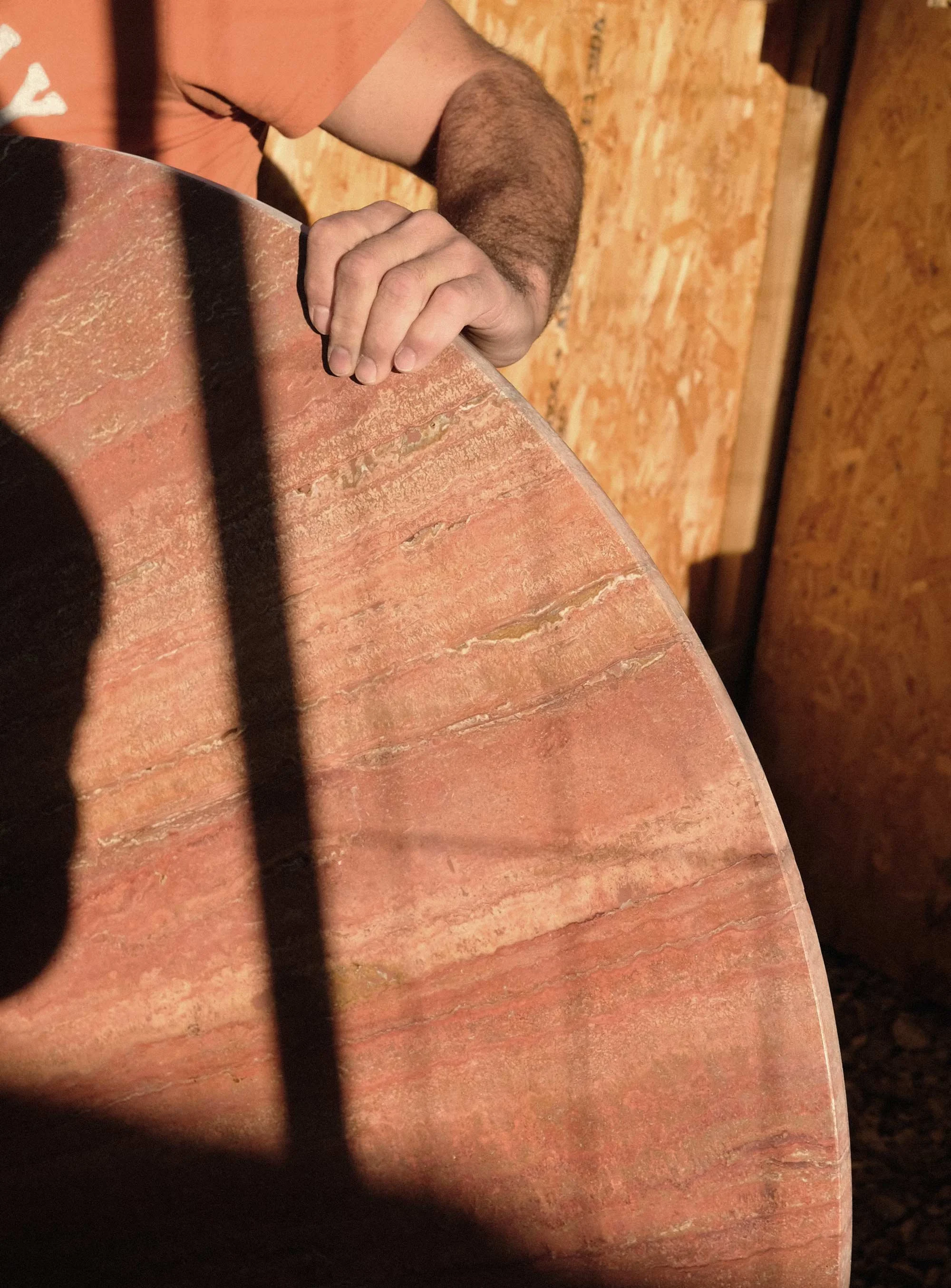 Most of the functionality of the kitchen is concealed within crosscut oak timber joinery. Bespoke curved sapele handles take inspiration from the peeling surface of a paperbark maple tree. A large half-column unit continues the circular motif, opening on flush hinges to reveal a larder.