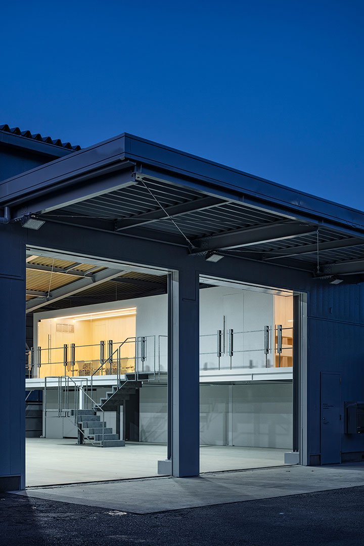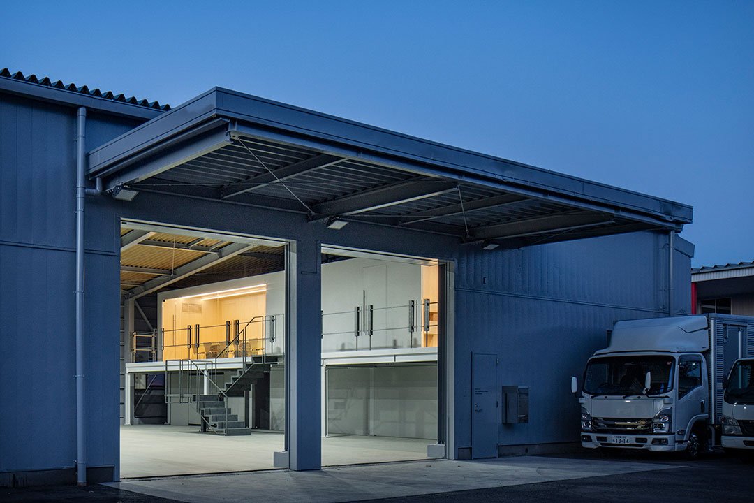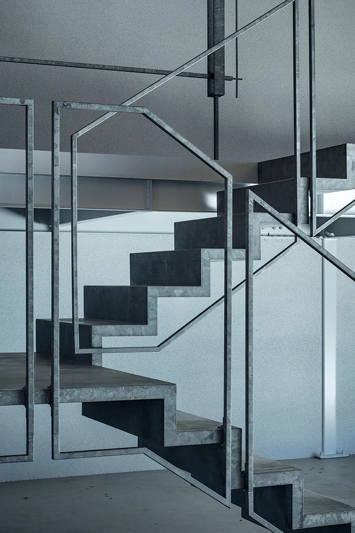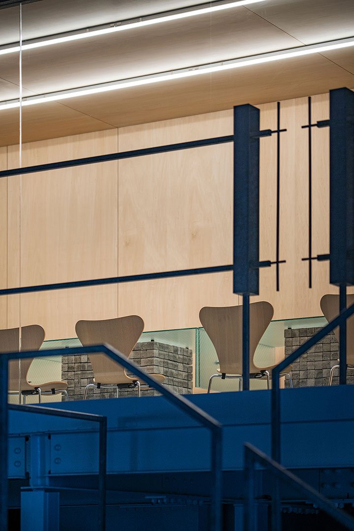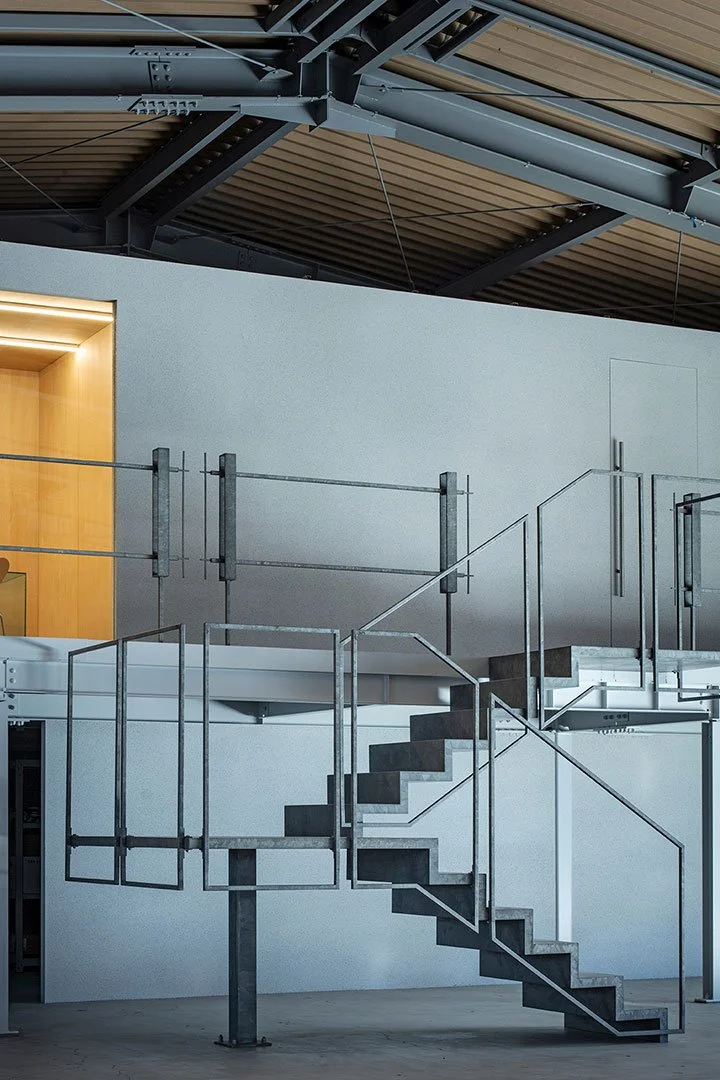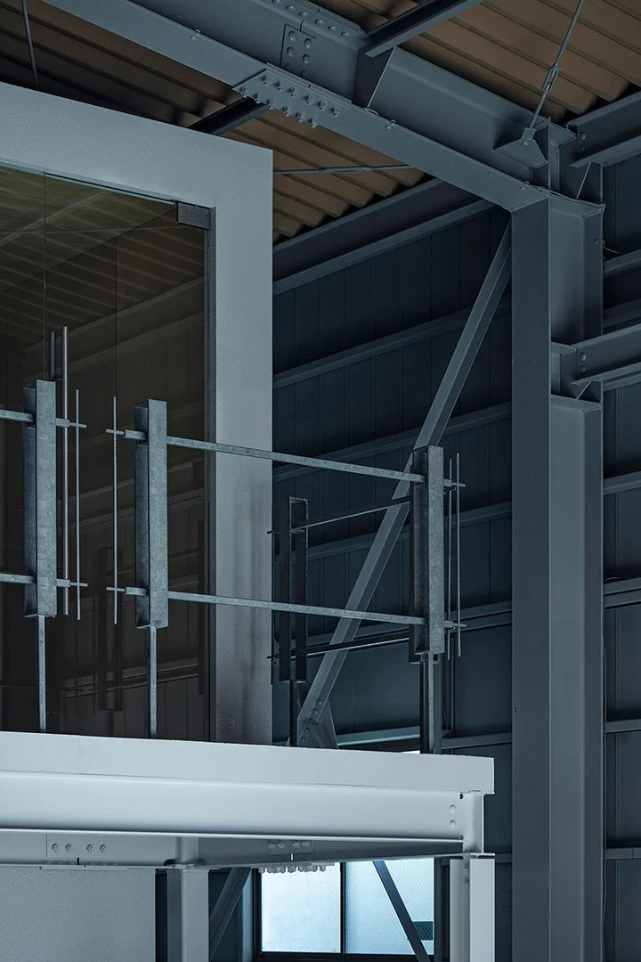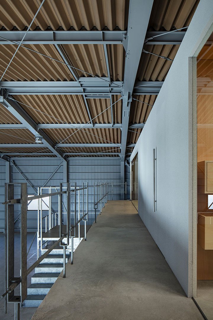 The railings on the second floor and the staircase were carefully designed so that their thickness and slender lines correspond with the steel frames and braces in the factory. Spaced at regular intervals, these elements frame the simple structure of the office.