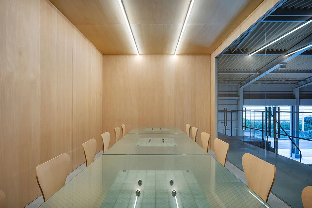 The president’s office and meeting room are enclosed in glass, making them visible within the space. Their walls and ceilings are finished in wood, adding warmth to the grey-toned factory interior, while distinctive tables and shelving draw visitors’ attention to the second floor.