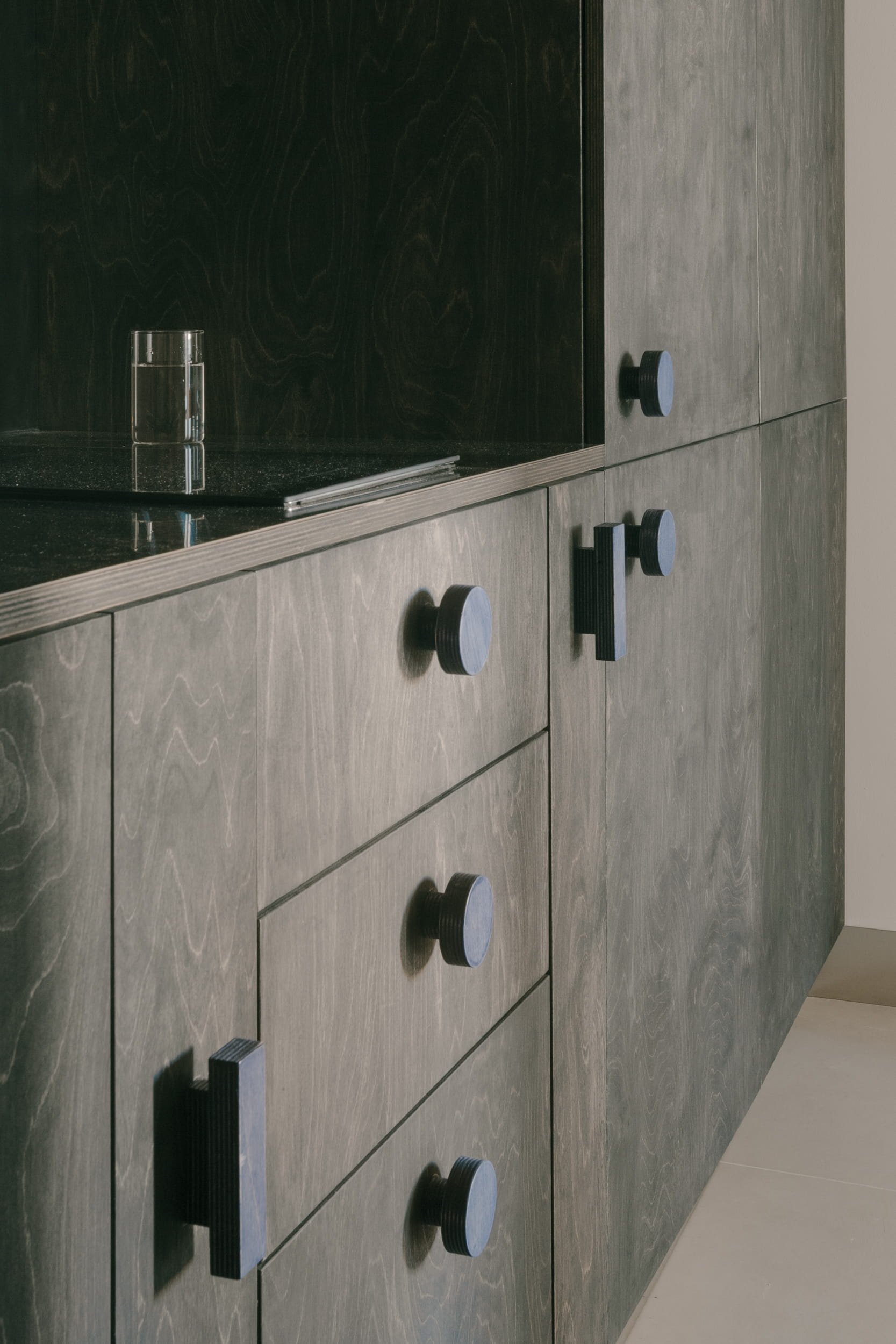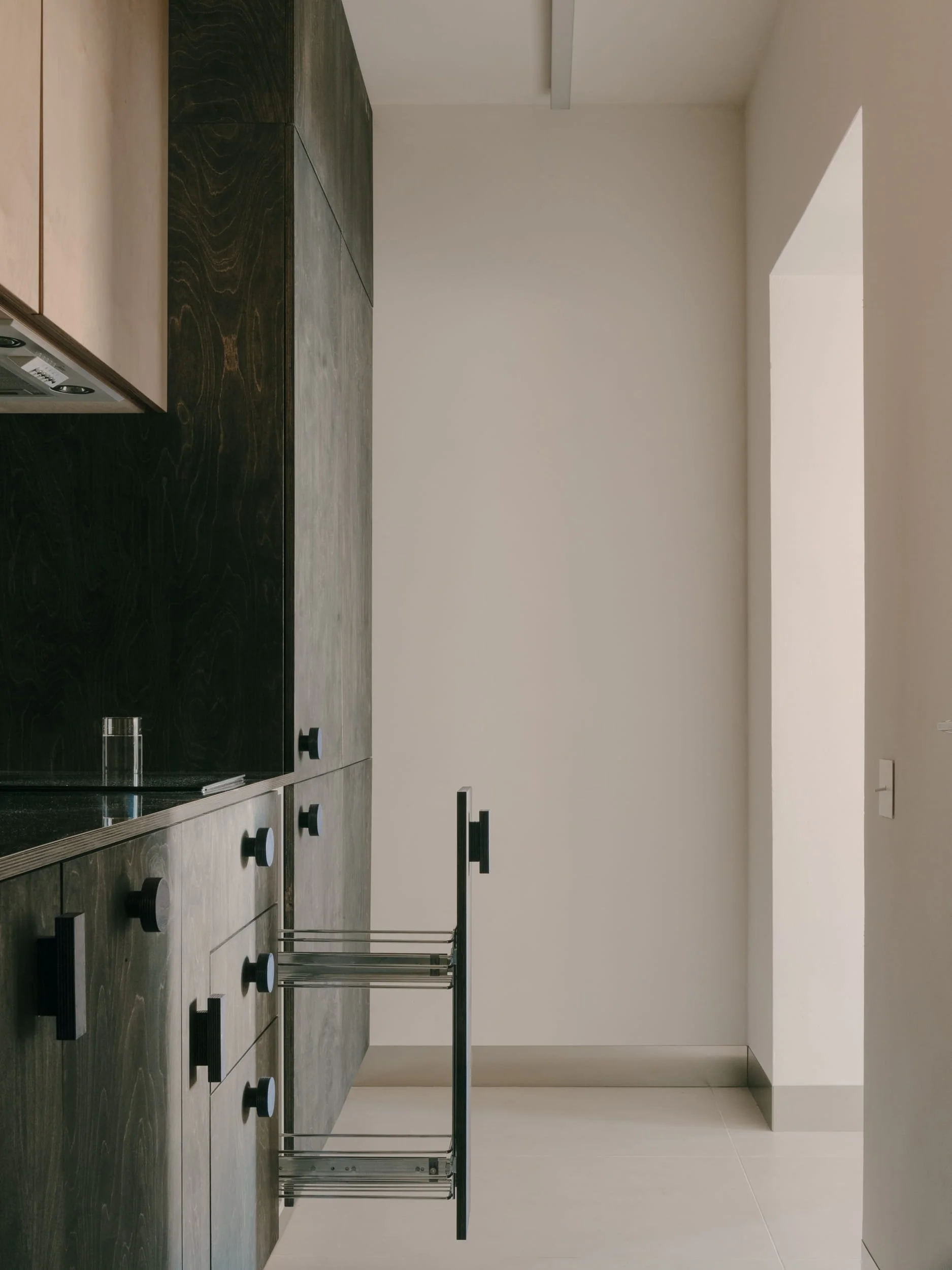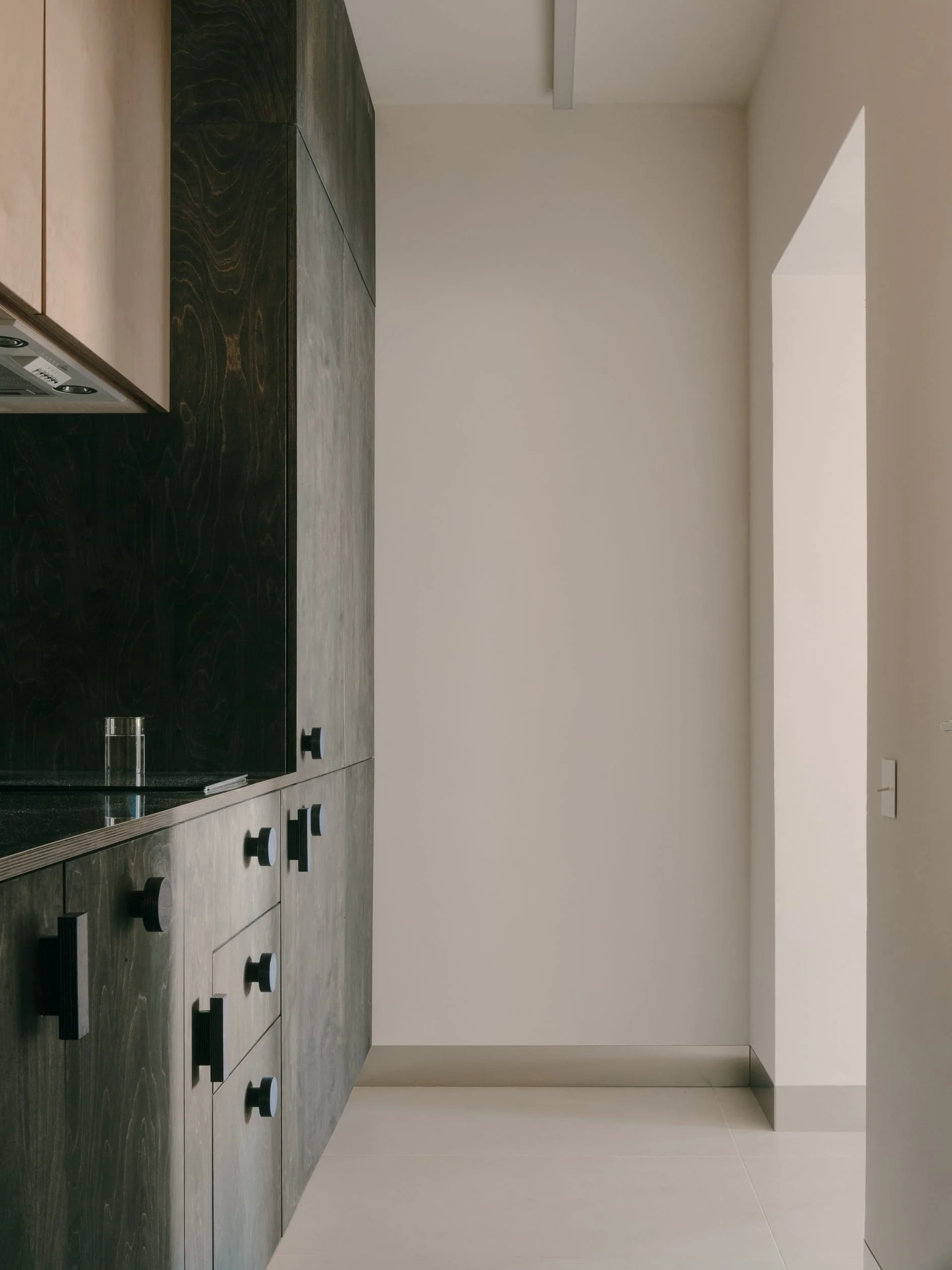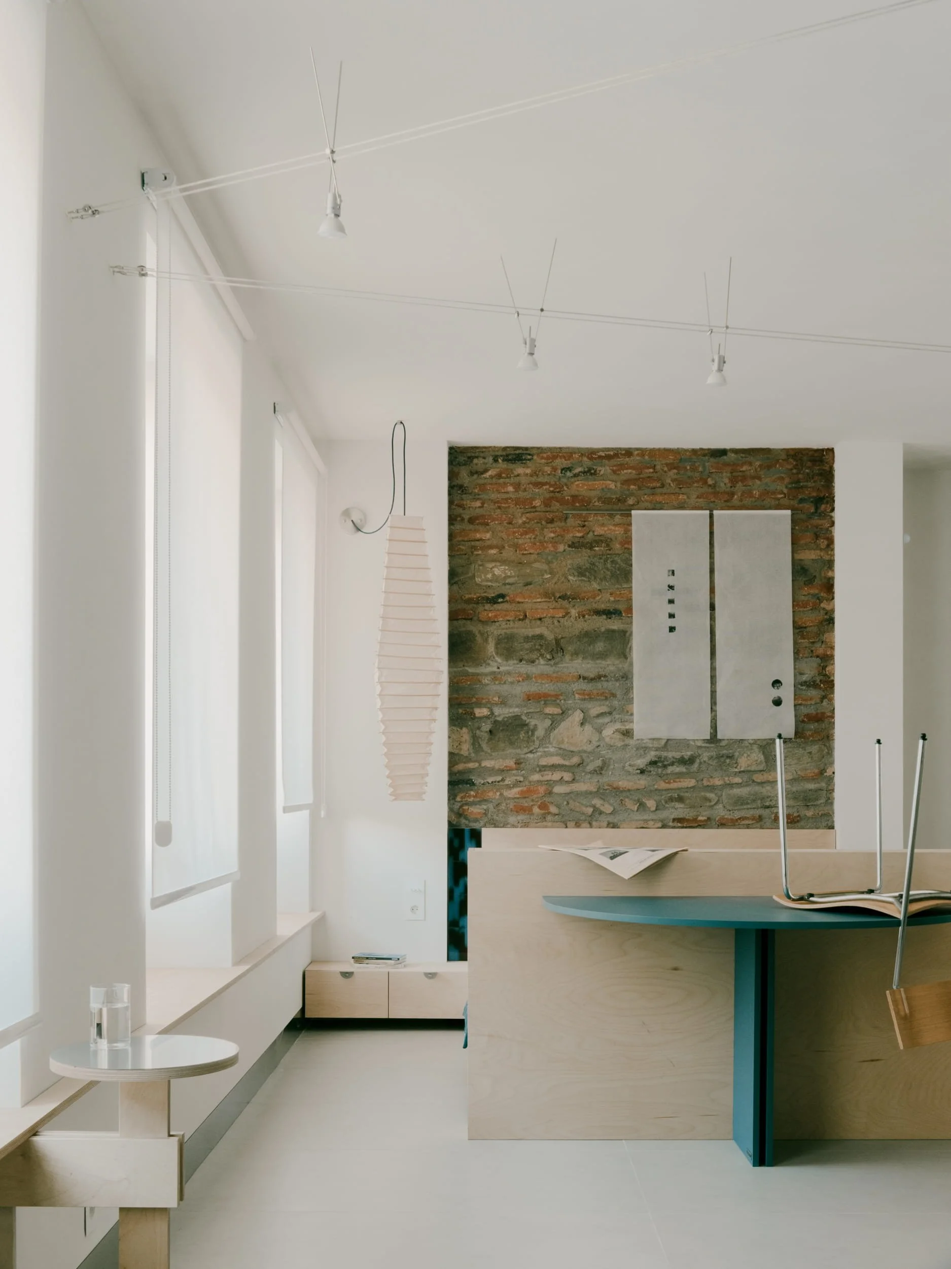 The interior is conceived around a restrained material palette, centered almost exclusively on plywood. The material is explored through variations in form, texture, and tone. This approach creates a sense of continuity while demonstrating the material’s adaptability and expressive potential. With a compact footprint of just 38 square meters, the apartment is organized as an open-plan interior that feels spatially generous and highly functional. Rather than treating size as a limitation, the design uses clarity of layout and precision of detailing to accommodate the full spectrum of everyday activities without compromise. Custom-built furniture defines distinct zones for resting, dining, hosting friends, or quietly reading, allowing the apartment to adapt seamlessly to different rhythms of daily life. Each piece is designed specifically for its location, often serving multiple functions at once—seating, storage —allowing the apartment to remain flexible and efficient. The blue table adds a subtle color contrast to the otherwise neutral interior. Placed at the center of the space, it functions as both a working surface and a visual anchor in the room. The blue used for the table is repeated in smaller details throughout the interior, such as the cabinet handles and the tile detail near the bed. This repetition creates a subtle connection between different elements of the space. Used sparingly, it helps tie the space together without dominating the material palette. The use of blue goes beyond visual accent and extends into the tactile qualities of the interior. It is experienced through touch in multiple ways: the plywood handles, the smooth table surface, and the hand-sewn knitted bed cover. These elements introduce varied textures while remaining connected through a shared color - each offer a distinct tactile quality, adding another layer to how the space is used and felt.